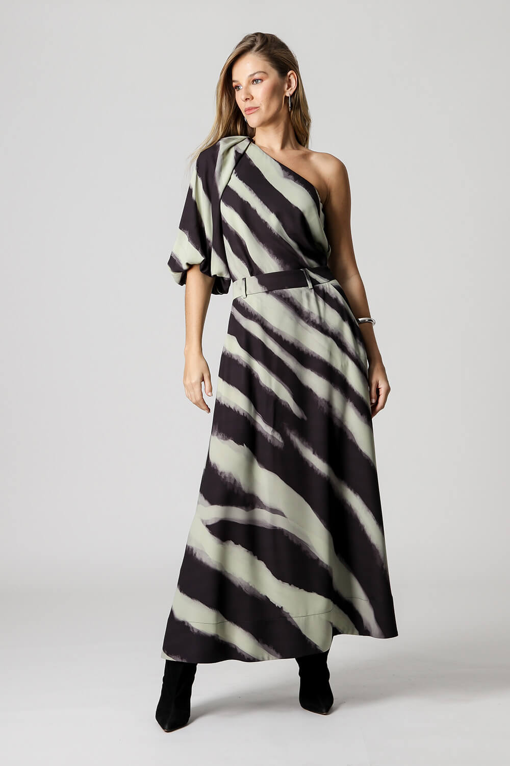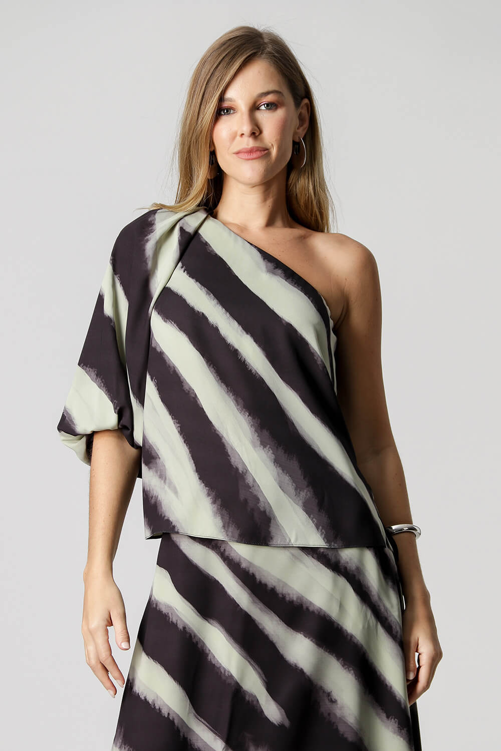Blusa de un solo hombro, mangas abullonadas. Modelo único con estampado exclusivo para que luzcas tu look casual.