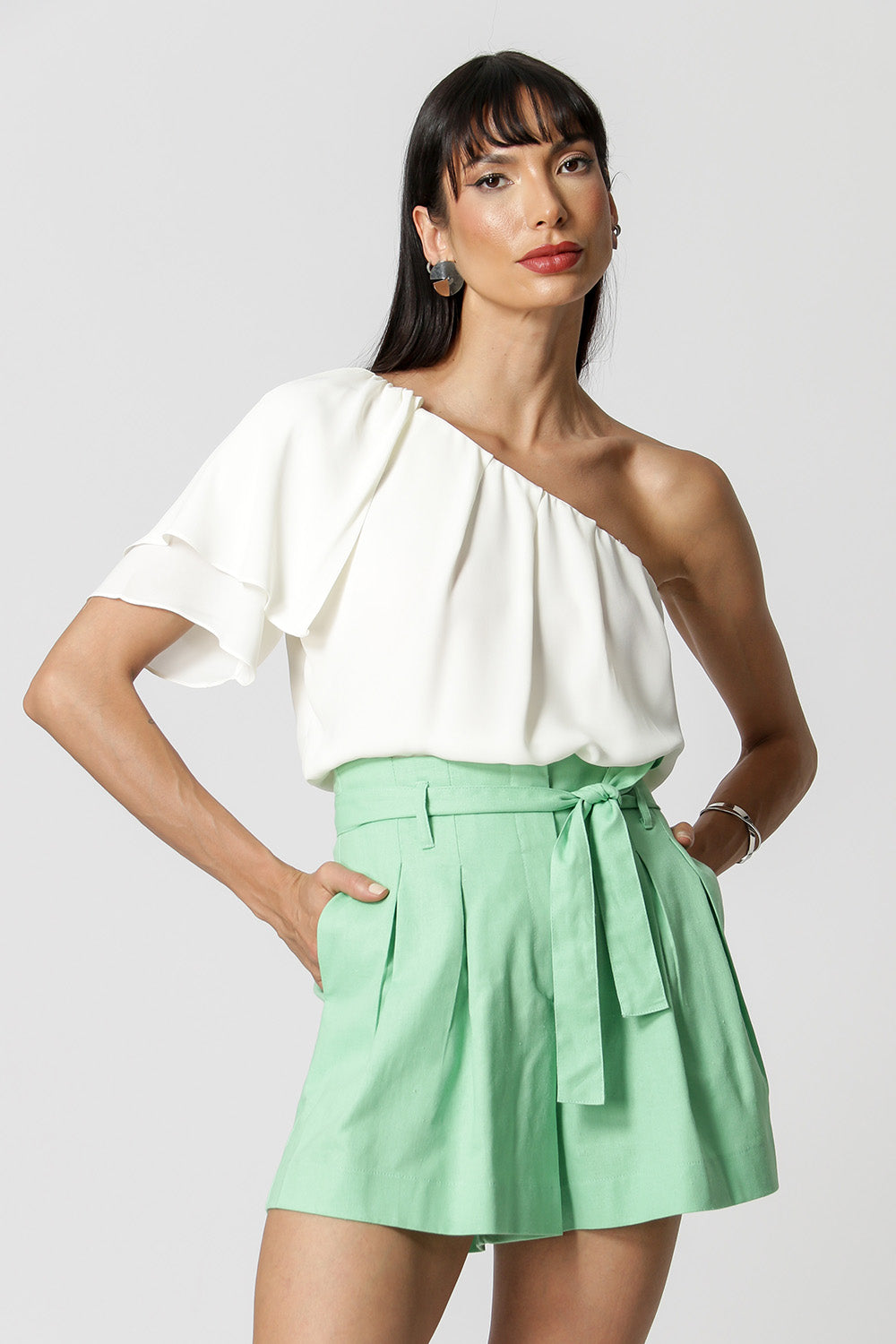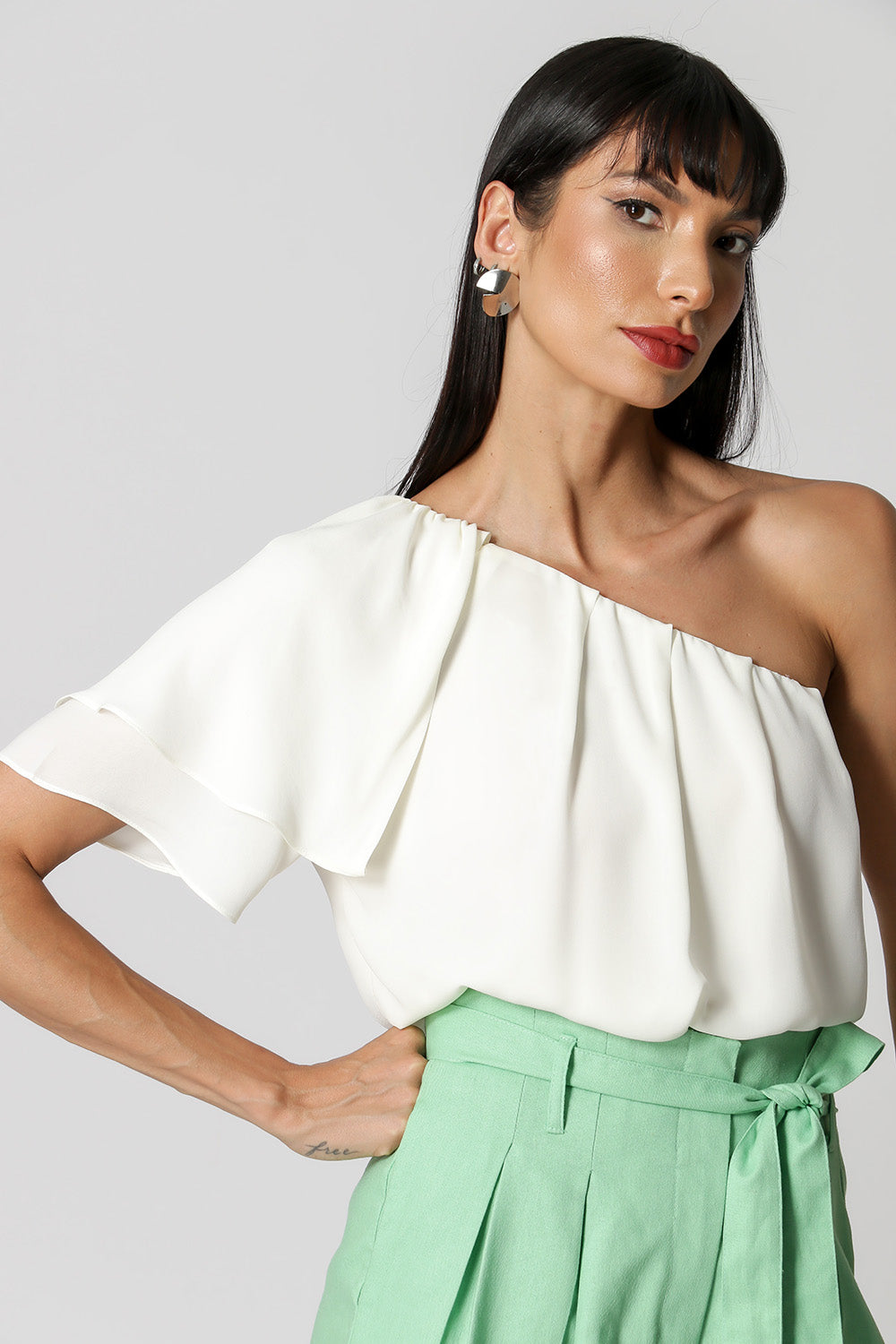 Blusa de un solo hombro con detalle de volante en doble manga. Fabricado en tejido crepé fluido. Un modelo delicado de corte ligero y perfecto para un ambiente de trabajo.