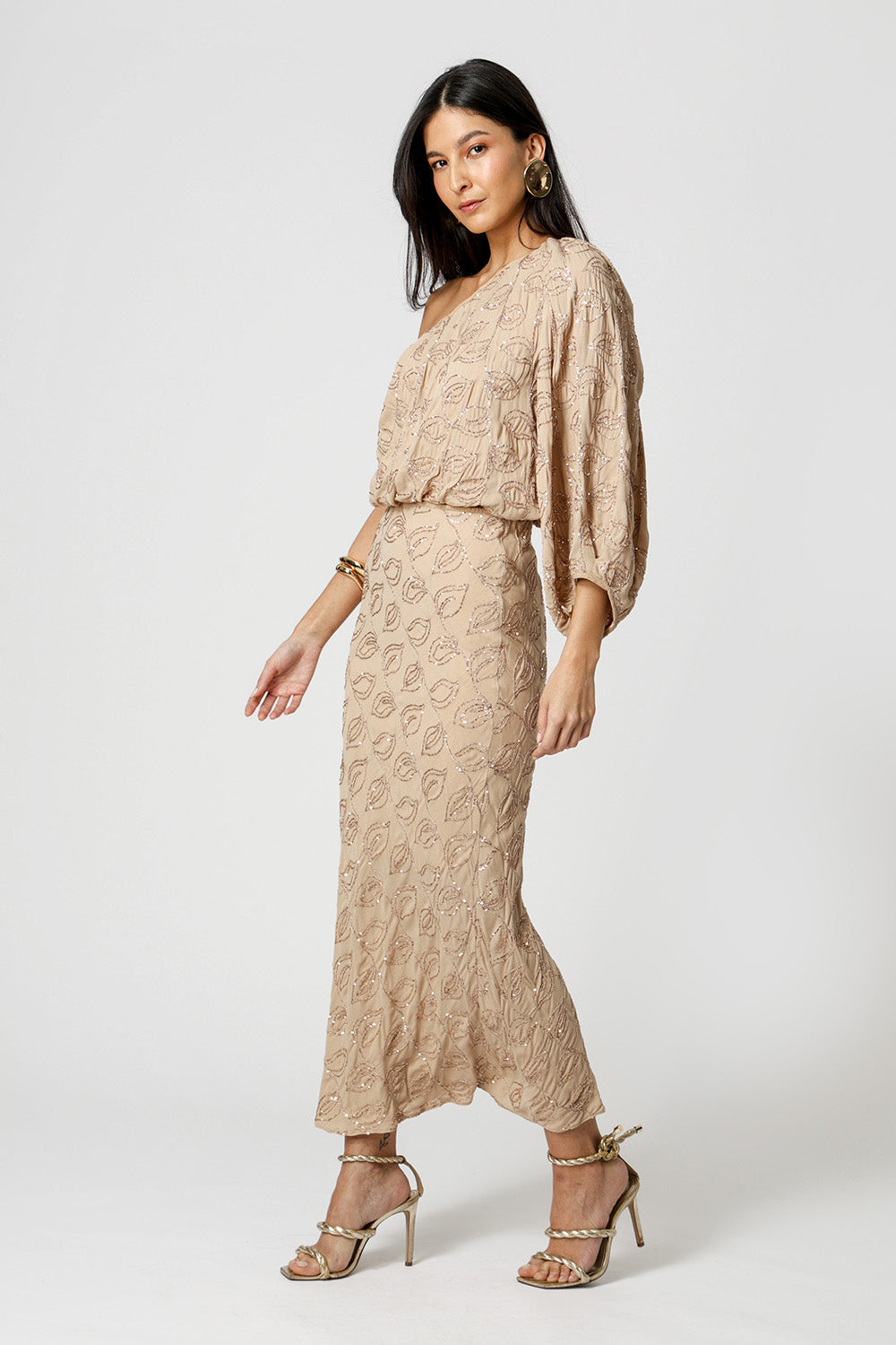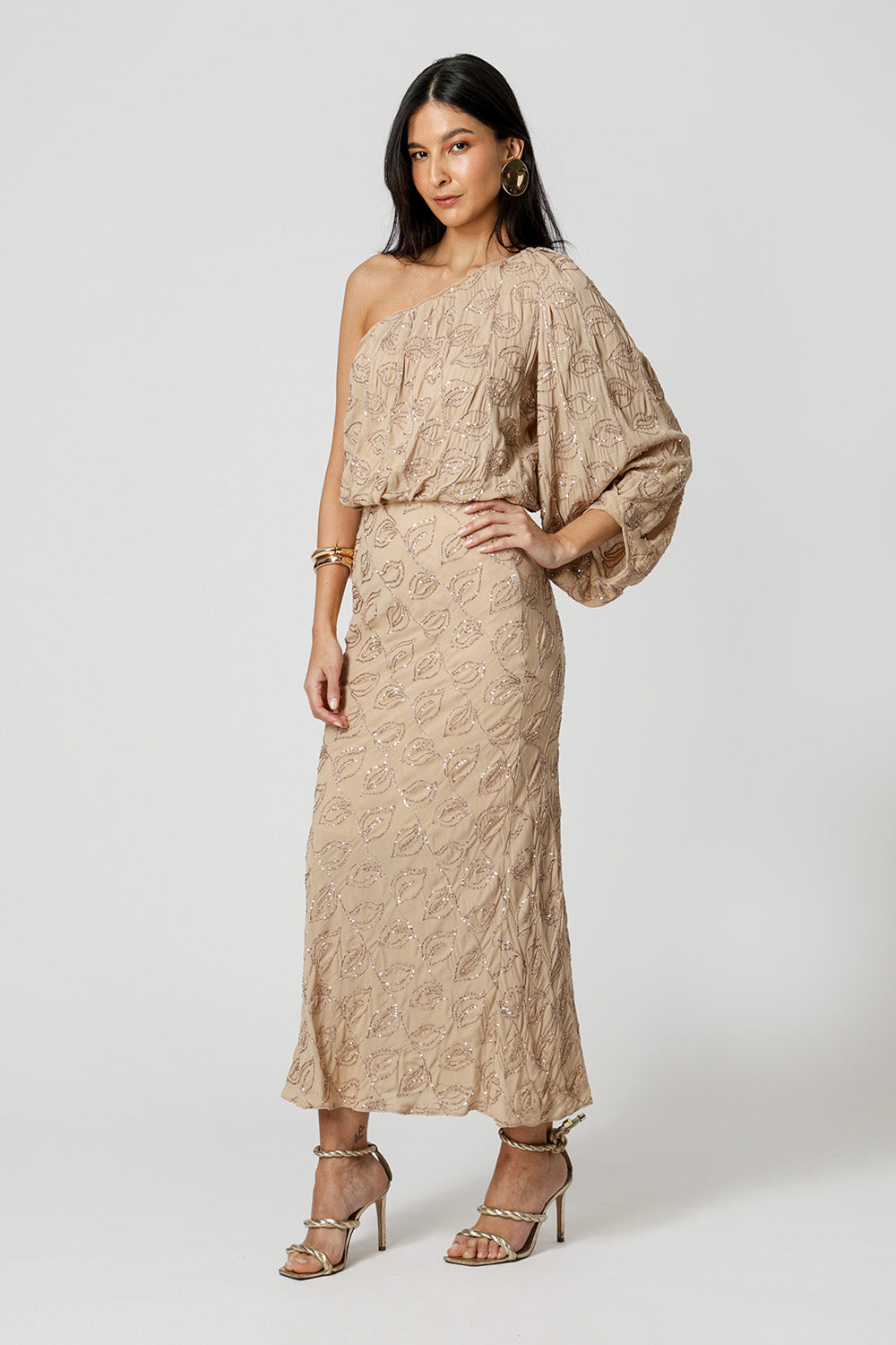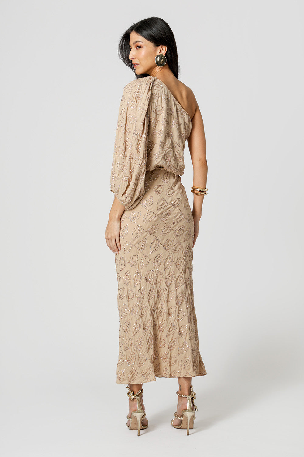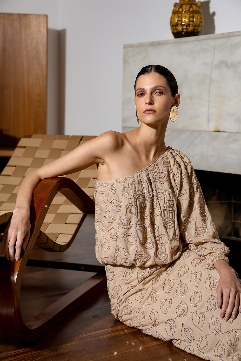 Blusa de ombro único com manga longa volumosa, em tecido bordado com paetês em desenho de folhas. Brilho elegante e modelagem blusada para um visual impactante e sofisticado.