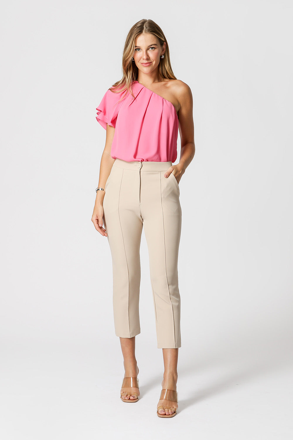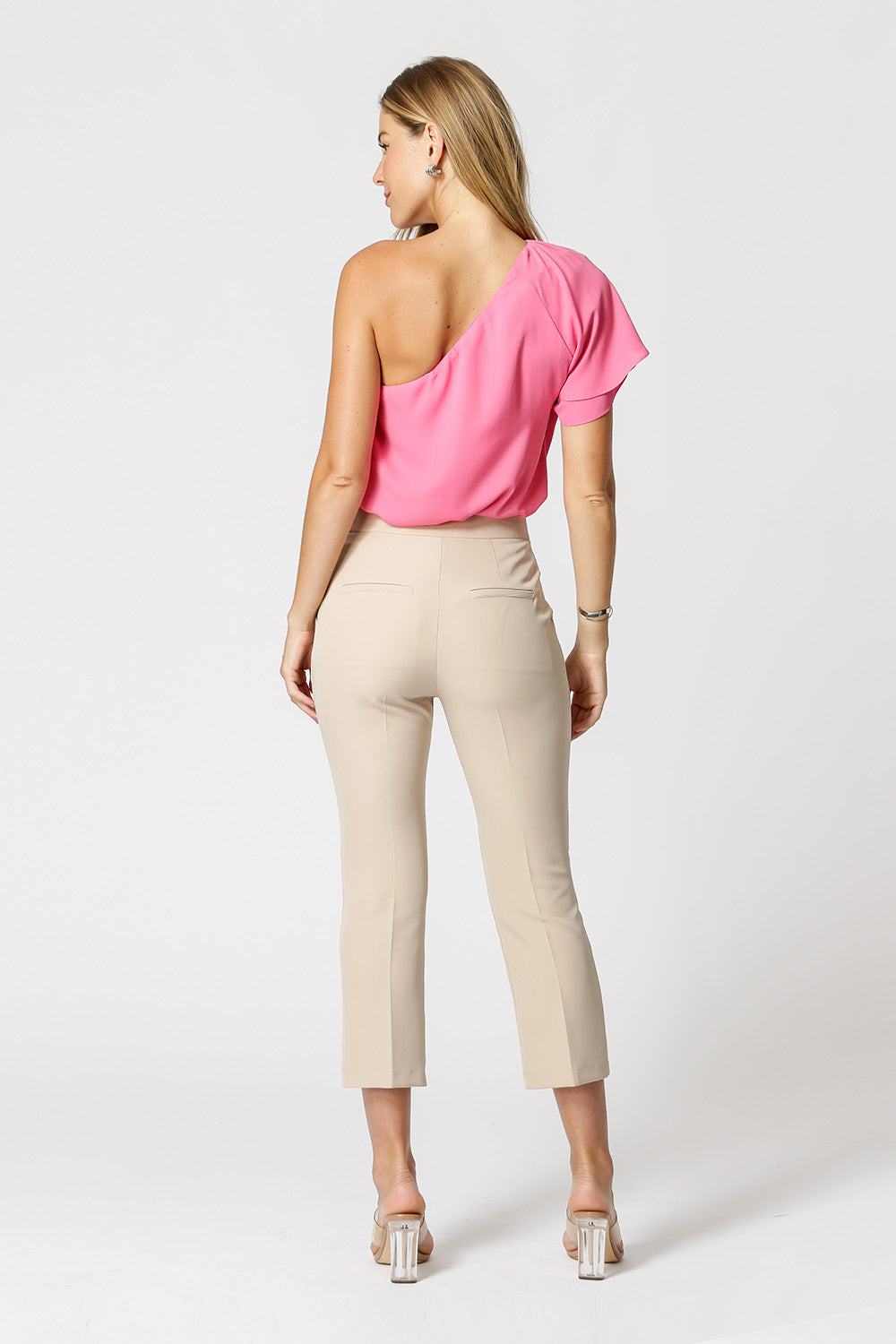 Blusa de un solo hombro con detalle de volante en doble manga. Fabricado en tejido crepé fluido. Un modelo delicado de corte ligero y perfecto para un ambiente de trabajo.