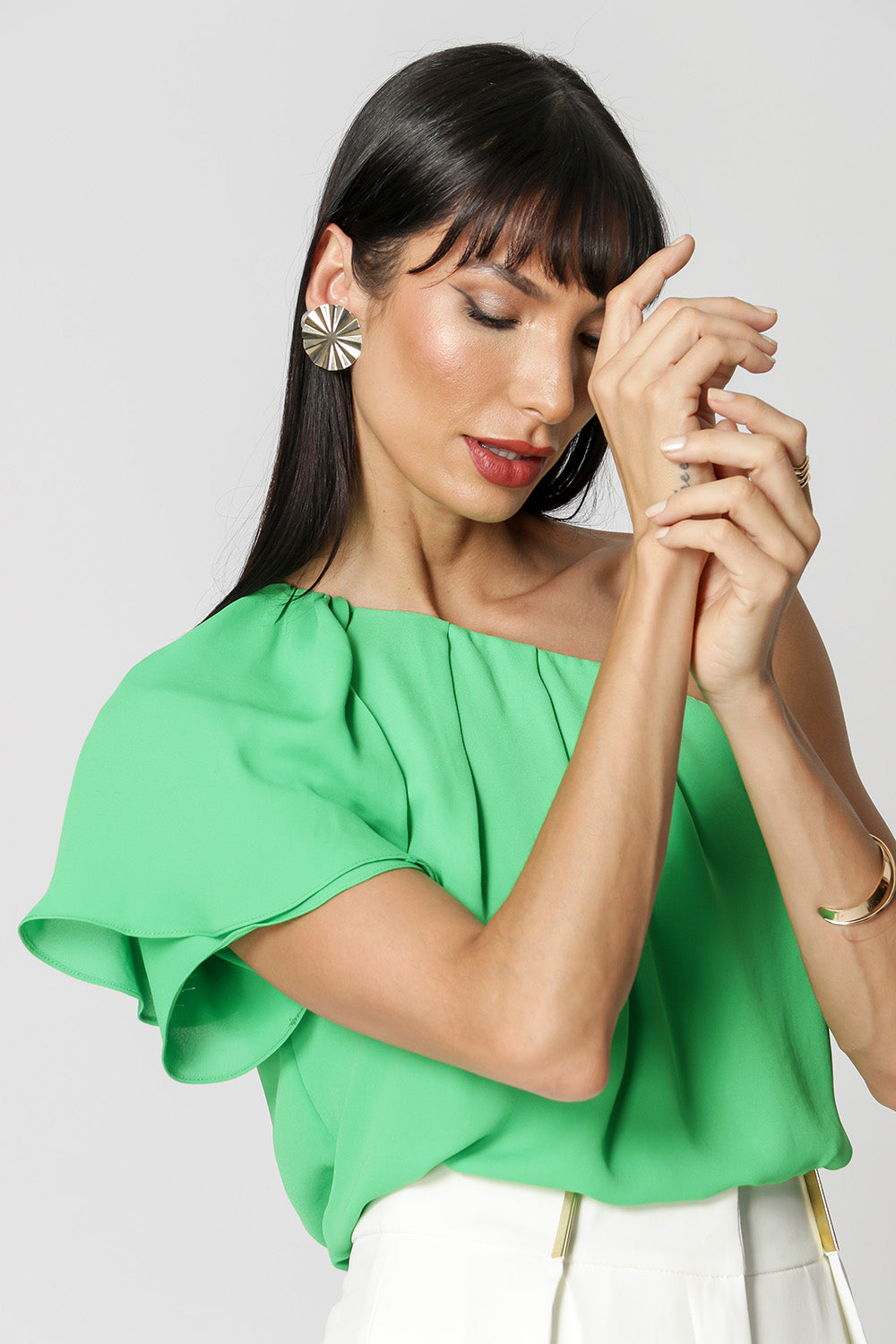Blusa de un solo hombro con detalle de volante en doble manga. Fabricado en tejido crepé fluido. Un modelo delicado de corte ligero y perfecto para un ambiente de trabajo.
