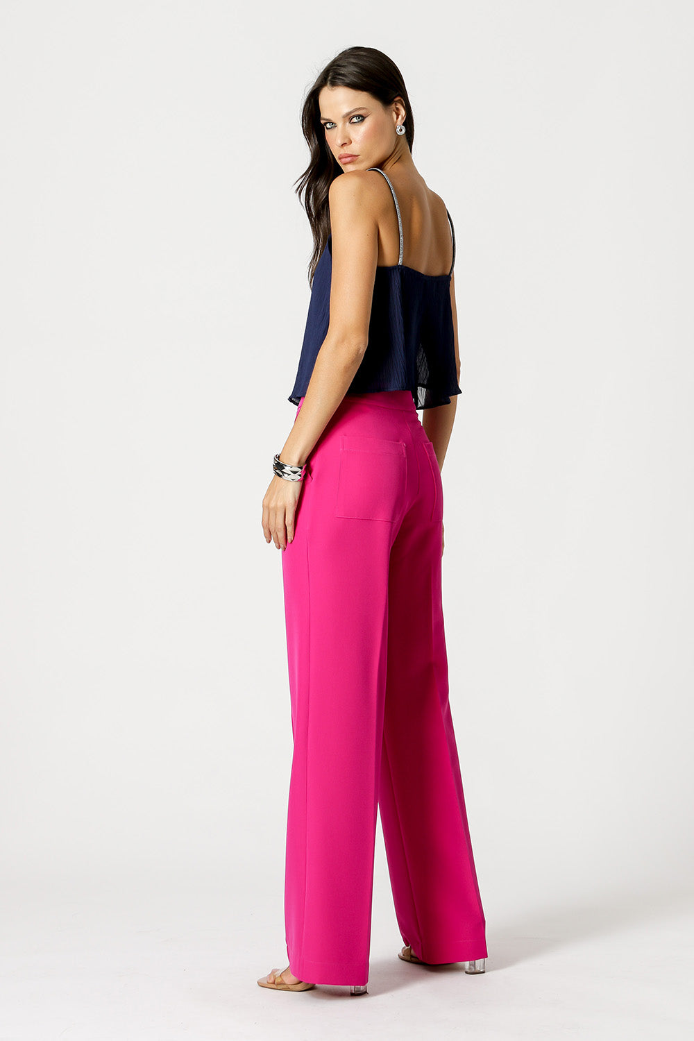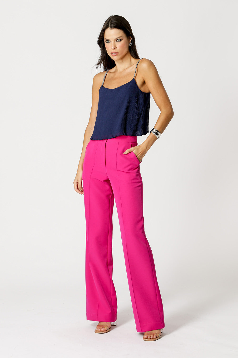 Camiseta de tirantes con detalle de pedrería en el tirante. Realizado en tejido plisado con ligera transparencia y revelación interior. Un modelo de corte ligero, cómodo y lleno de encanto para ocasiones especiales.