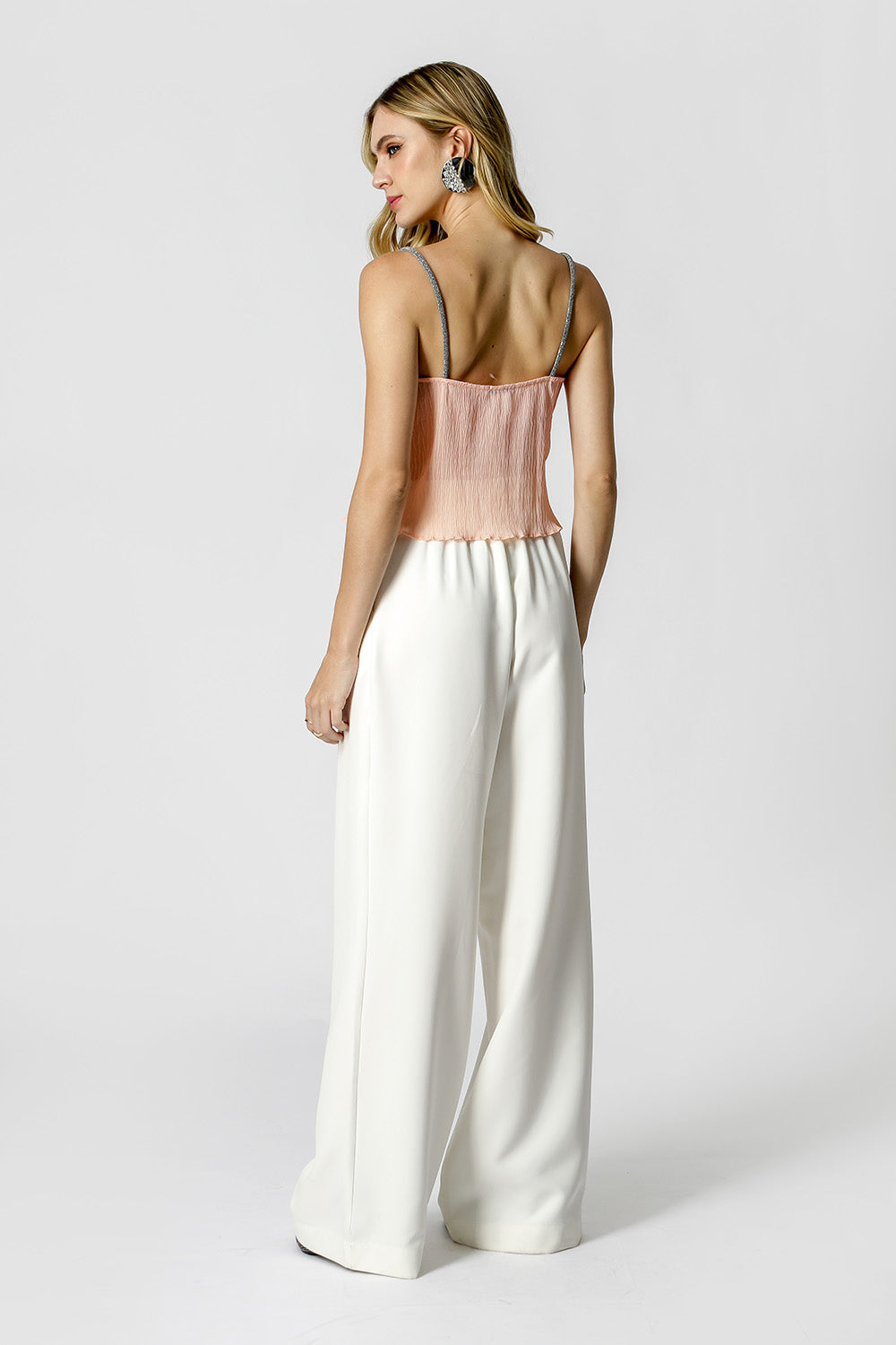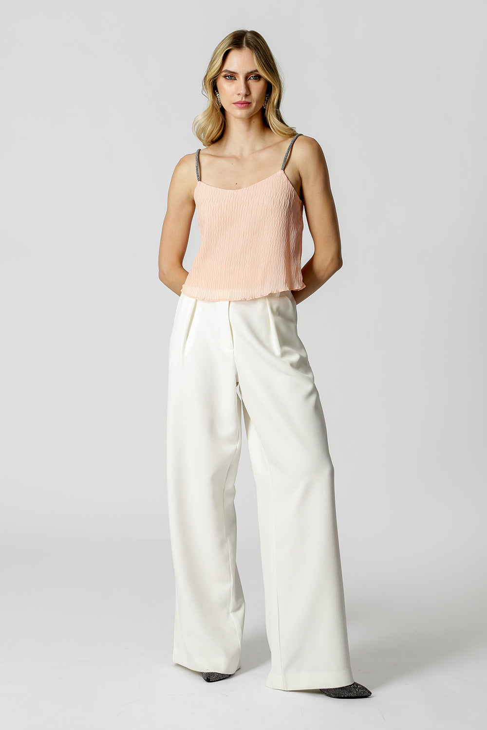 Camiseta de tirantes con detalle de pedrería en el tirante. Realizado en tejido plisado con ligera transparencia y revelación interior. Un modelo de corte ligero, cómodo y lleno de encanto para ocasiones especiales.