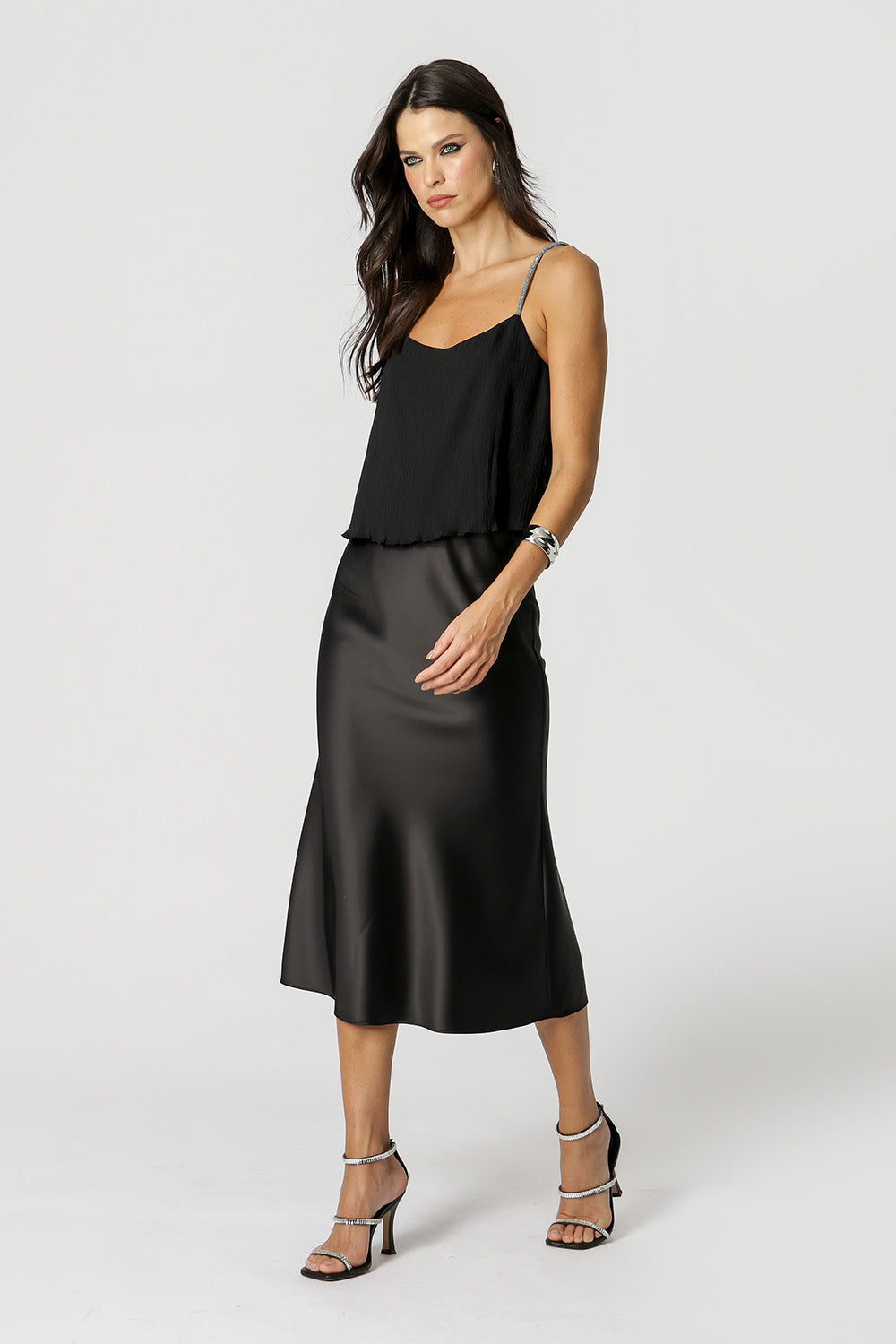 Camiseta de tirantes con detalle de pedrería en el tirante. Realizado en tejido plisado con ligera transparencia y revelación interior. Un modelo de corte ligero, cómodo y lleno de encanto para ocasiones especiales.