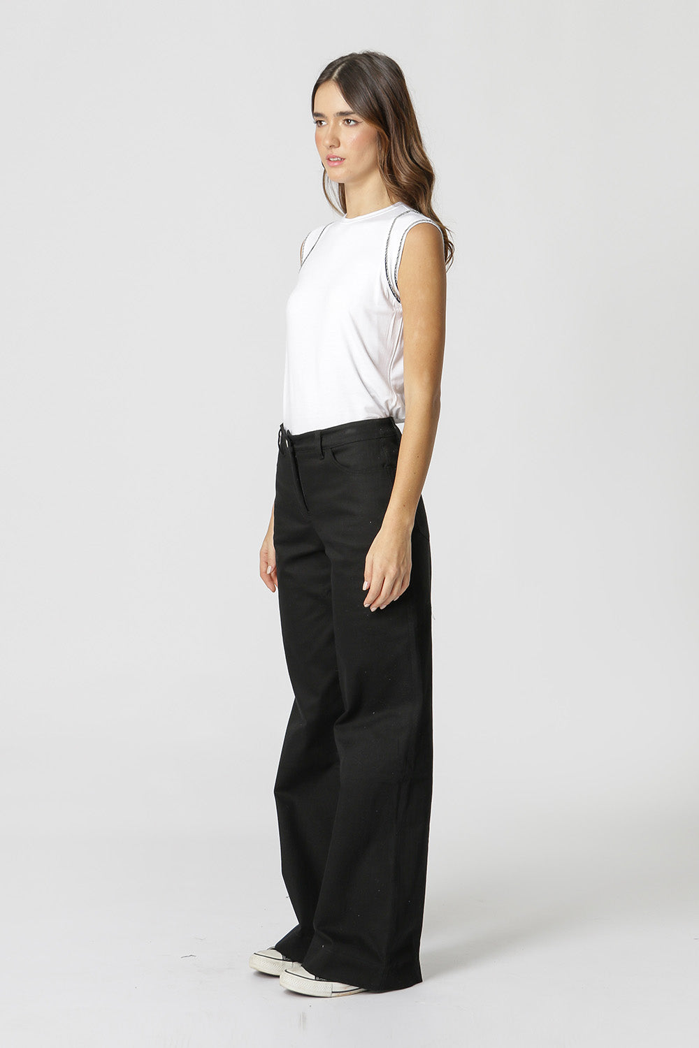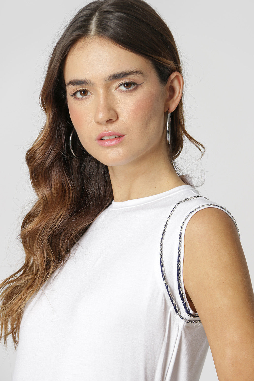 Camiseta de tirantes con detalles de herrajes en la sisa. Fabricado en tejido Visco pet. Pieza básica, cómoda, ideal para crear looks casual.