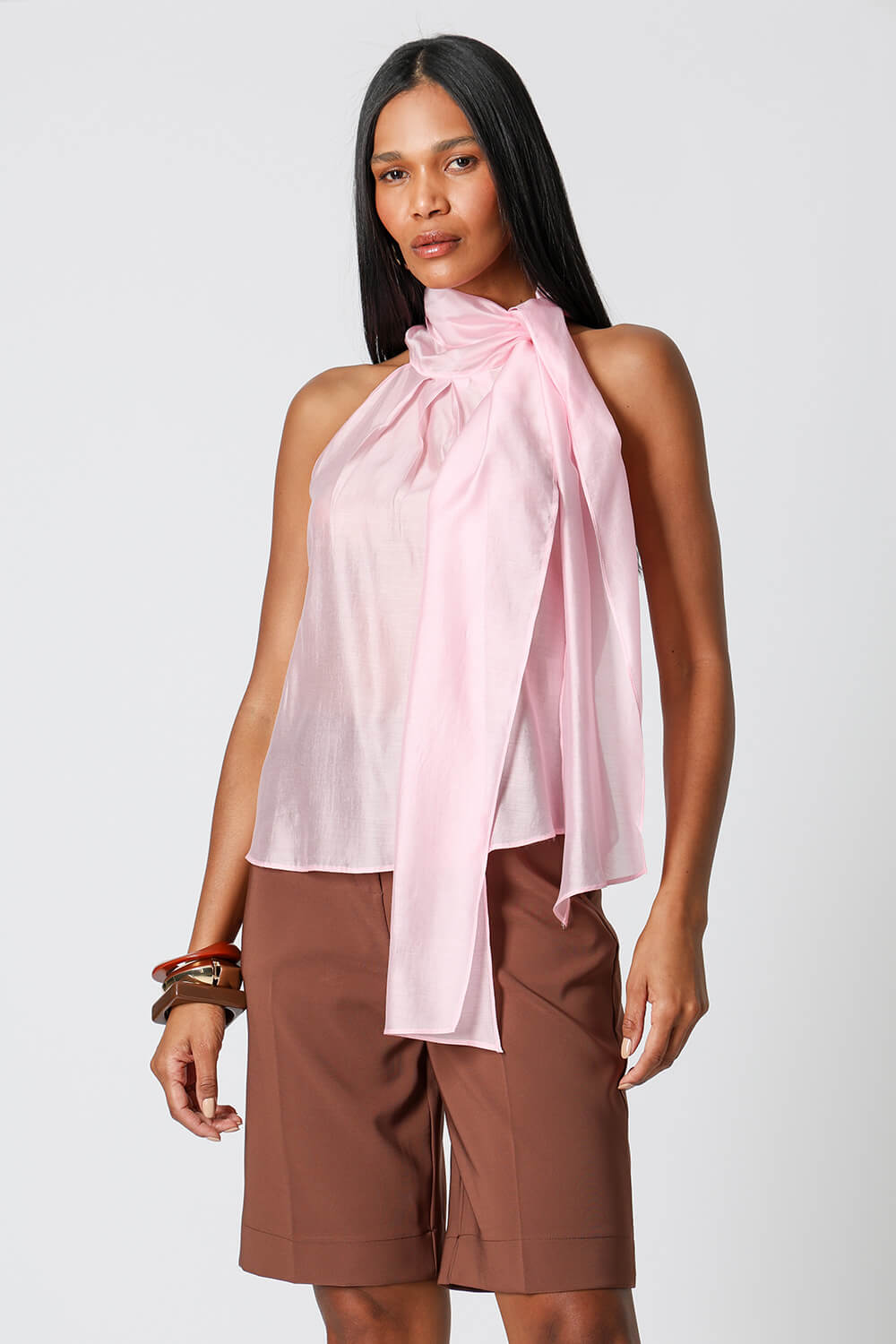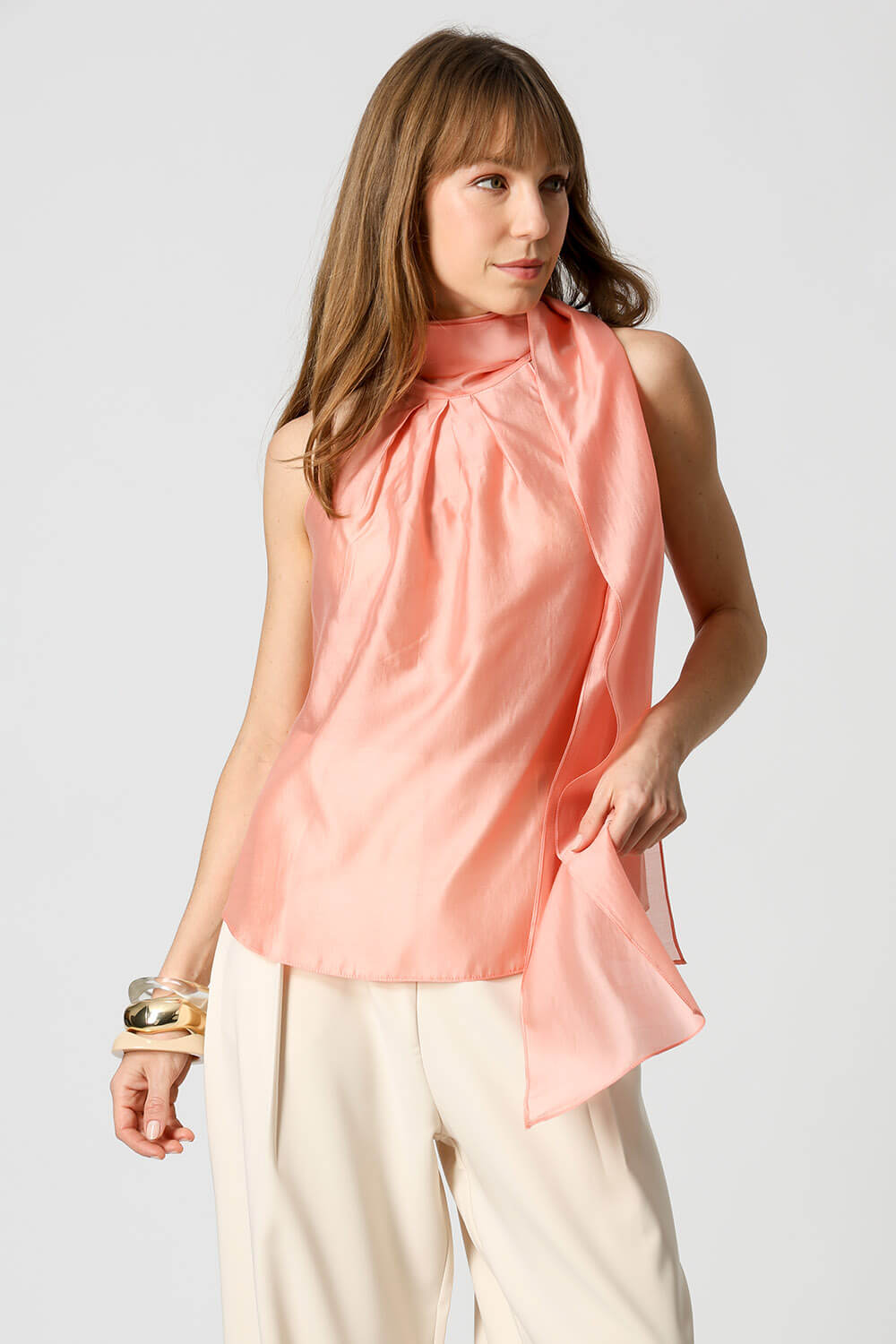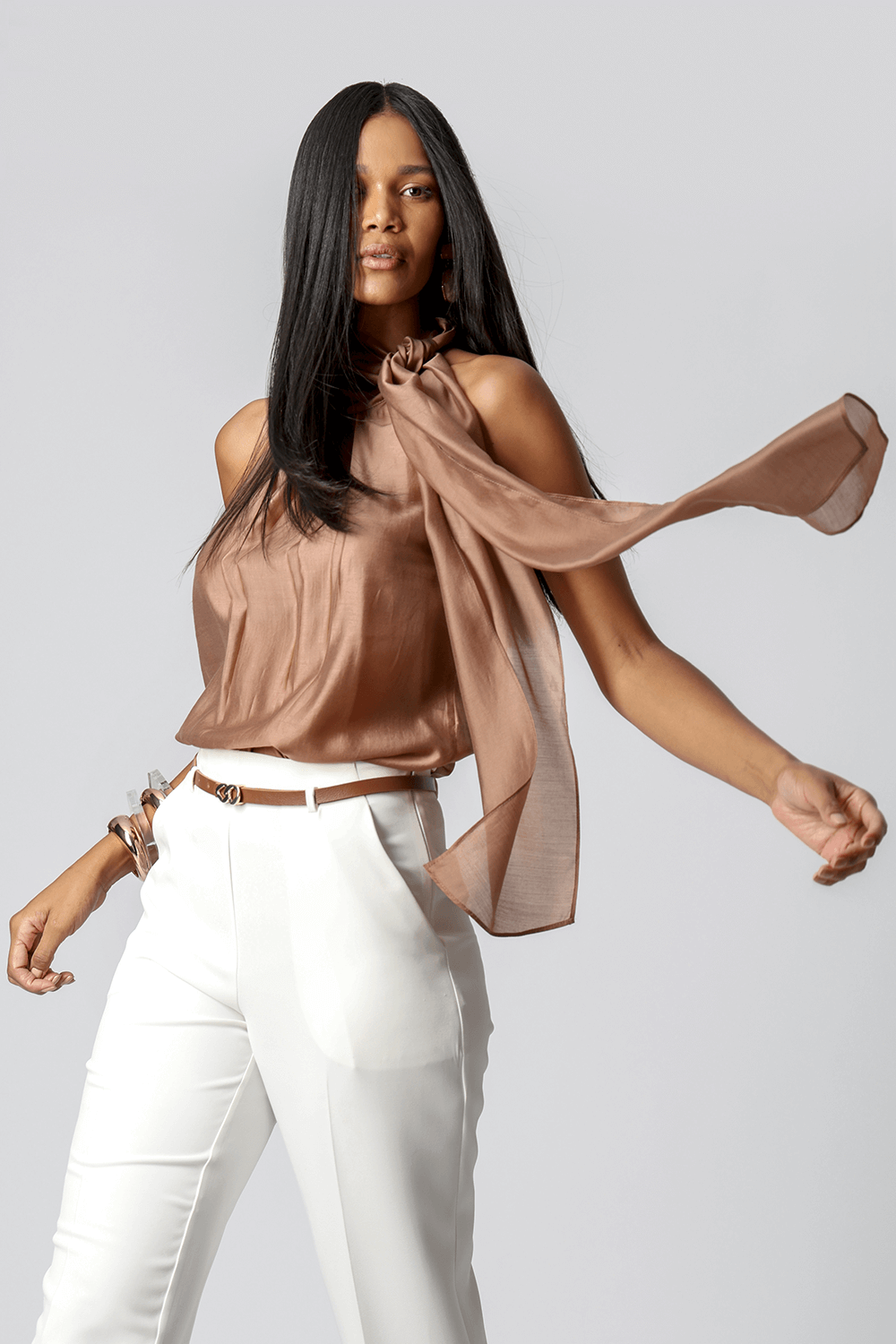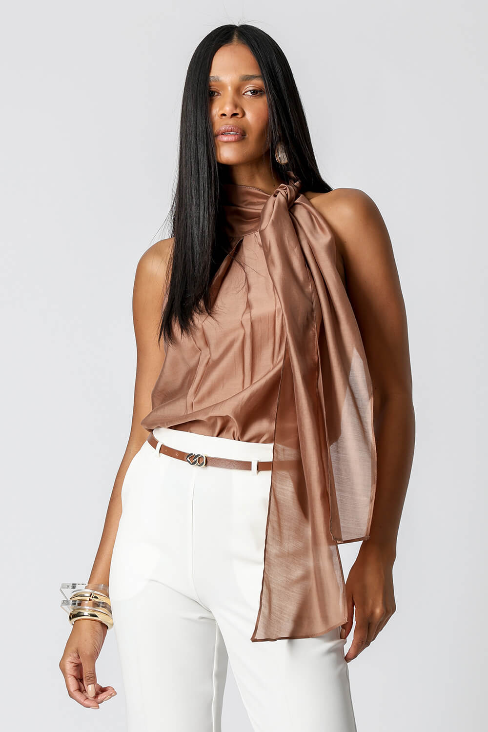 Blusa sem manga confeccionada em voil de liocel, leve e sofisticado. Possui faixa multifuncional embutida no decote, ideal para amarrações criativas no pescoço ou como detalhe estiloso.