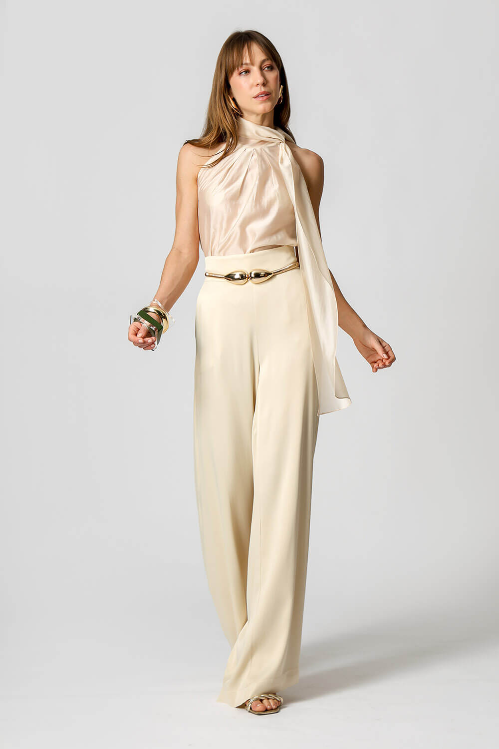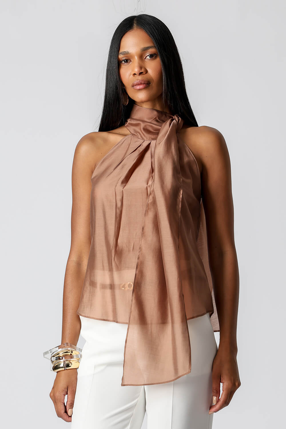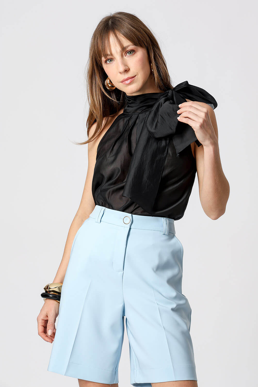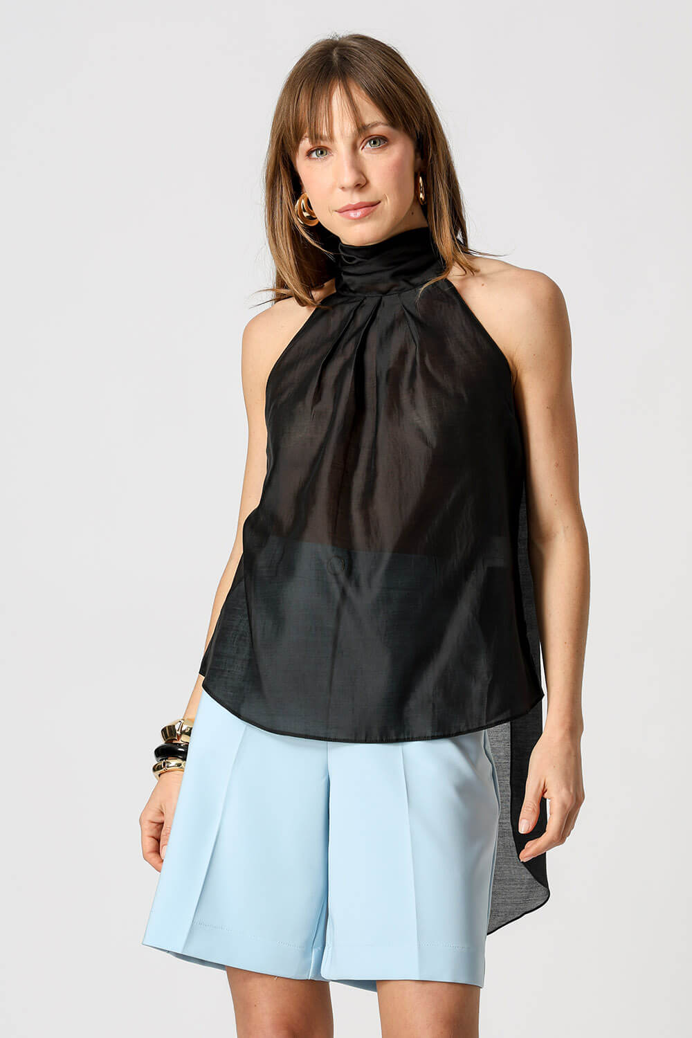 Blusa sem manga confeccionada em voil de liocel, leve e sofisticado. Possui faixa multifuncional embutida no decote, ideal para amarrações criativas no pescoço ou como detalhe estiloso.