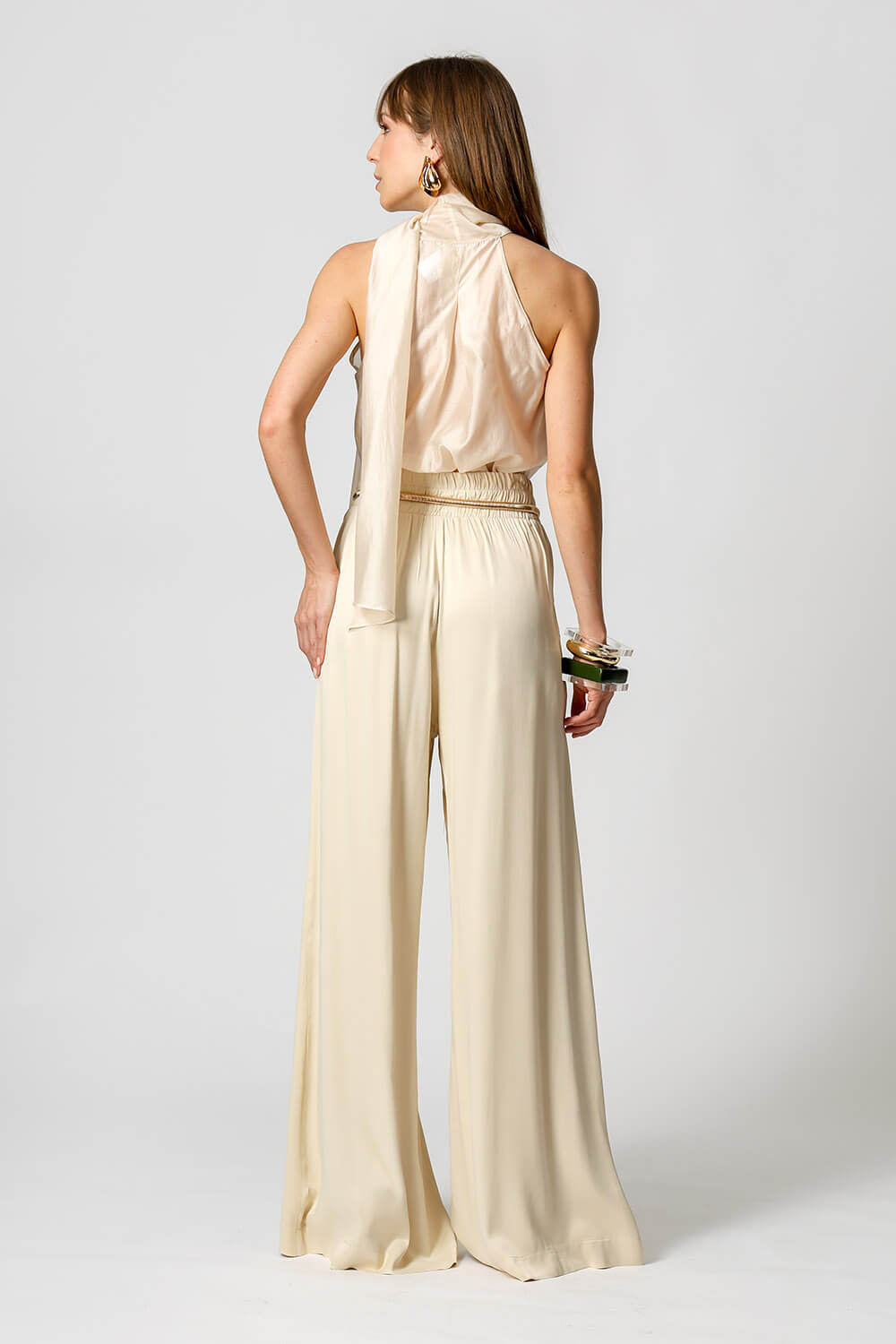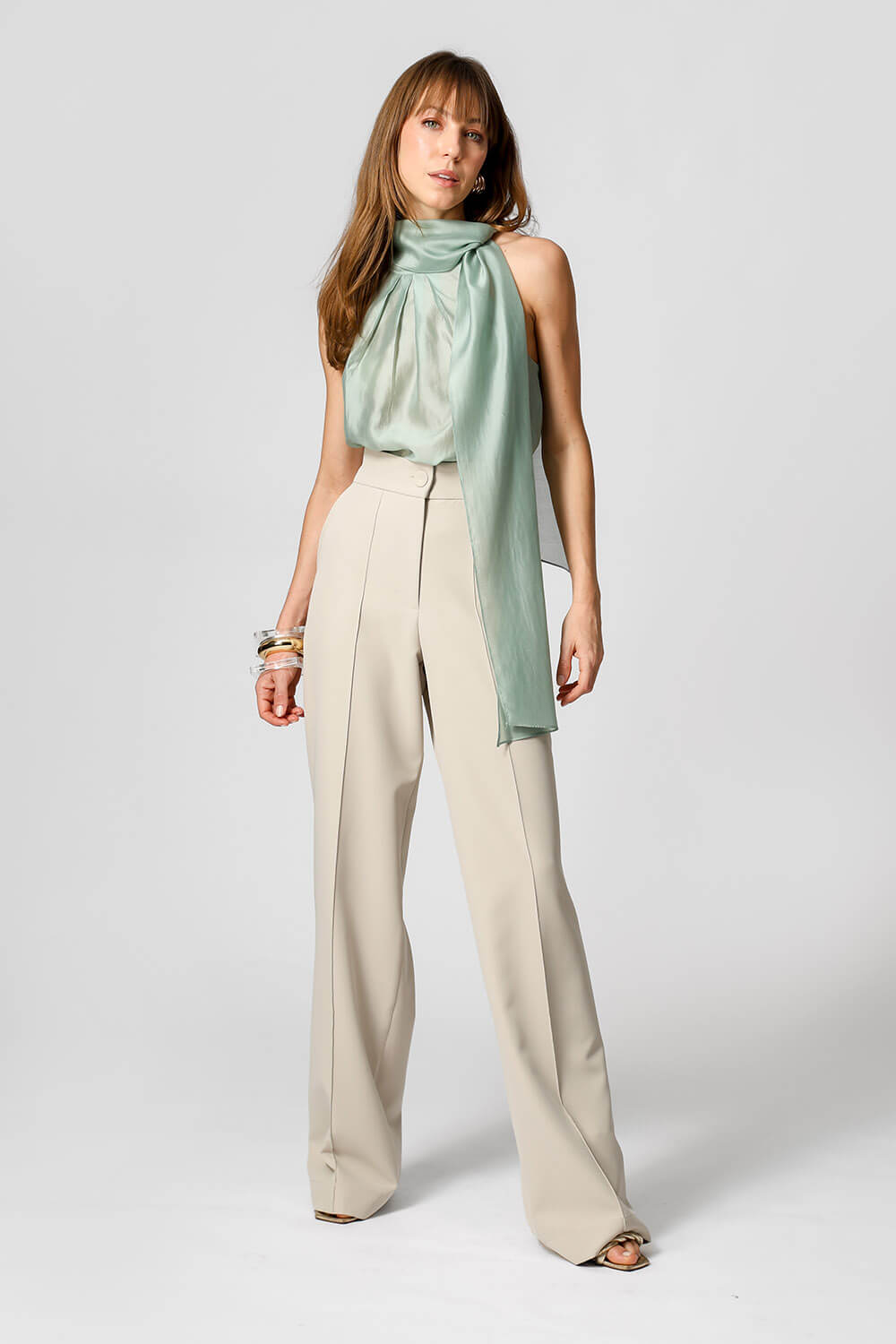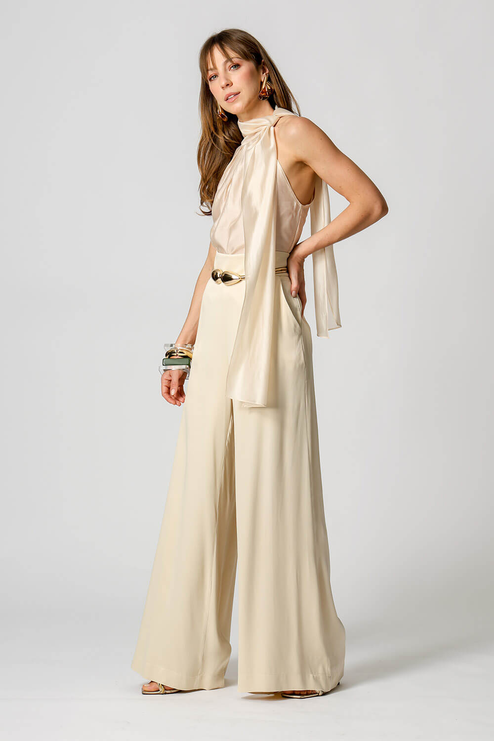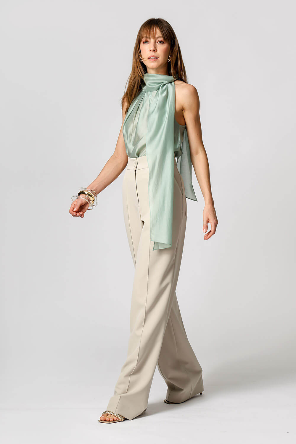 Blusa sem manga confeccionada em voil de liocel, leve e sofisticado. Possui faixa multifuncional embutida no decote, ideal para amarrações criativas no pescoço ou como detalhe estiloso.