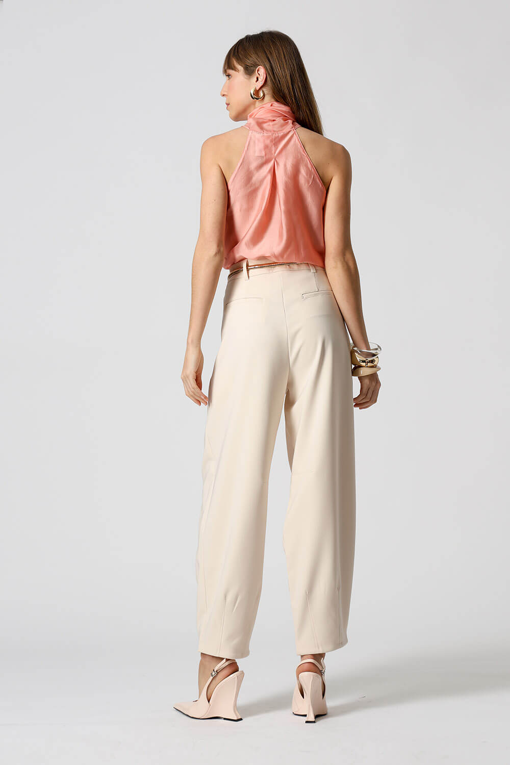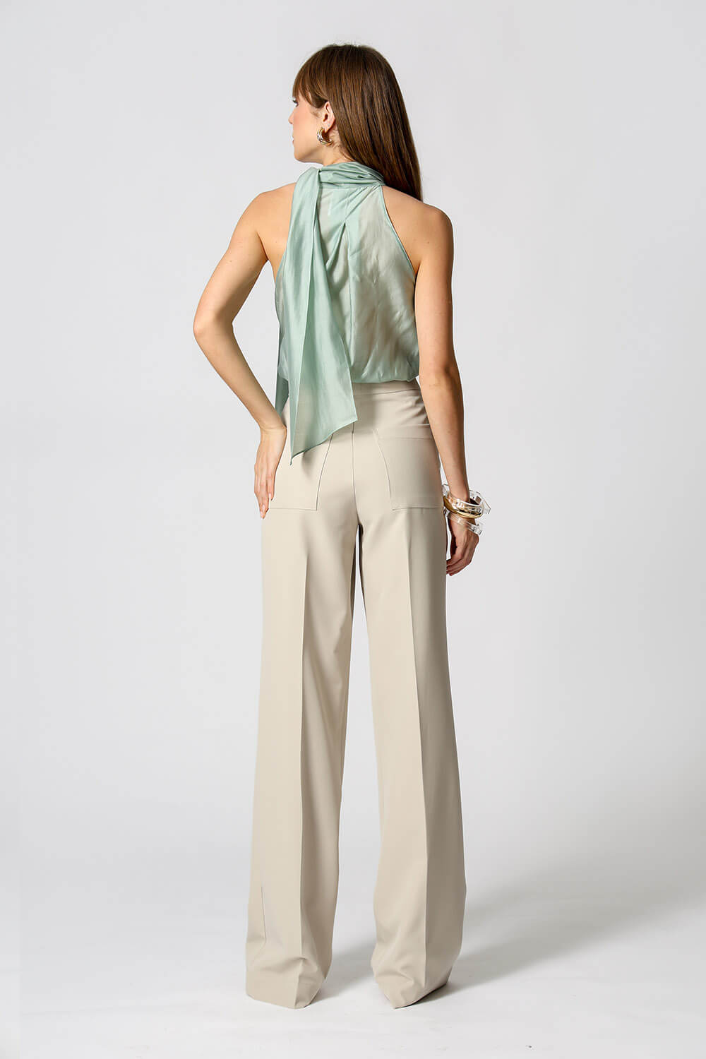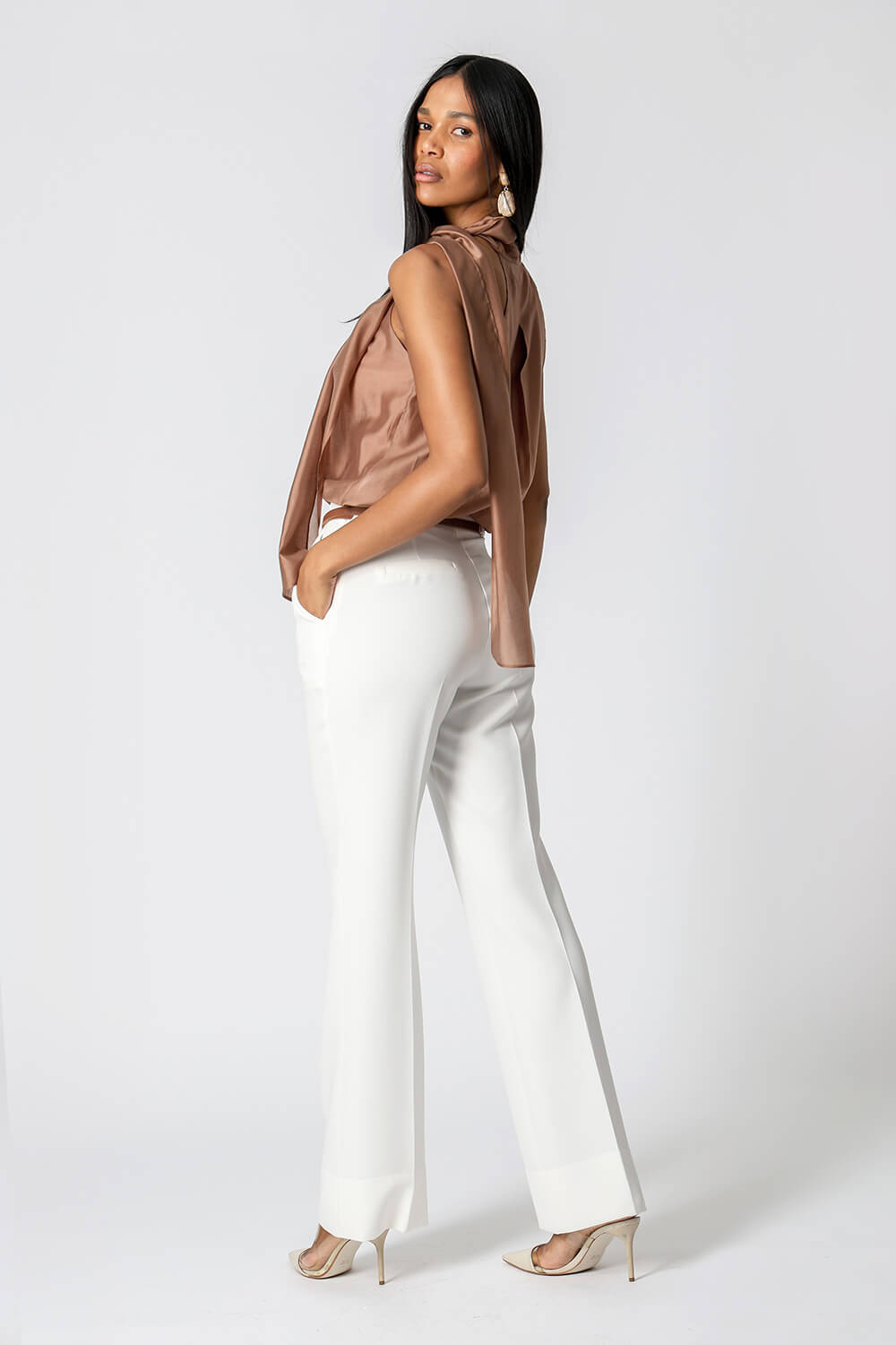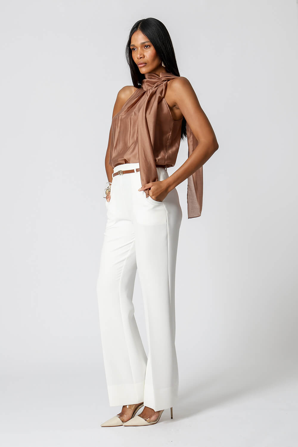 Blusa sem manga confeccionada em voil de liocel, leve e sofisticado. Possui faixa multifuncional embutida no decote, ideal para amarrações criativas no pescoço ou como detalhe estiloso.
