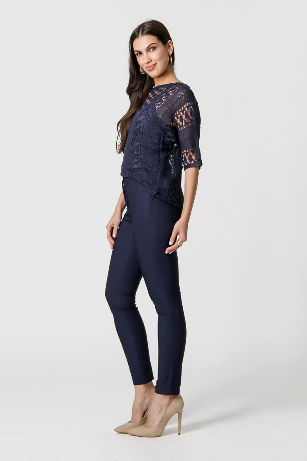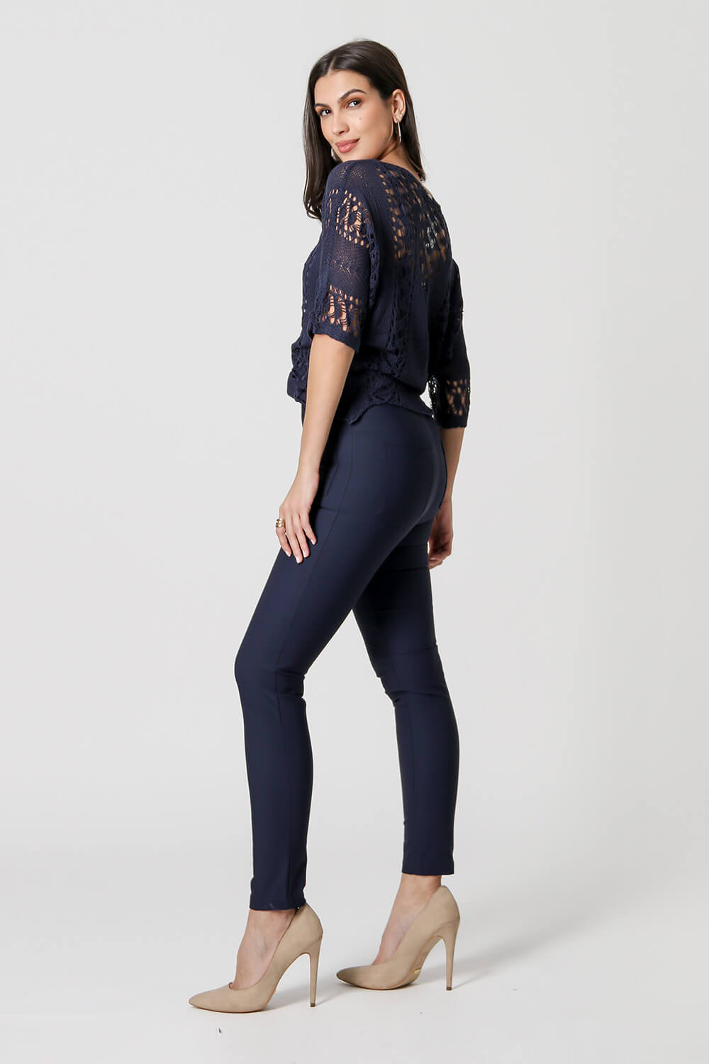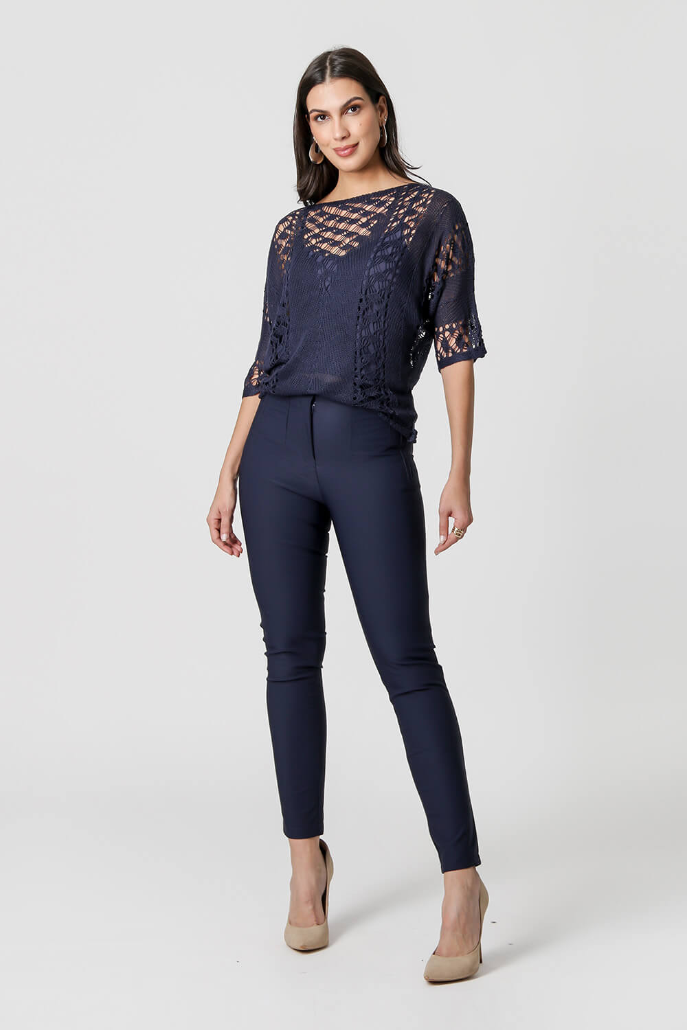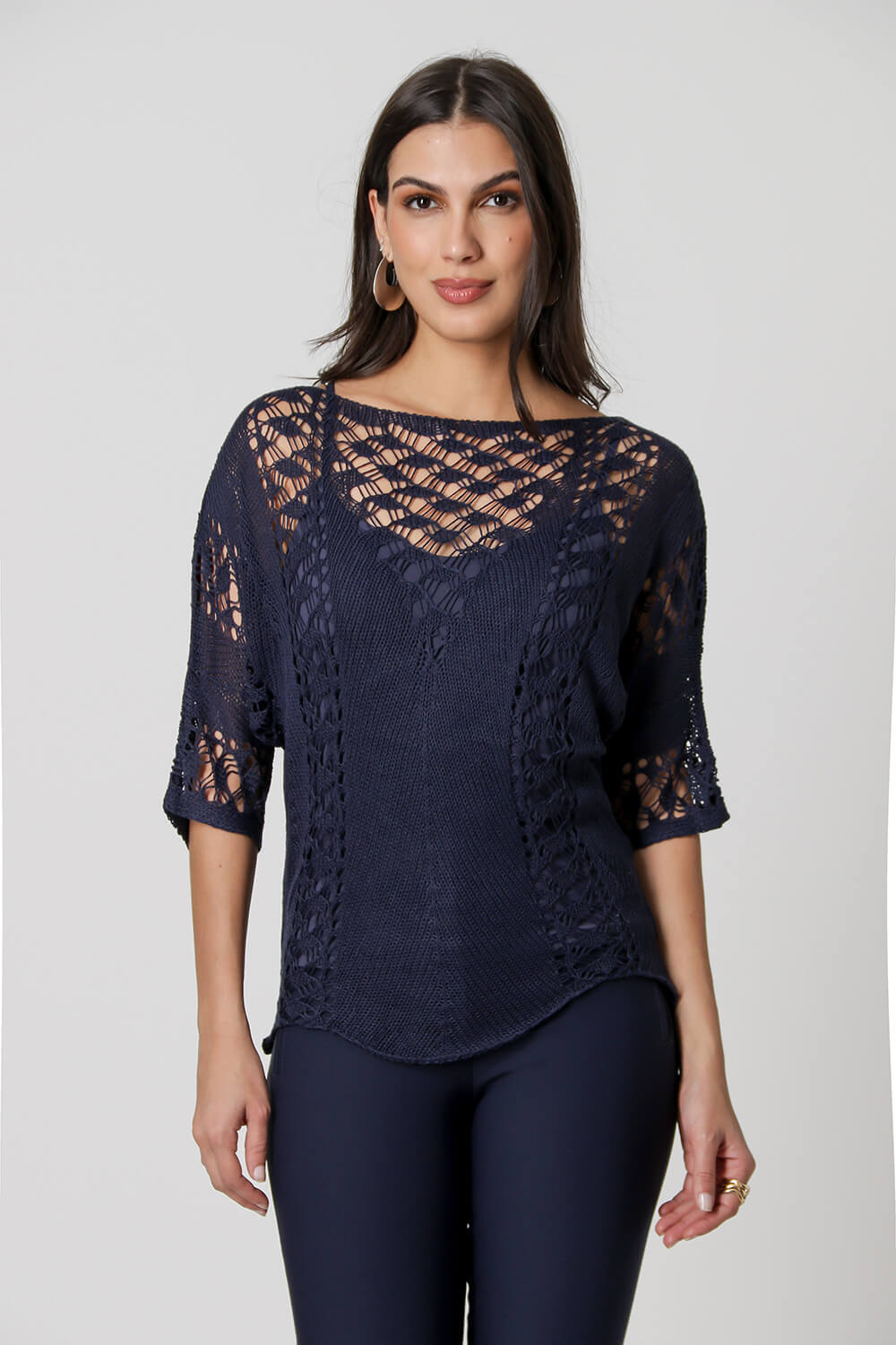 Blusa con mangas 3/4, elaborada con hilos acrílicos, tiene una forma cómoda. Con detalles de diferentes puntadas, crean un diseño calado en la pieza, que realza su delicadeza.