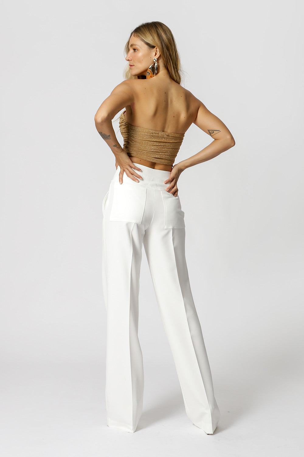 Blusa drapeada sin tirantes con detalle en escote. Una Pieza confeccionada con tejido de punto brillante. Un modelo que aporta sensualidad a tu look de noche.