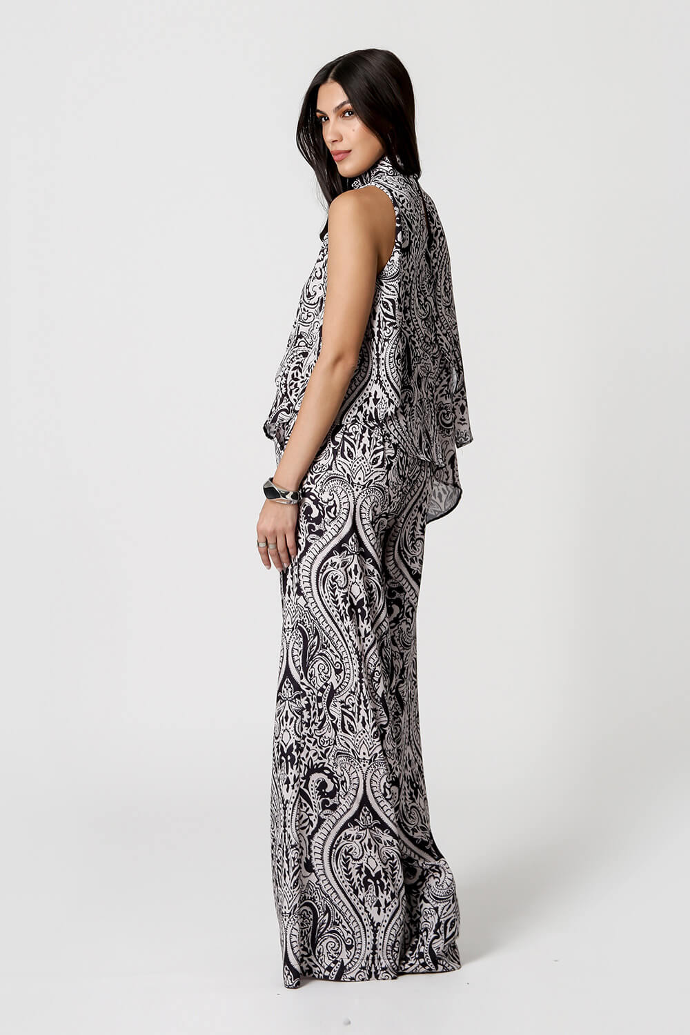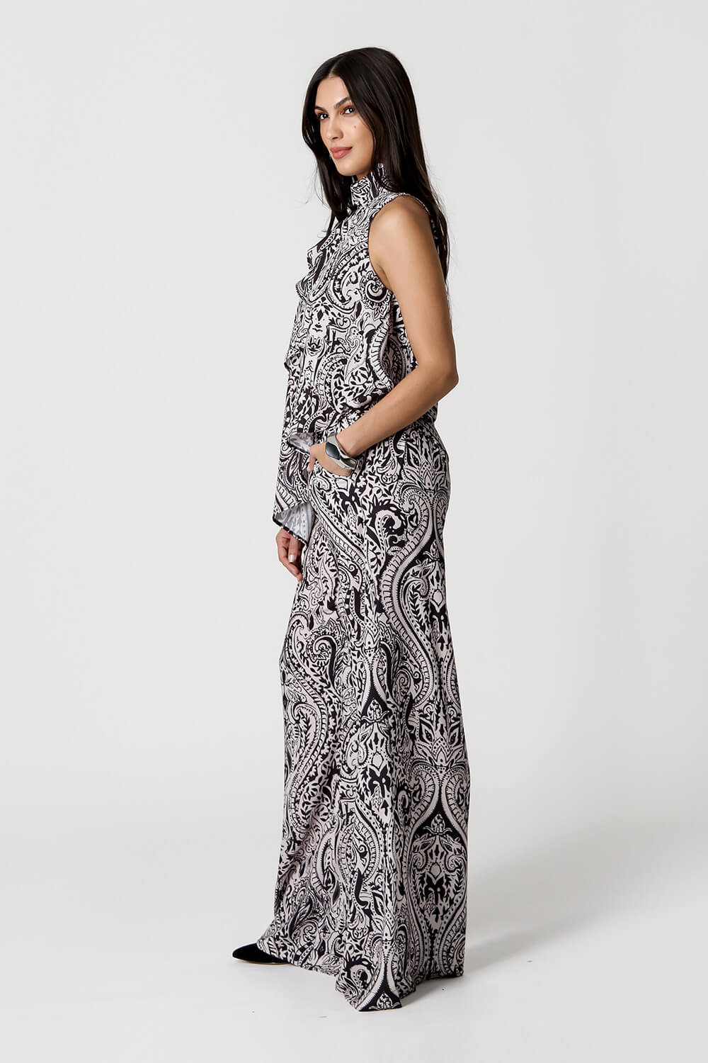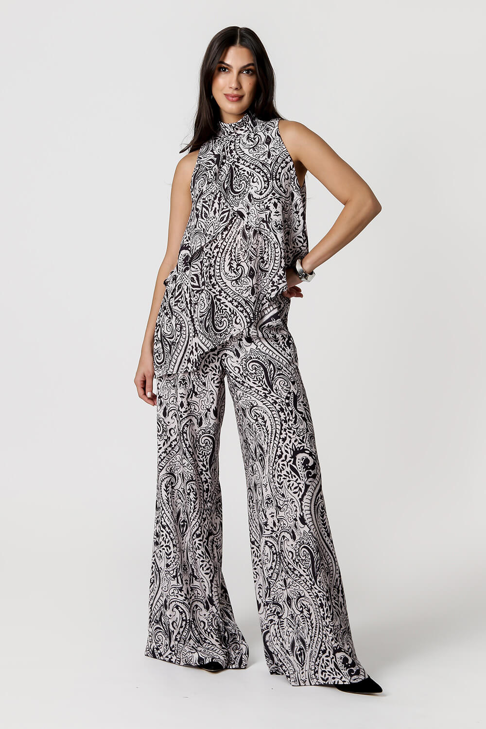 Blusa asimétrica sin mangas y cuello alto. Fabricado en tejido fluido estampado. Un modelo elegante de corte holgado y cómodo para un look casual.