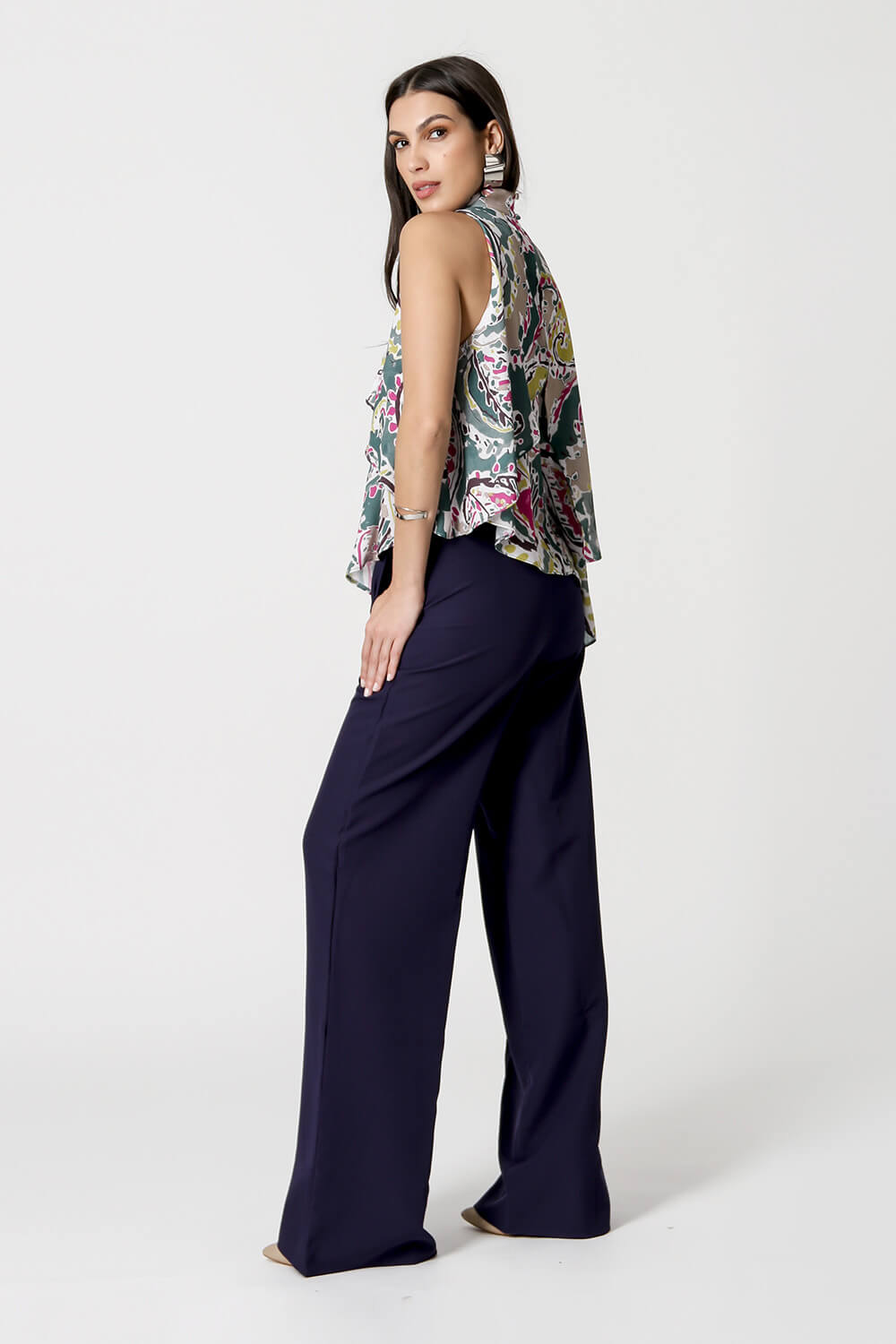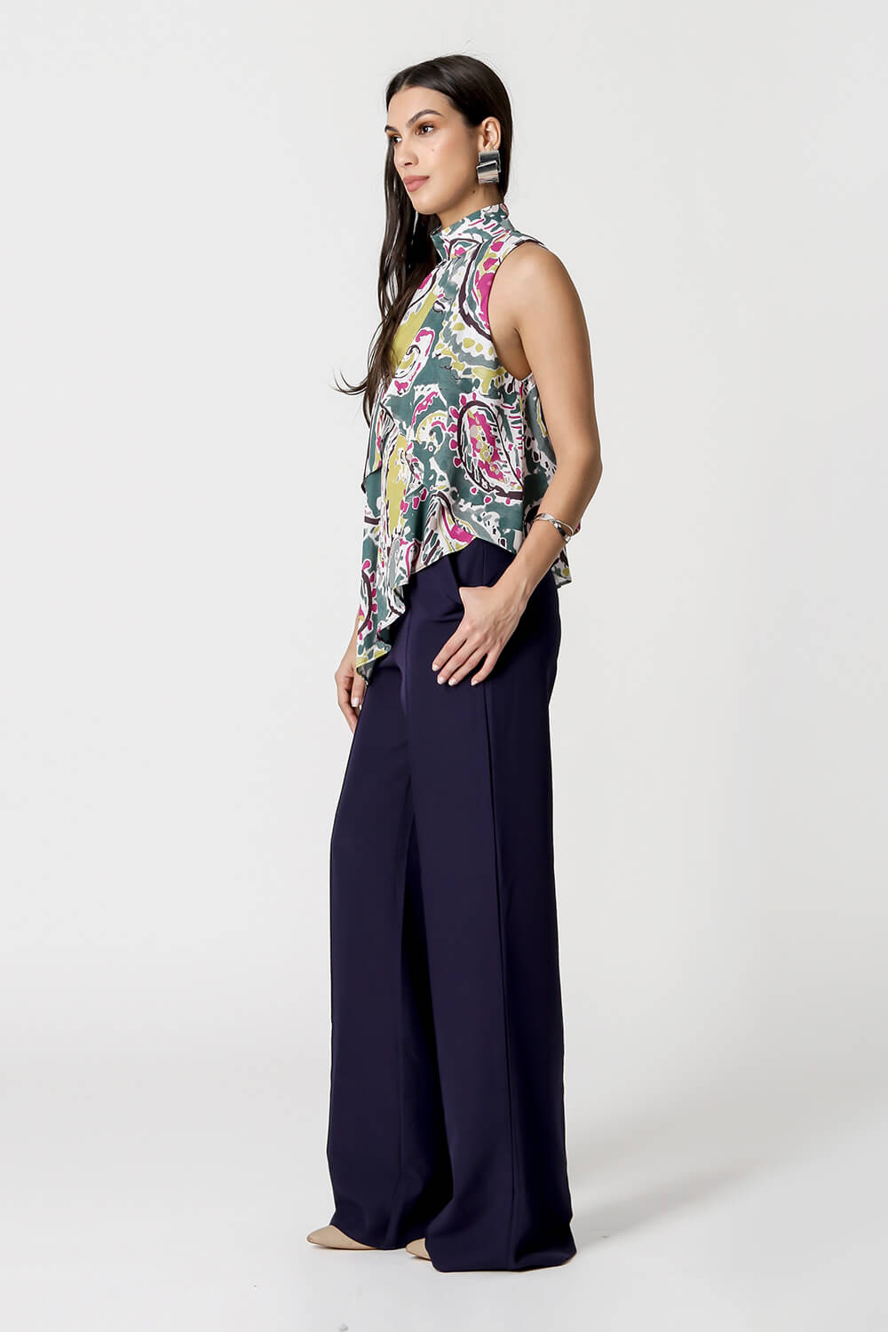 Blusa asimétrica sin mangas y cuello alto. Fabricado en tejido estampado fluido. Un modelo elegante de corte holgado y cómodo para un look casual.