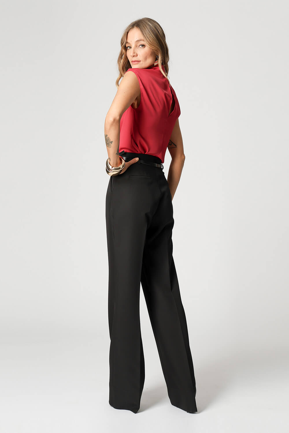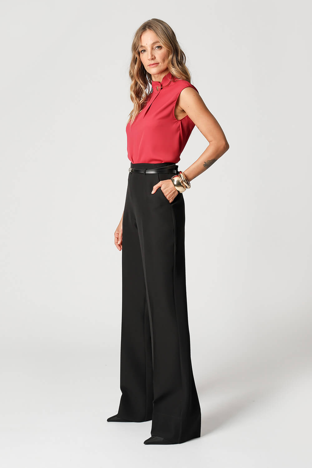 Blusa sin mangas con cuello cruzado y detalle de botones metálicos texturizados en la parte delantera. Una pieza confeccionada en tejido crepe fluido con un ajuste perfecto, aportando comodidad a tus looks.