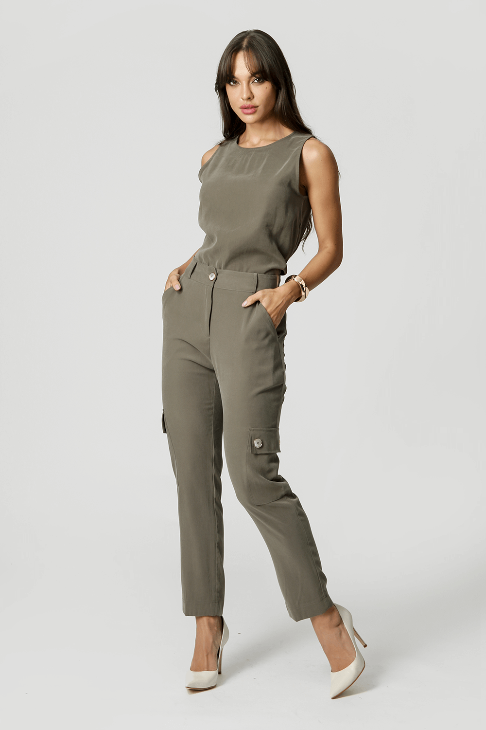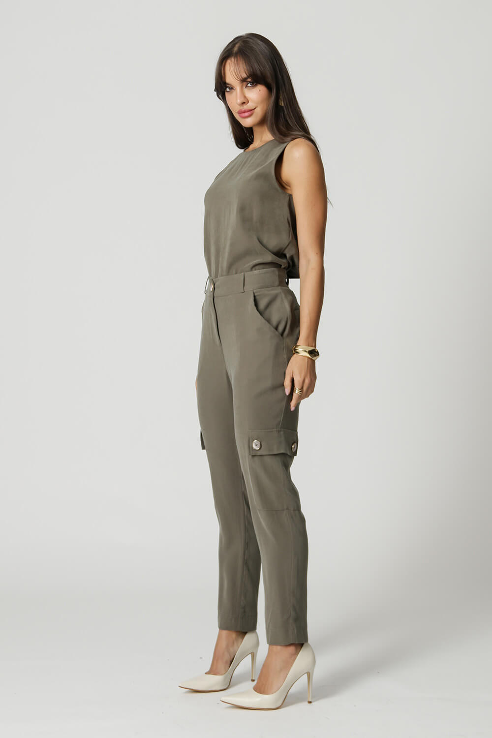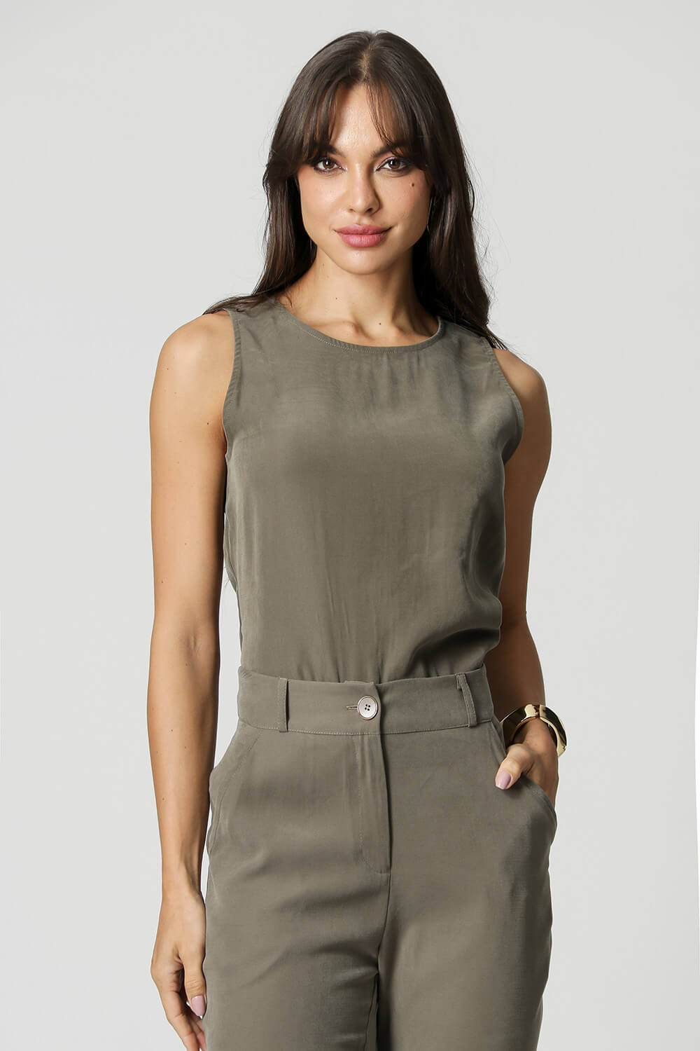 Blusa sin mangas con botón en la espalda. Un modelo realizado en tejido Tencel. Una pieza perfecta para el uso diario ya que es muy cómoda.
