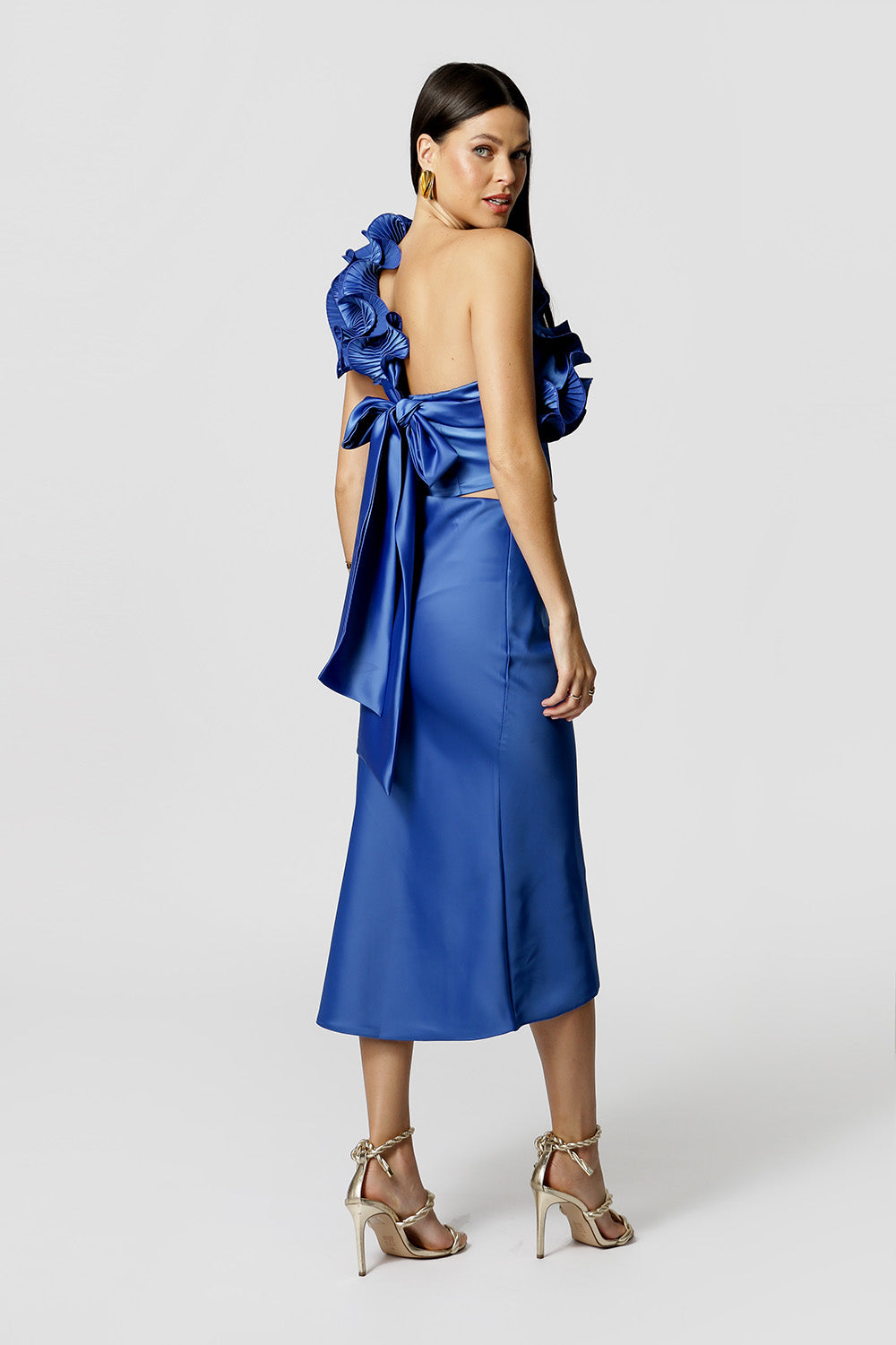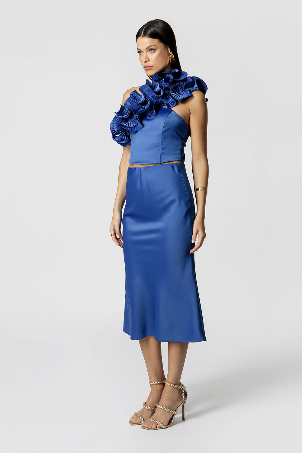 Blusa sem mangas com acessório plissado do próprio tecido. Modelo confeccionado em tecido cetim pesado. Um modelo diferenciado elegante e cheio de estilo perfeito para mood night.