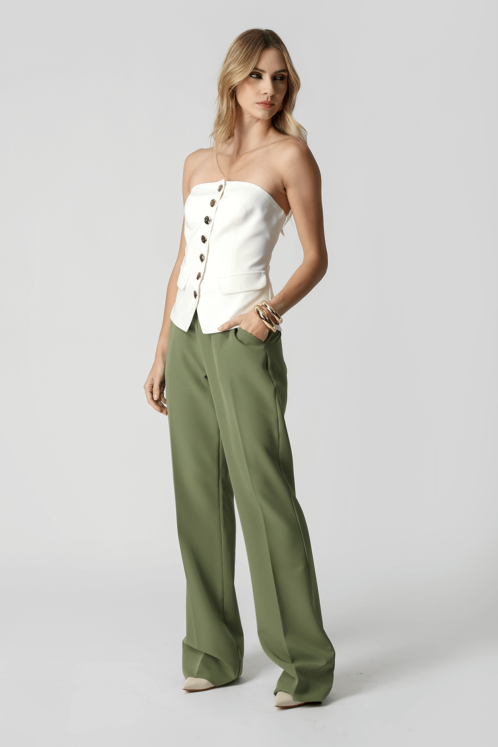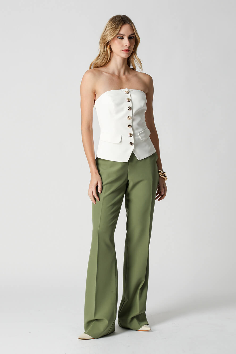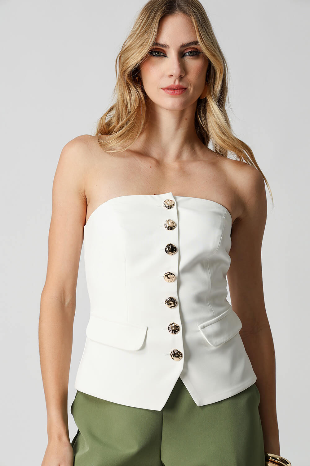 Blusa strapless con botones dorados es una pieza súper elegante y sofisticada. Este modelo aporta un toque clásico, pero con un look moderno.