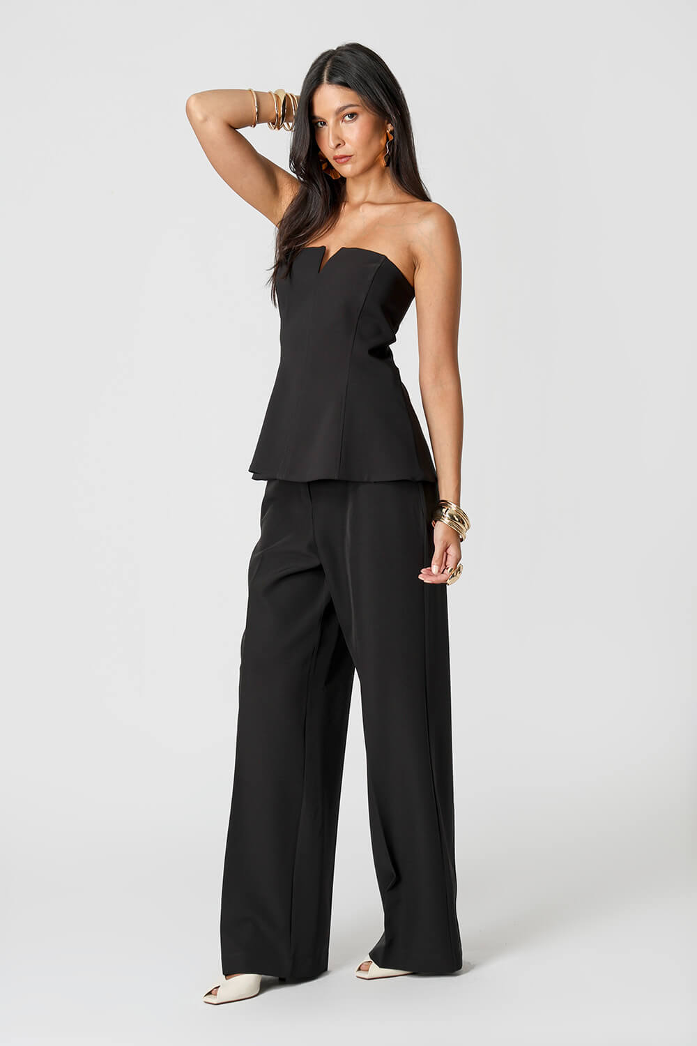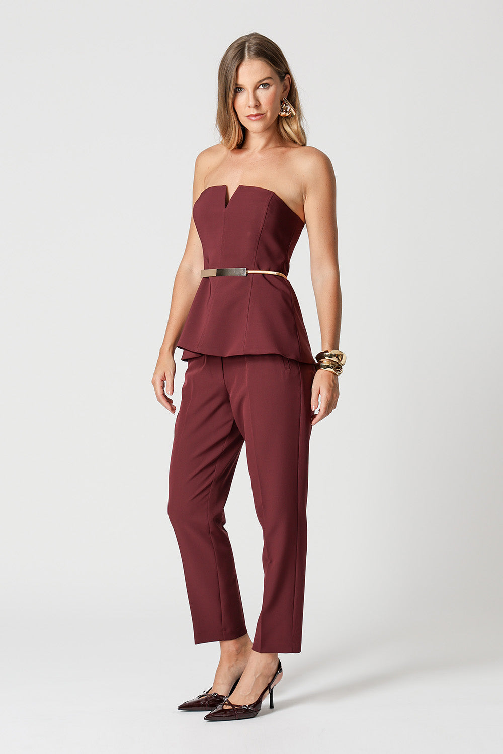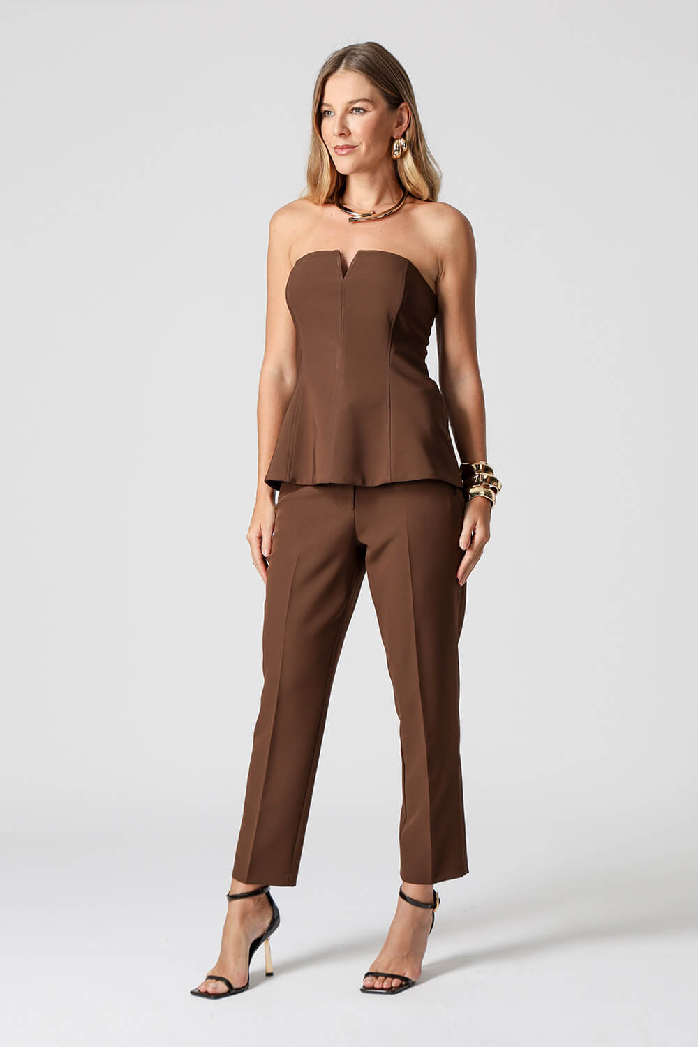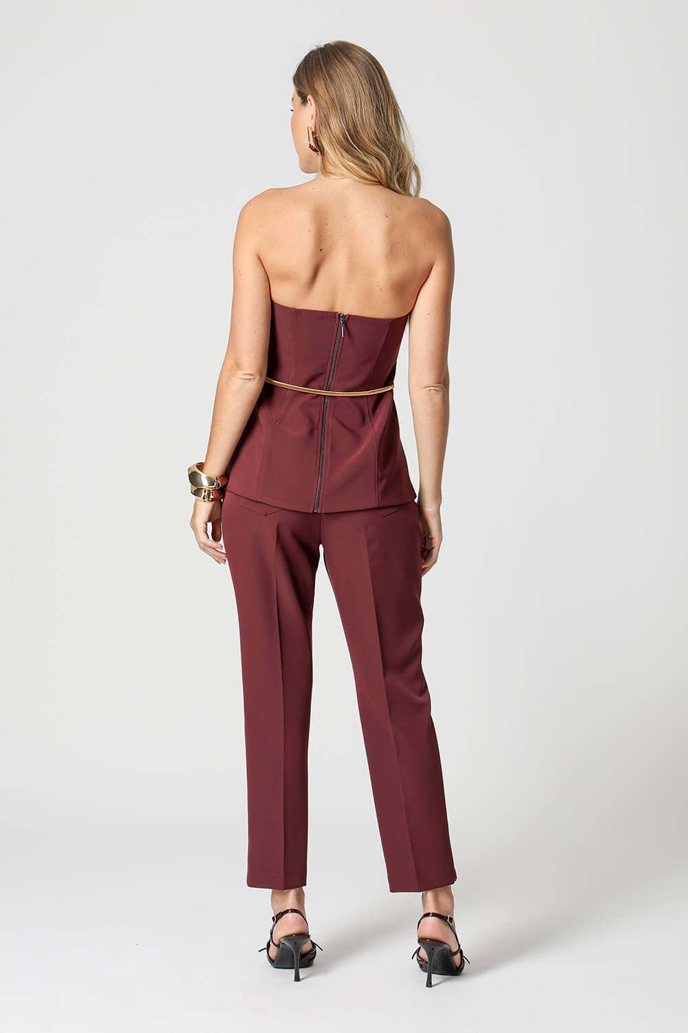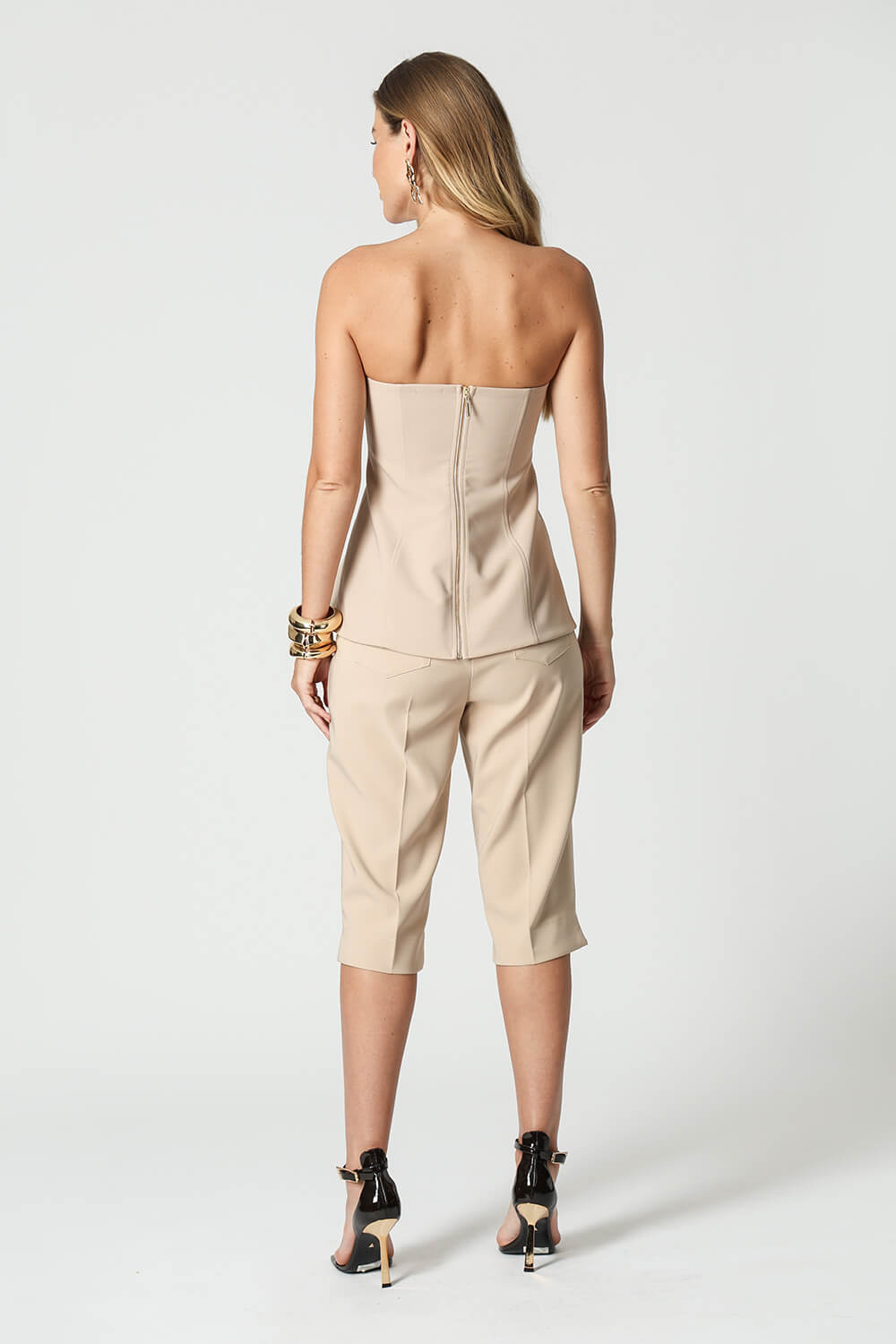 Blusa strapless em tecido de alfaiataria, com recortes estruturados, detalhe em V no decote e zíper de metal nas costas. Moderna e elegante para produções sofisticadas.