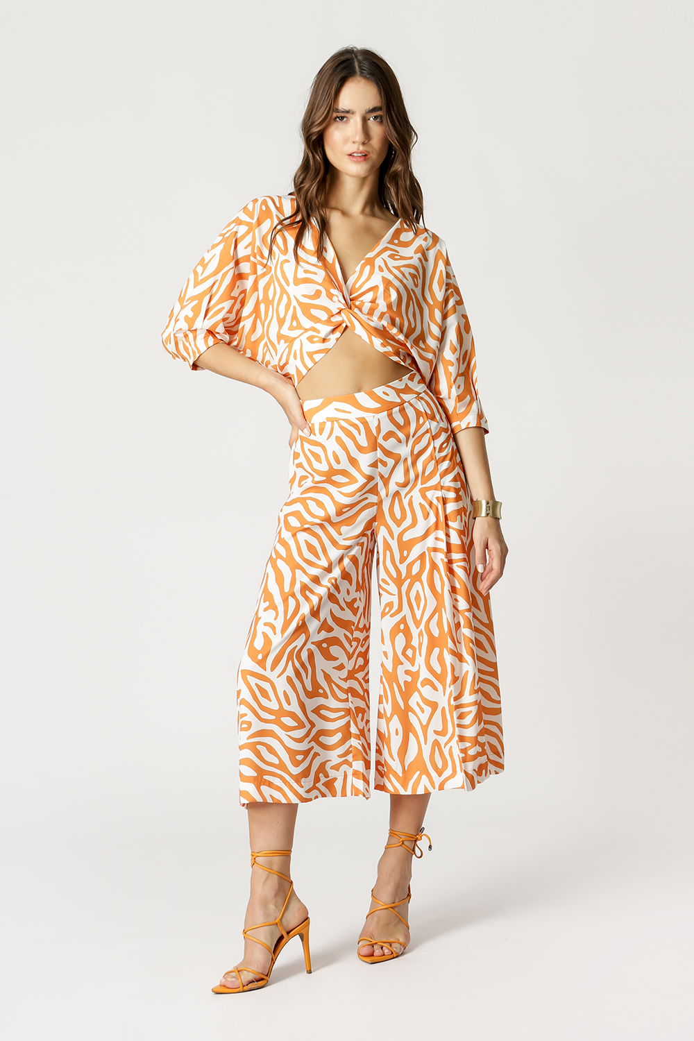Blusa con escote en pico, detalle delantero torcido y mangas 3/4. Modelo ideal para componer un look casual.
