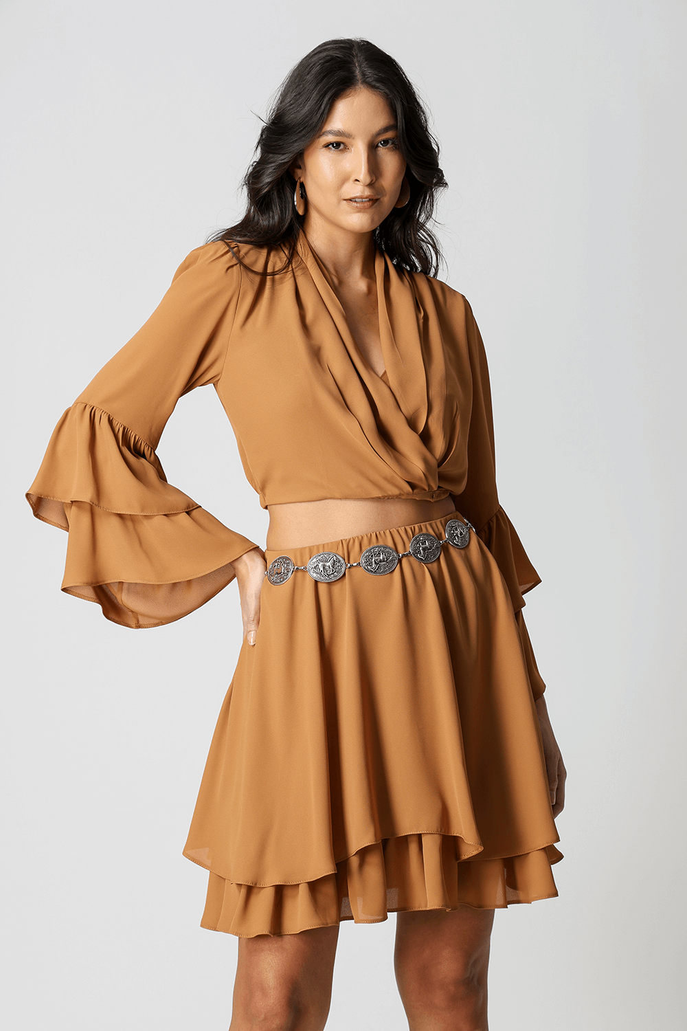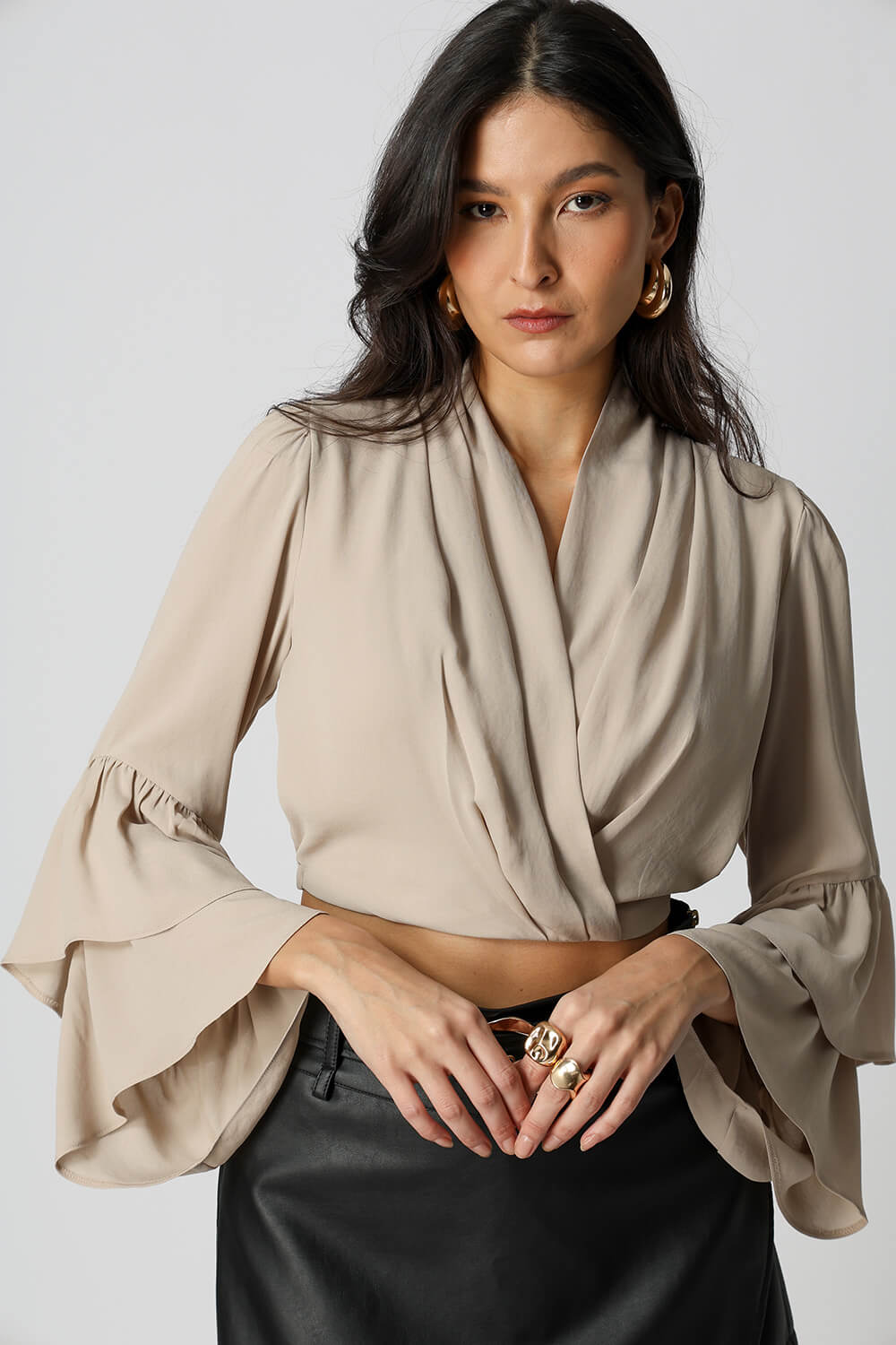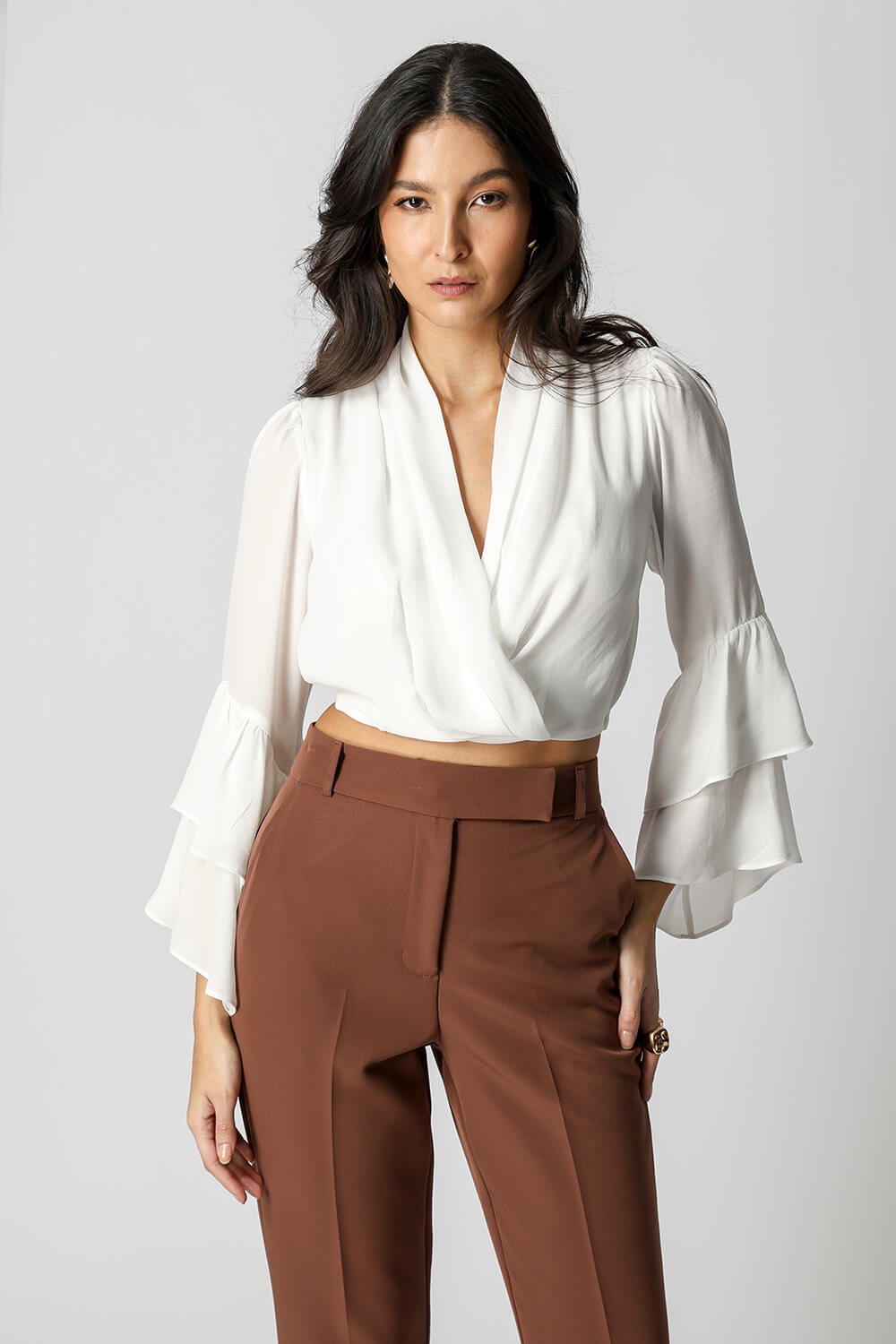 Blusa feminina em crepe leve, com modelagem transpassada na frente, manga longa com dois babados e elástico na barra para ajuste perfeito. Ideal para compor looks elegantes e confortáveis.