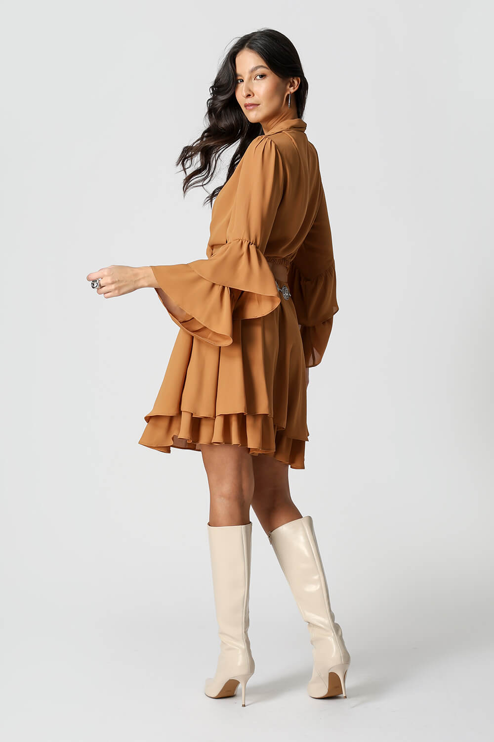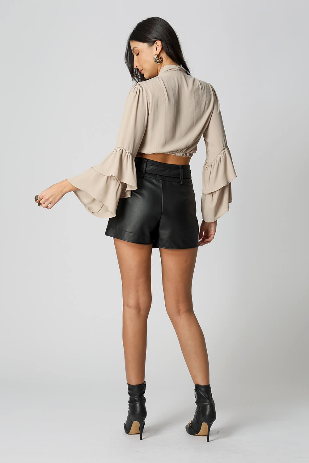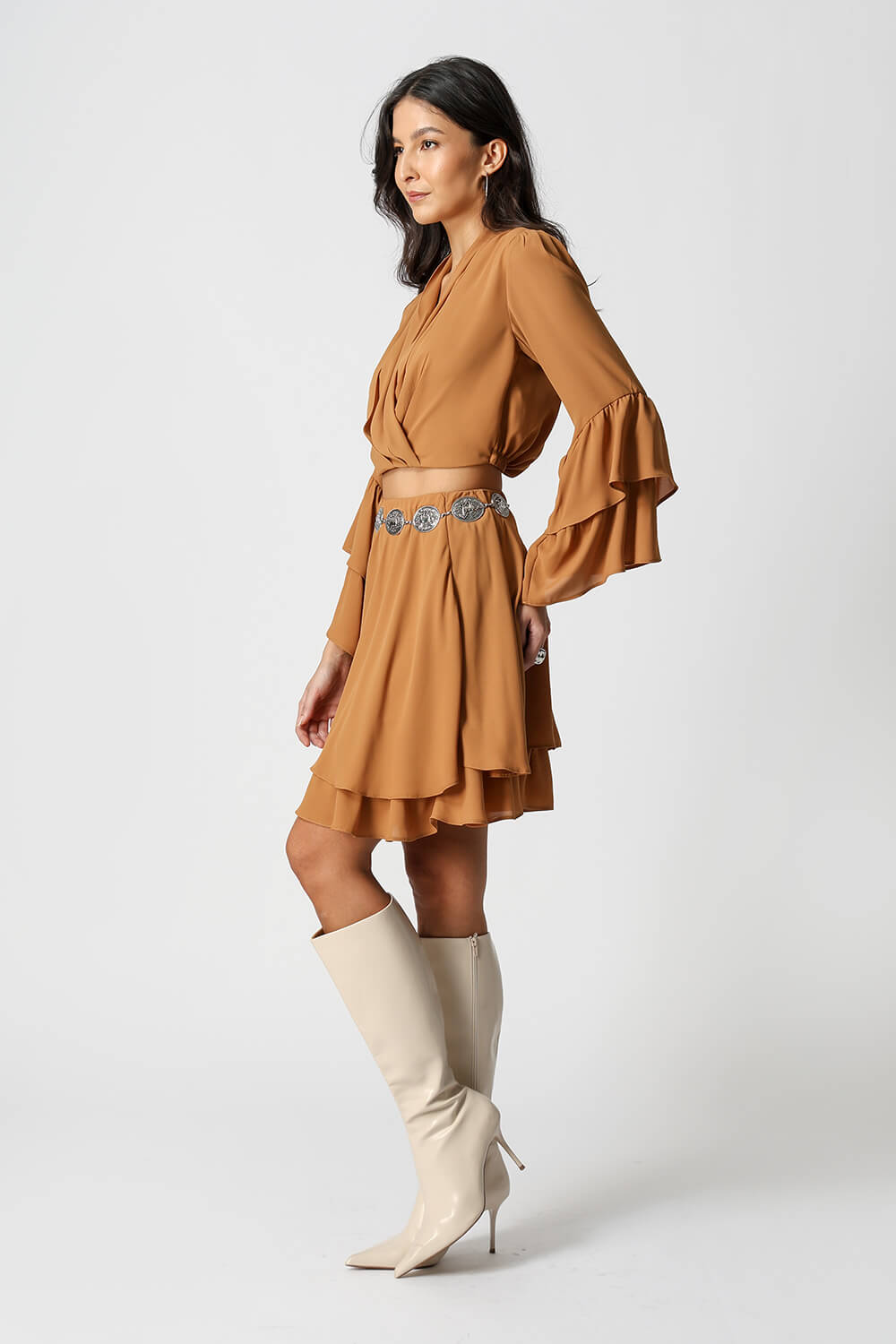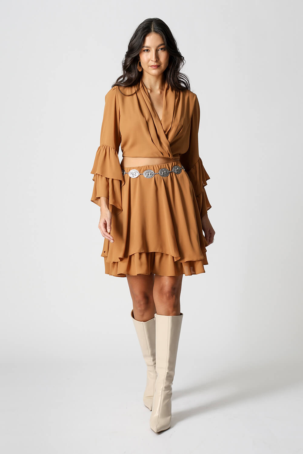 Blusa feminina em crepe leve, com modelagem transpassada na frente, manga longa com dois babados e elástico na barra para ajuste perfeito. Ideal para compor looks elegantes e confortáveis.