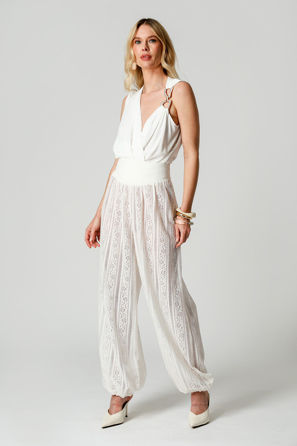 Detalhe de aviamento de strass no ombro esquerdo