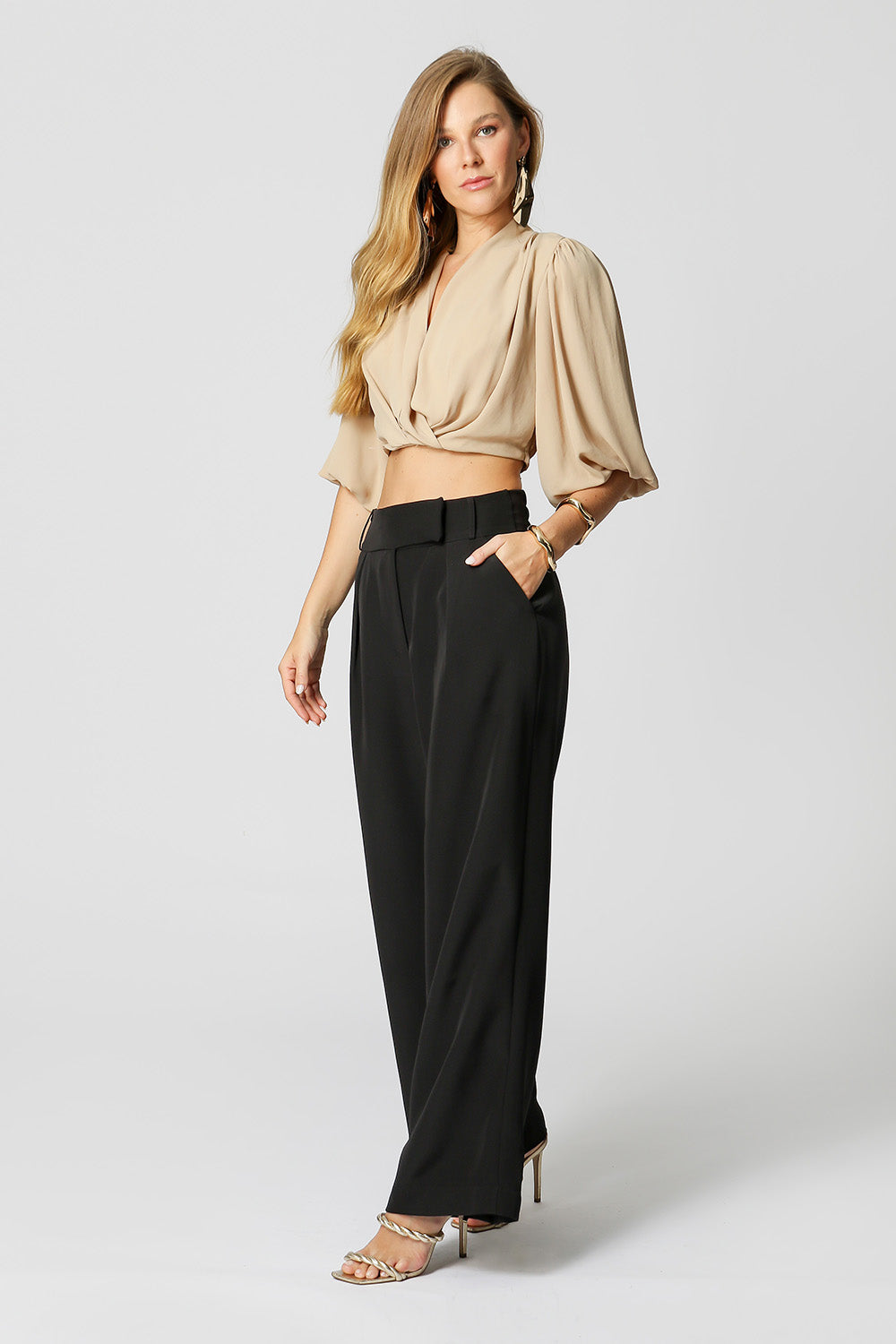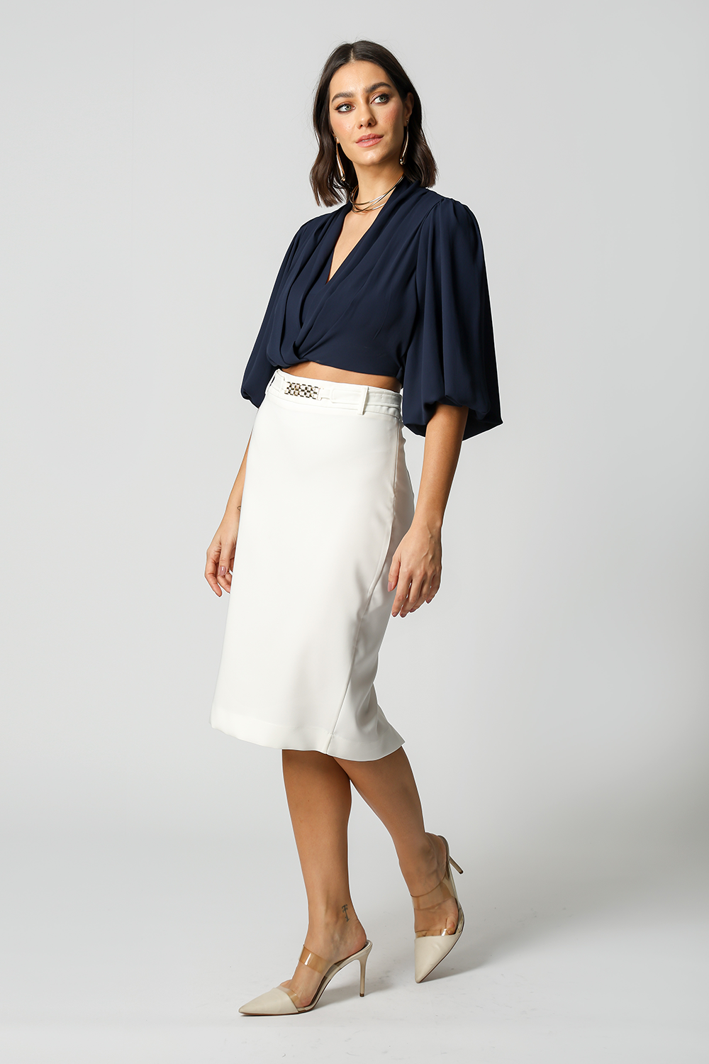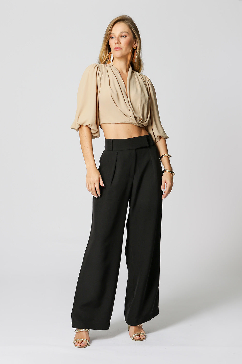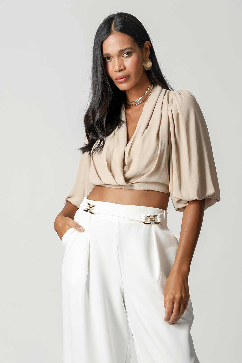 Blusa cropped transpassada com elástico na barra e manga balonê. Uma peça confeccionada em tecido crepe fluído. Um modelo perfeito para mood work.