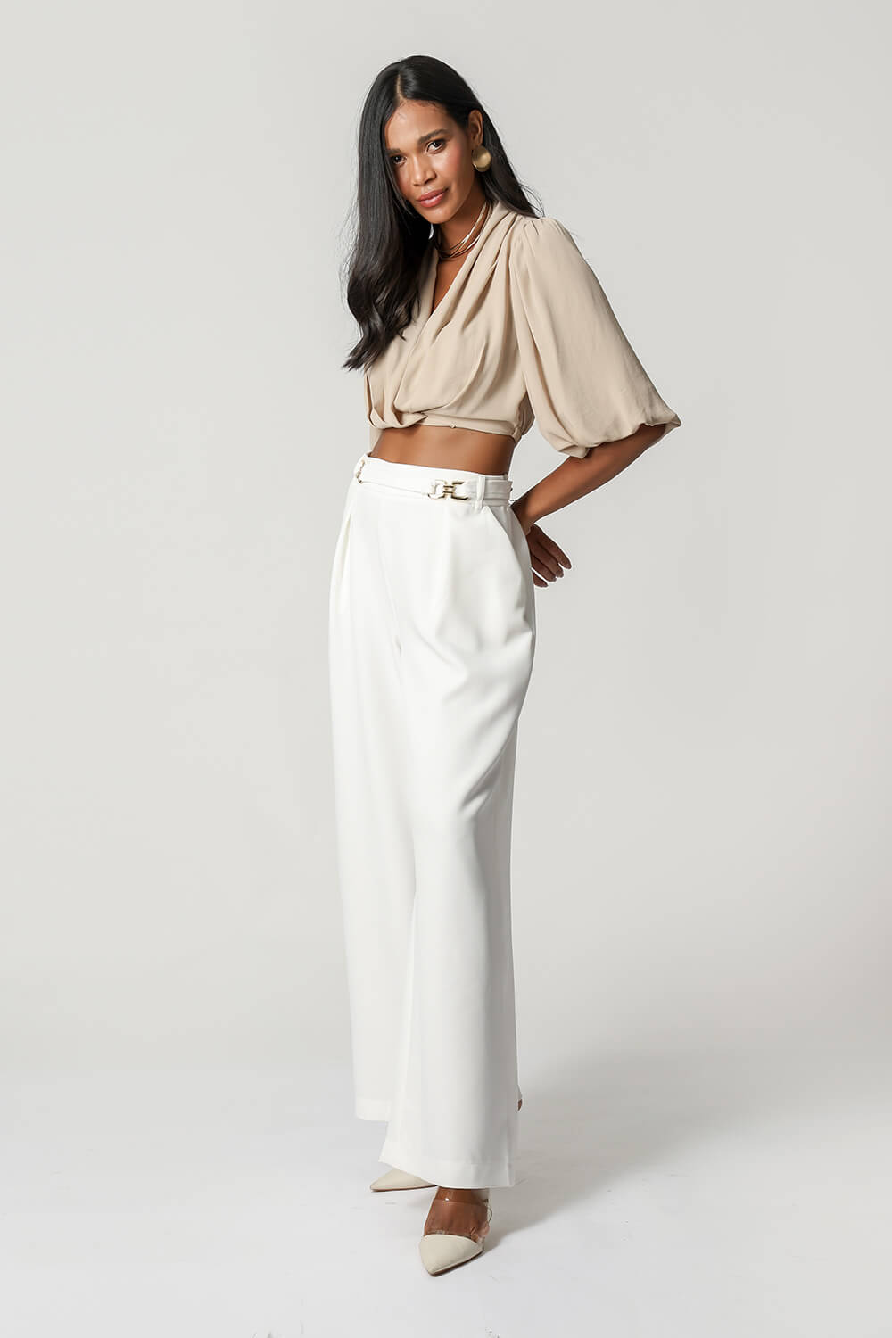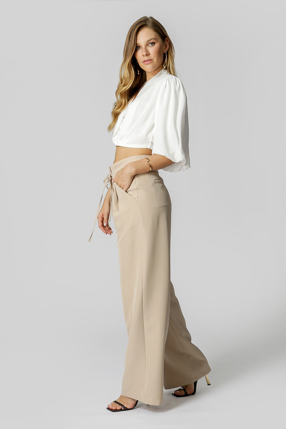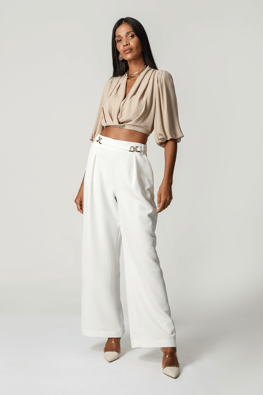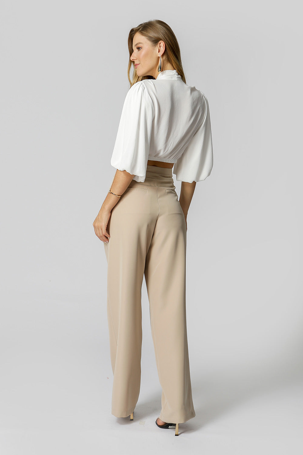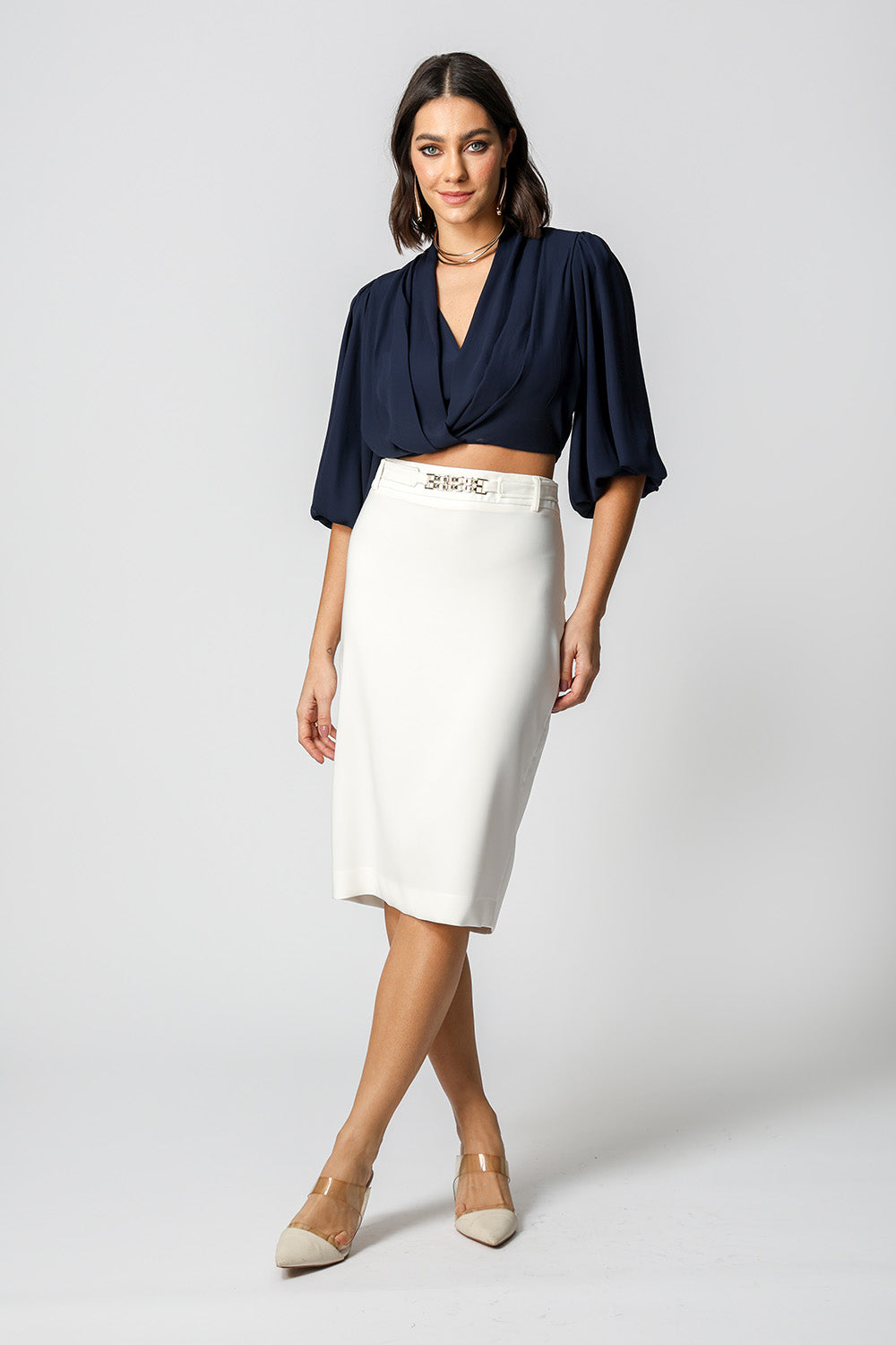 Blusa cropped transpassada com elástico na barra e manga balonê. Uma peça confeccionada em tecido crepe fluído. Um modelo perfeito para mood work.