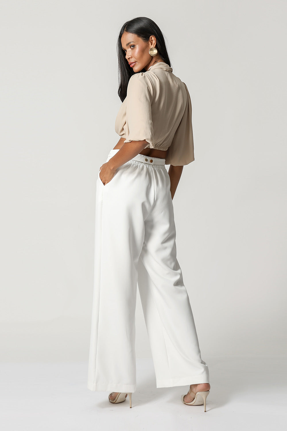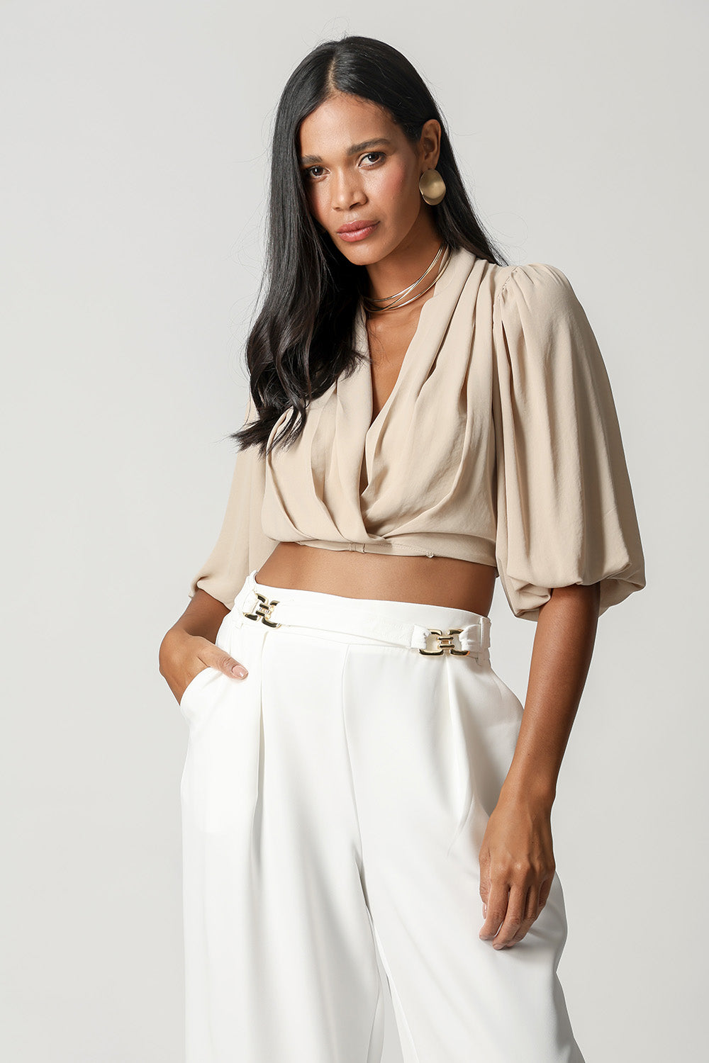 Blusa cruzada corta con bajo elástico y mangas abullonadas. Pieza confeccionada en tejido crepé fluido. Un modelo perfecto para el estado de ánimo de trabajo.