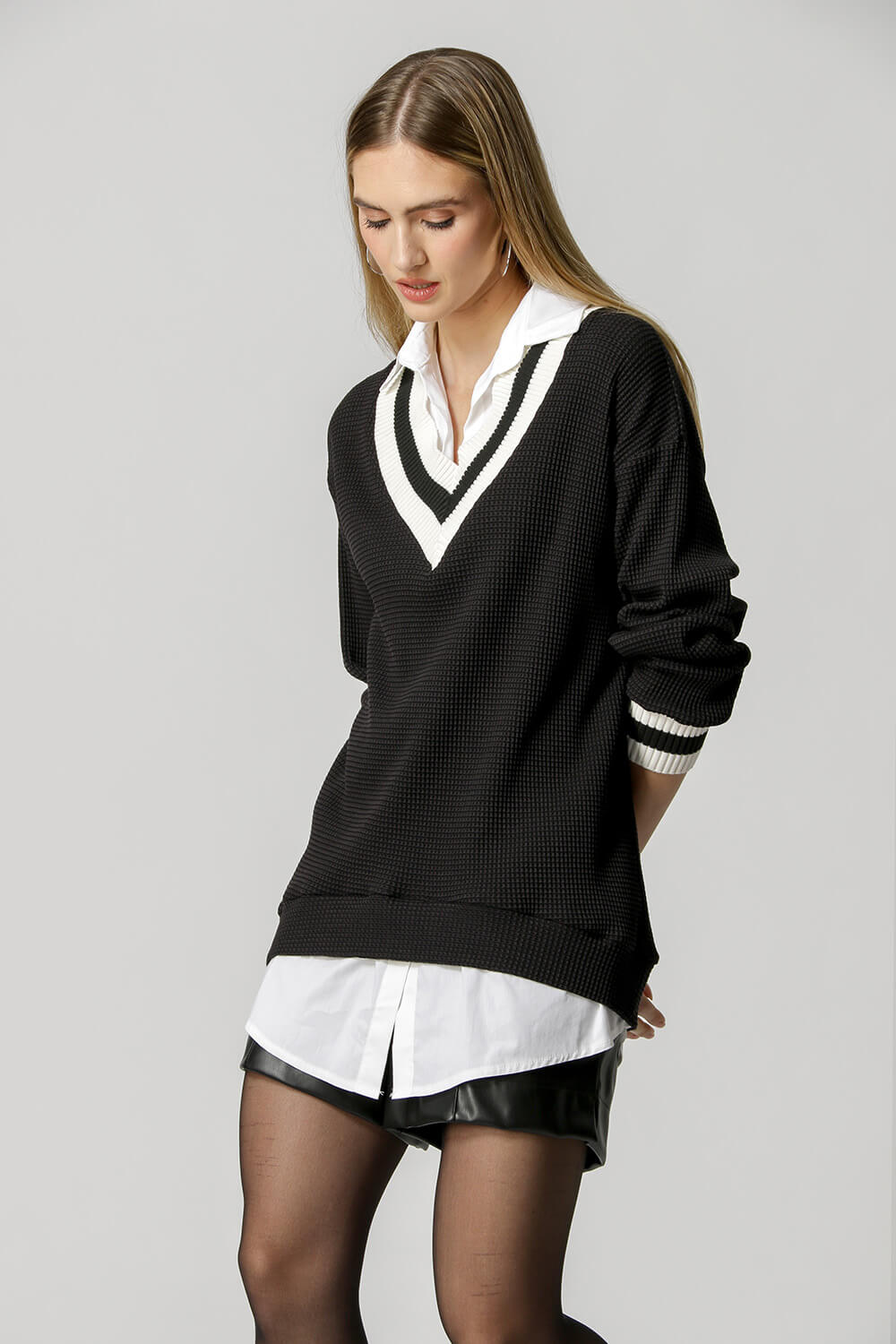 Blusa con detalle de rayas en cuello y puños con sobrecapa con cuello. Modelo confeccionado en tejido de punto con textura tricot y capa superpuesta de popelina. Una pieza súper versátil para crear diferentes looks casuales y lucir espectacular.