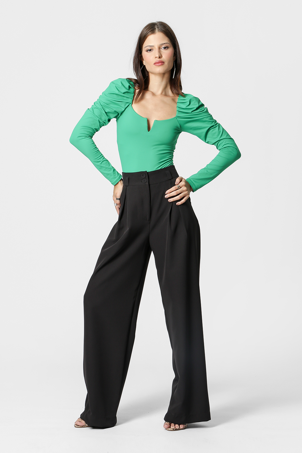 Body con mangas abullonadas y detalle de escote en pico. Pieza confeccionada en tejido de malla amni. Una pieza versátil que se puede coordinar entre sí y combina con varios looks casuales.