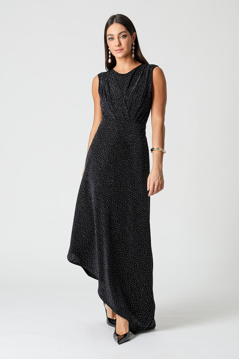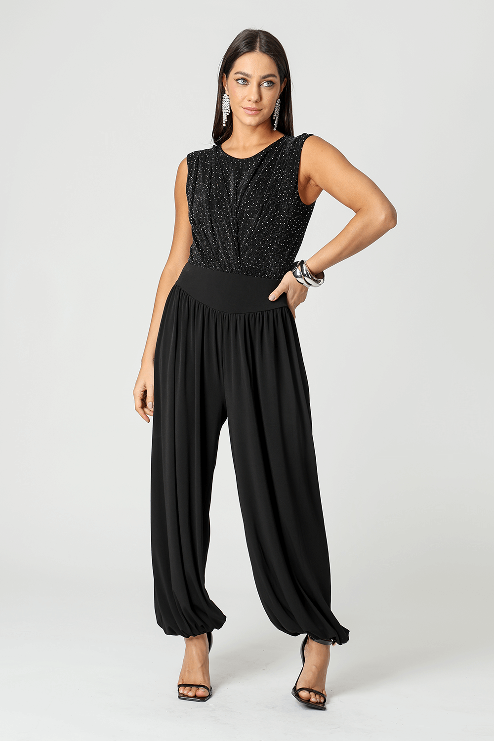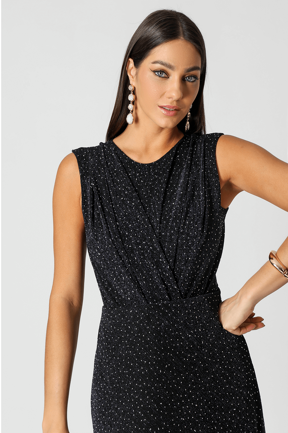 Body elegante em malha lurex com aplicação de strass, trazendo brilho sofisticado. Modelo de frente cruzada que valoriza o decote e oferece ajuste confortável ao corpo. Ideal para produções noturnas e looks festivos.