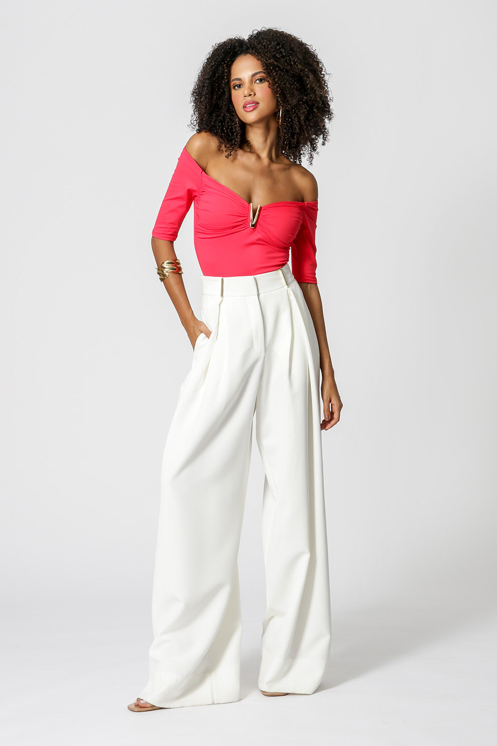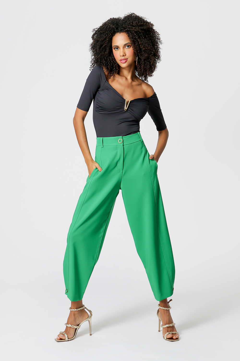 Body franzido no busto, com detalhe de fivela de metal e manga comprimento midi. Confeccionado em tecido malha amni.