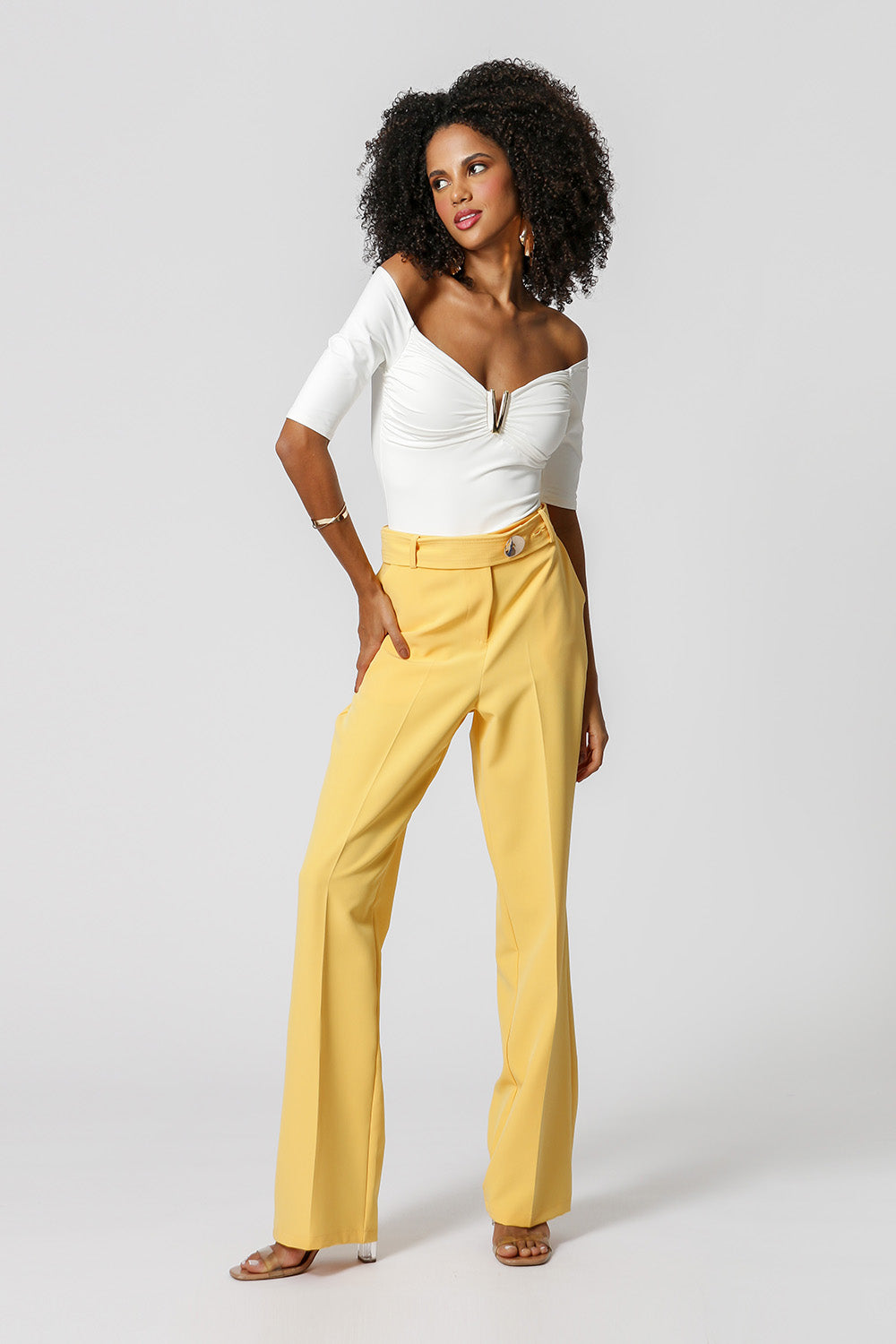 Body con busto fruncido, detalle de hebilla metálica y mangas midi. Fabricado con tejido de malla amni.