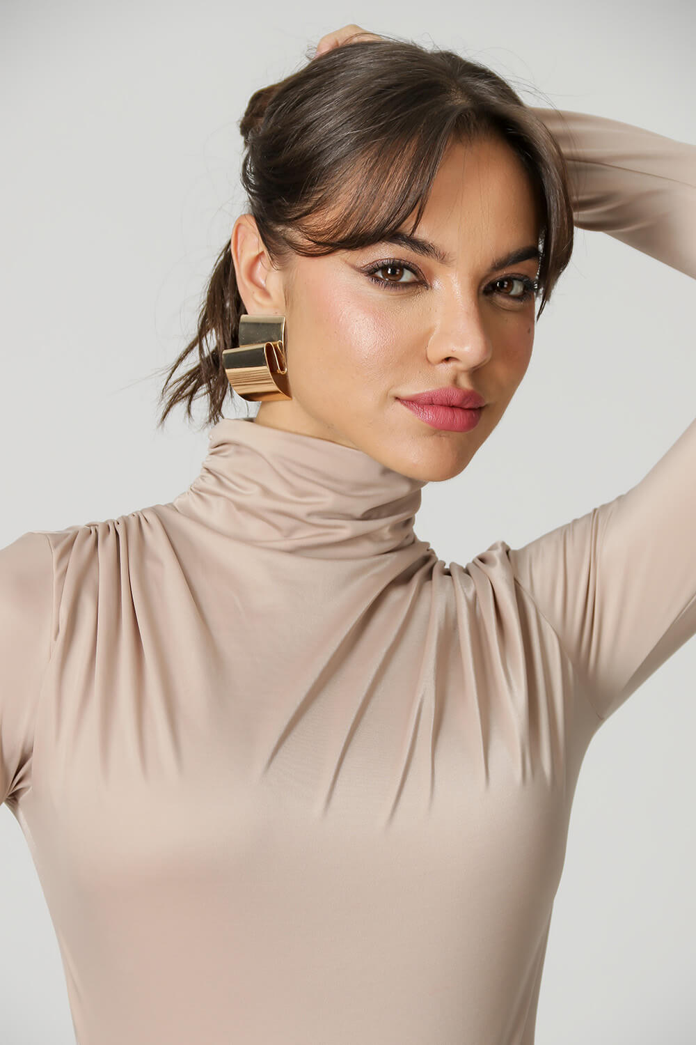 Body de manga larga con detalle fruncido en hombro y cuello. Fabricado en tejido de malla de microfibra. Un modelo ajustado que realza realmente la silueta femenina, perfecto para salir por la noche.