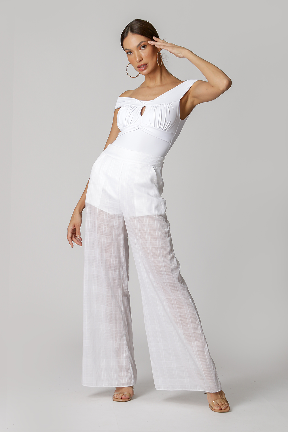 Body confeccionado en tejido de poliamida, con escote hombro descubierto y detalles fruncidos y calados. Tiene copa y cierre de gancho y ojo ajustable. Ideal para muchas ocasiones.
