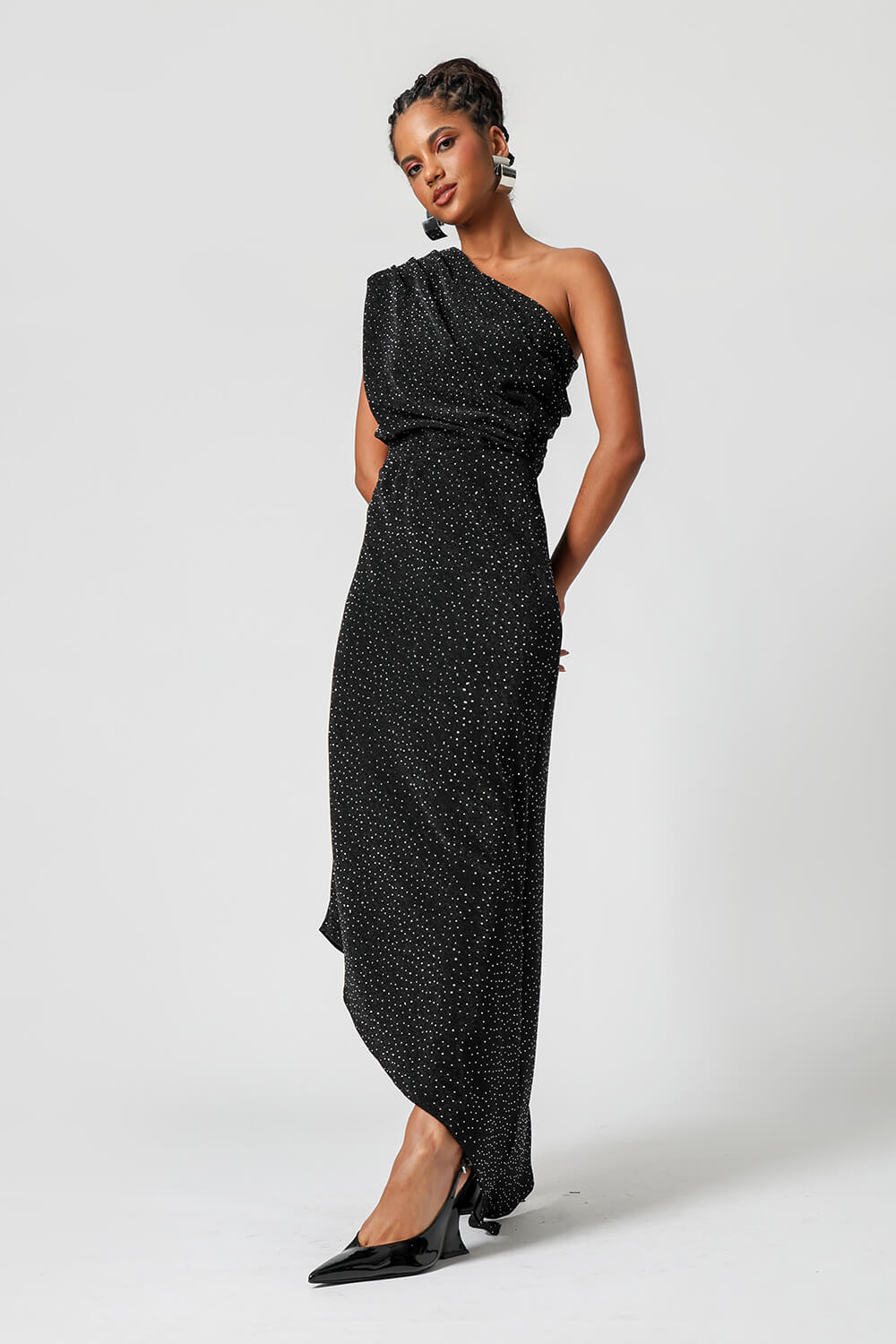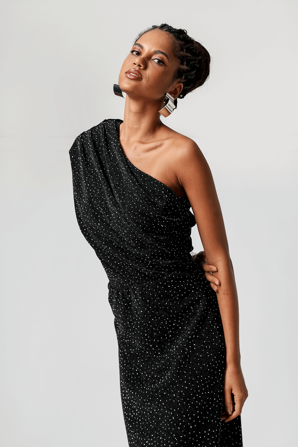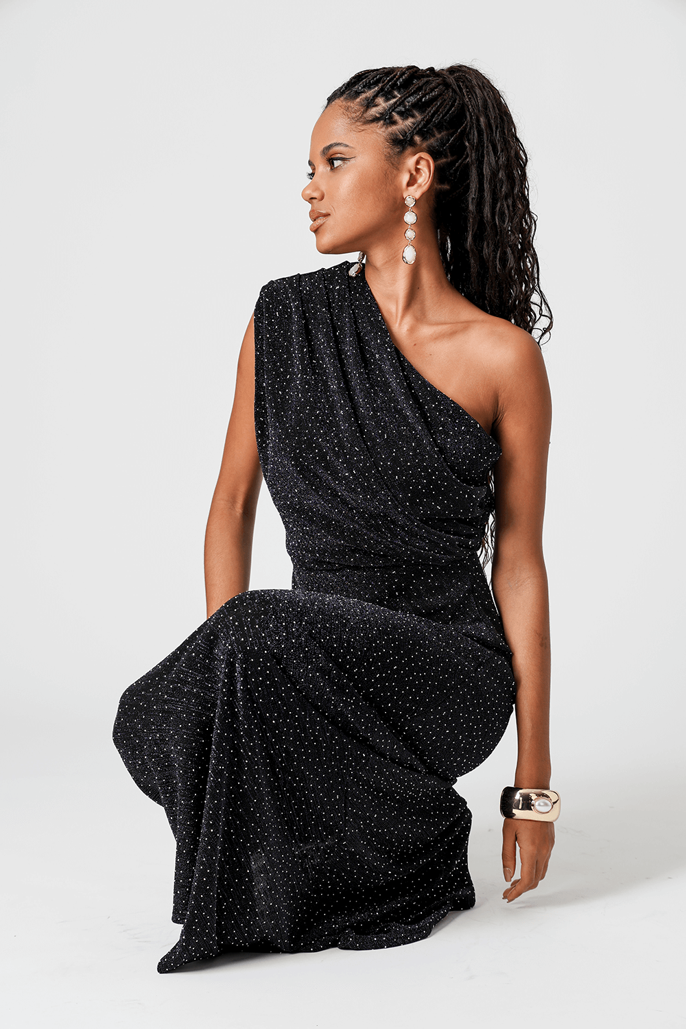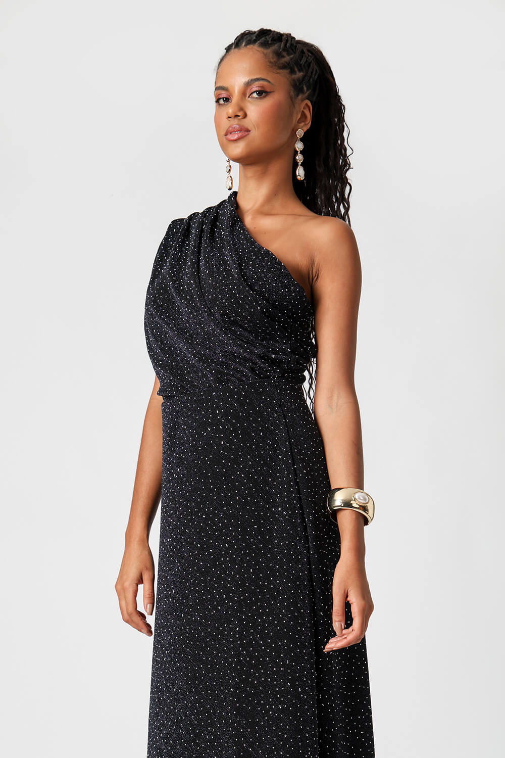 Body elegante de um ombro único confeccionado em malha lurex, com pedrarias aplicadas por toda a peça. Possui pregas no ombro que formam um elegante drapeado frontal com efeito blusado. Toque sofisticado, caimento perfeito e muito brilho para produções marcantes.