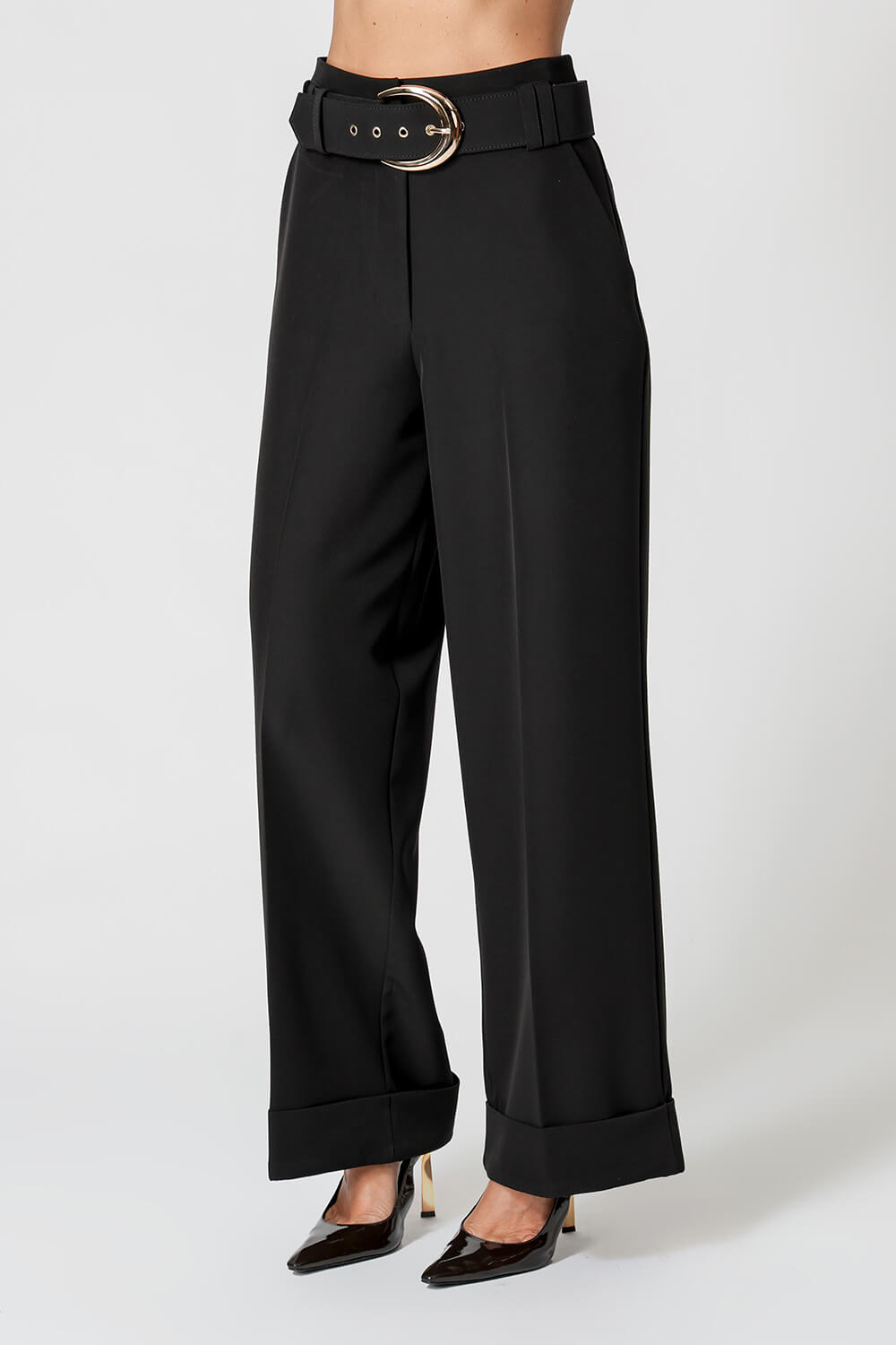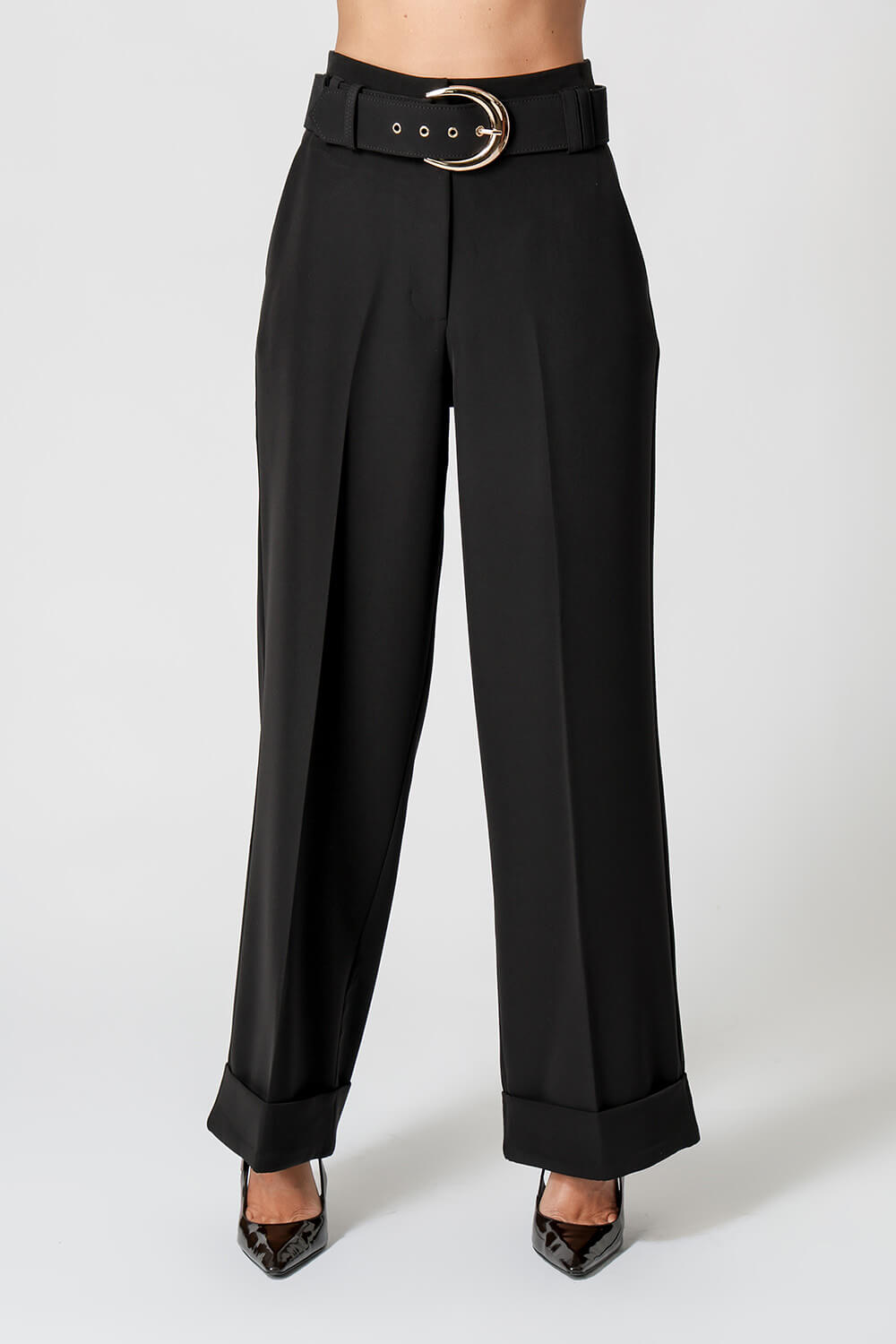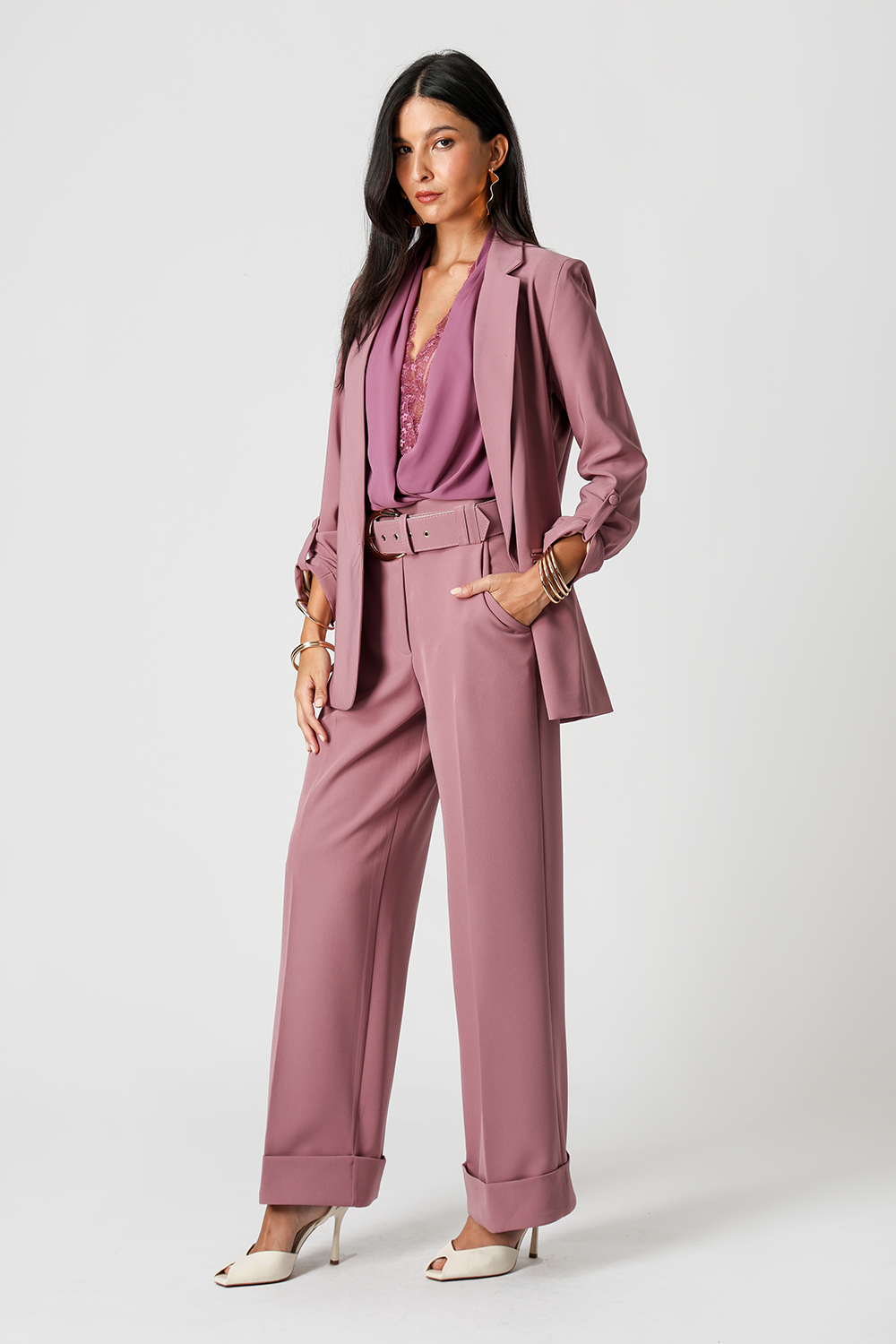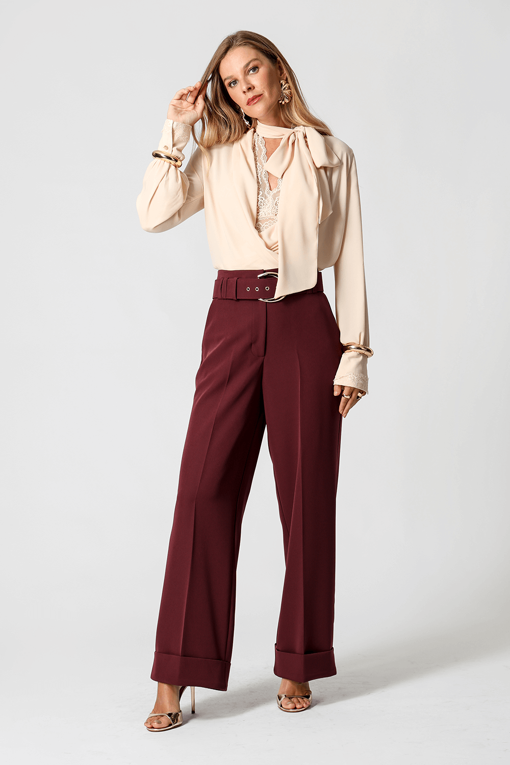 Calça reta de alfaiataria com barra larga, vincos frontais e posteriores que alongam a silhueta. Acompanha cinto com fivela dourada, trazendo elegância e acabamento sofisticado para produções formais ou modernas.