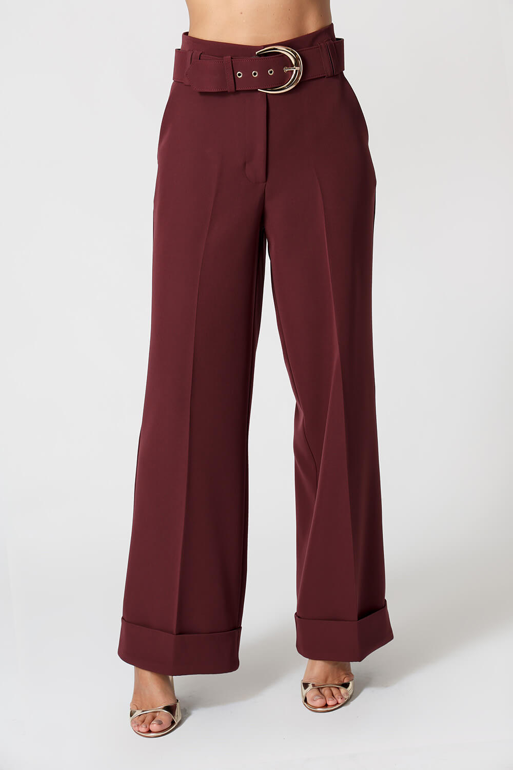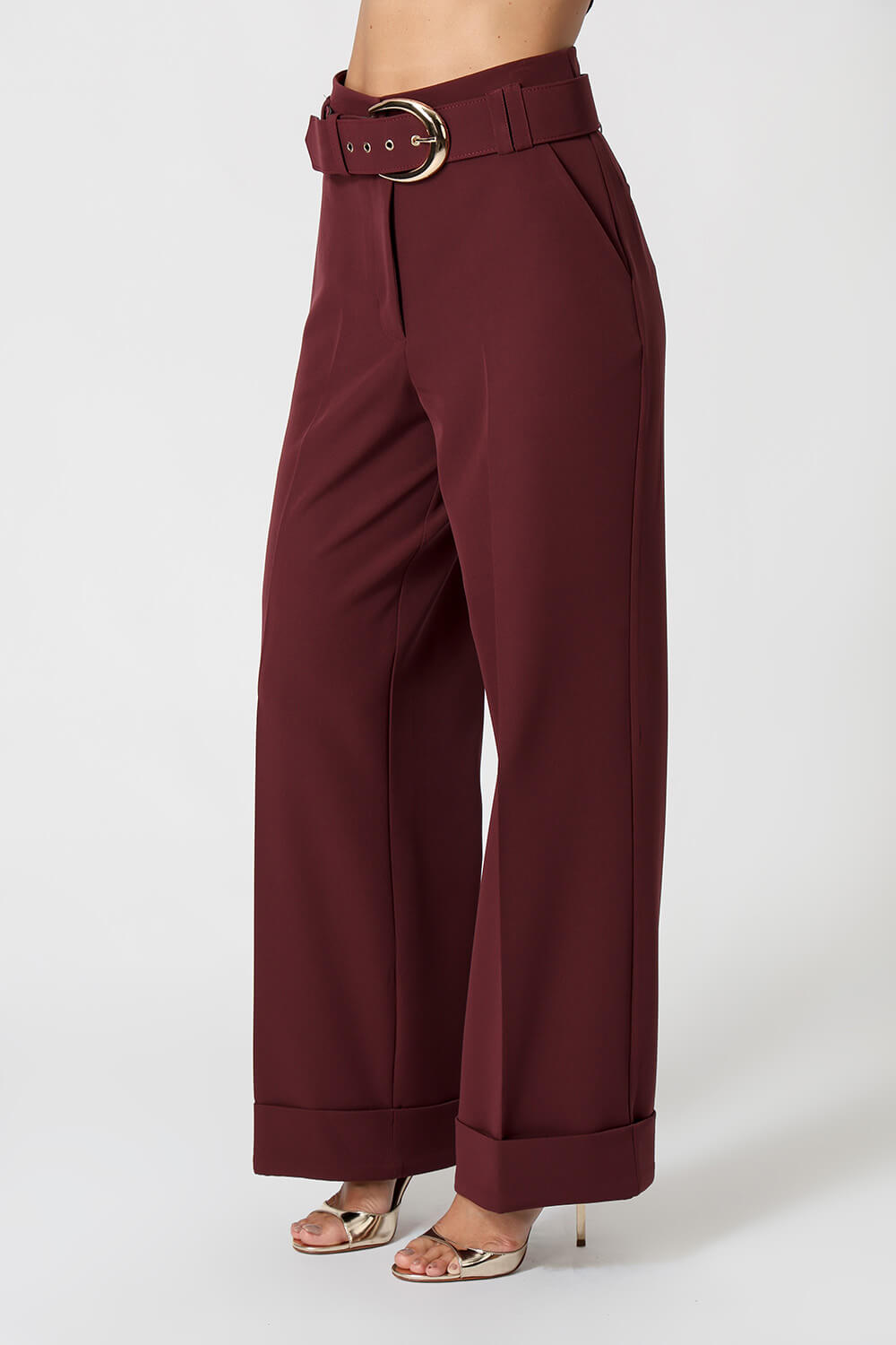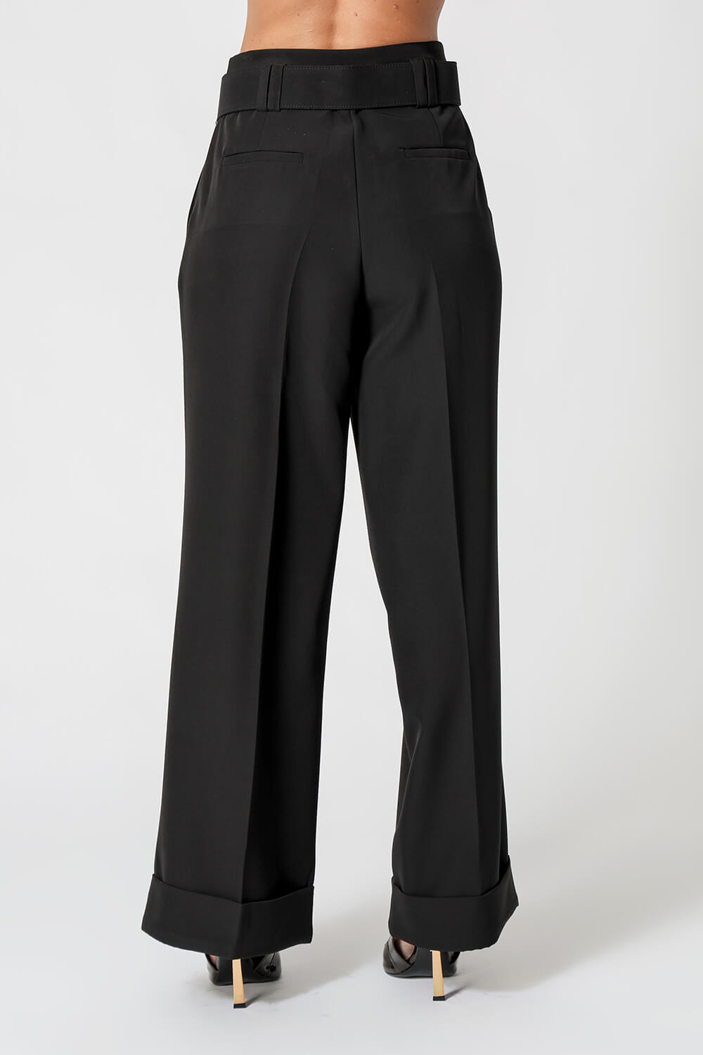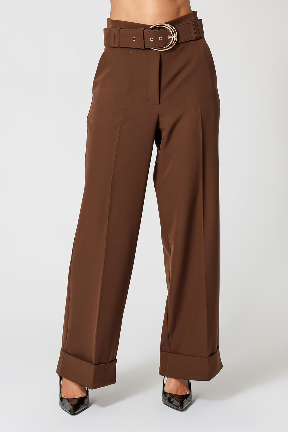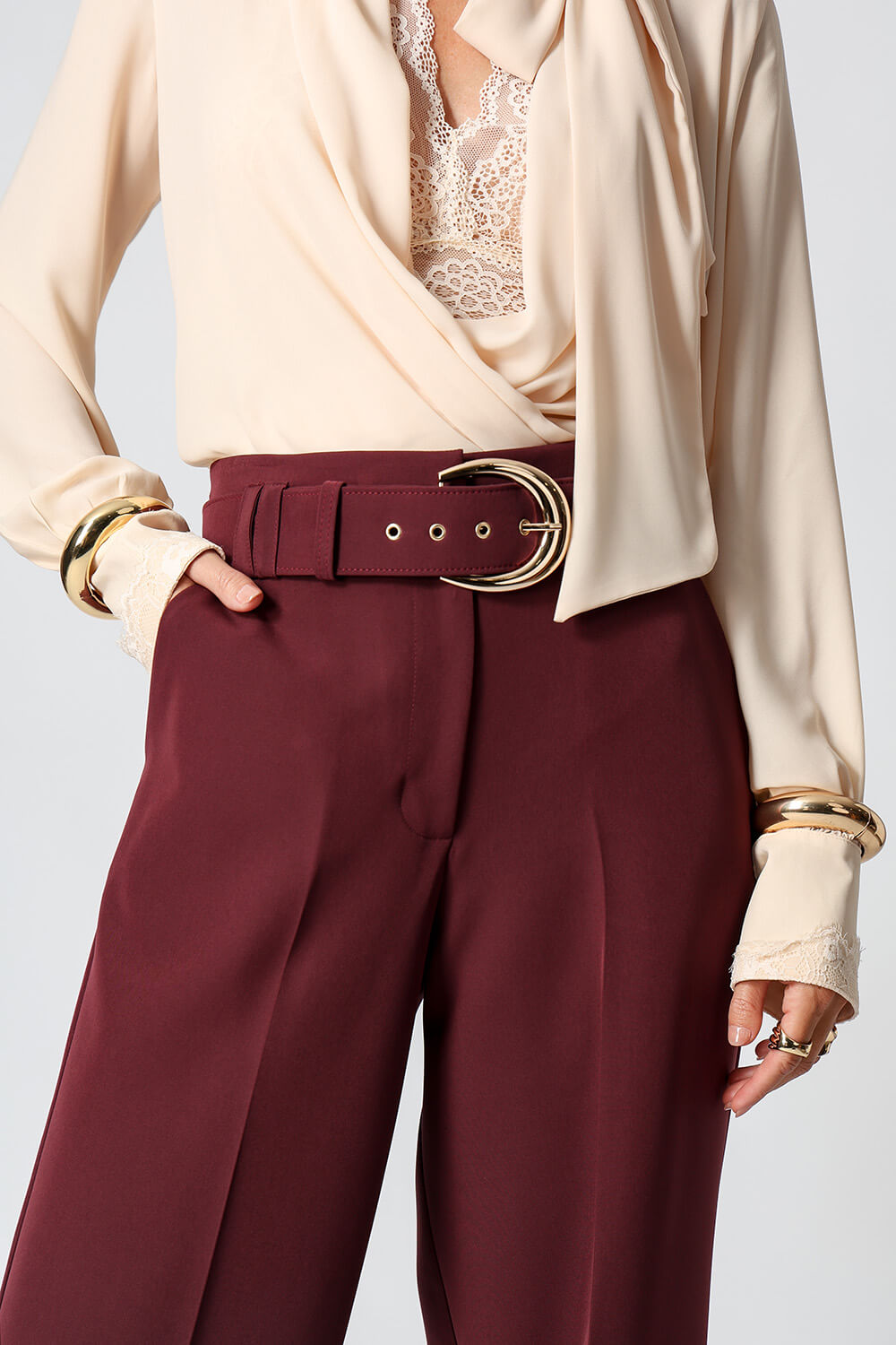 Calça reta de alfaiataria com barra larga, vincos frontais e posteriores que alongam a silhueta. Acompanha cinto com fivela dourada, trazendo elegância e acabamento sofisticado para produções formais ou modernas.