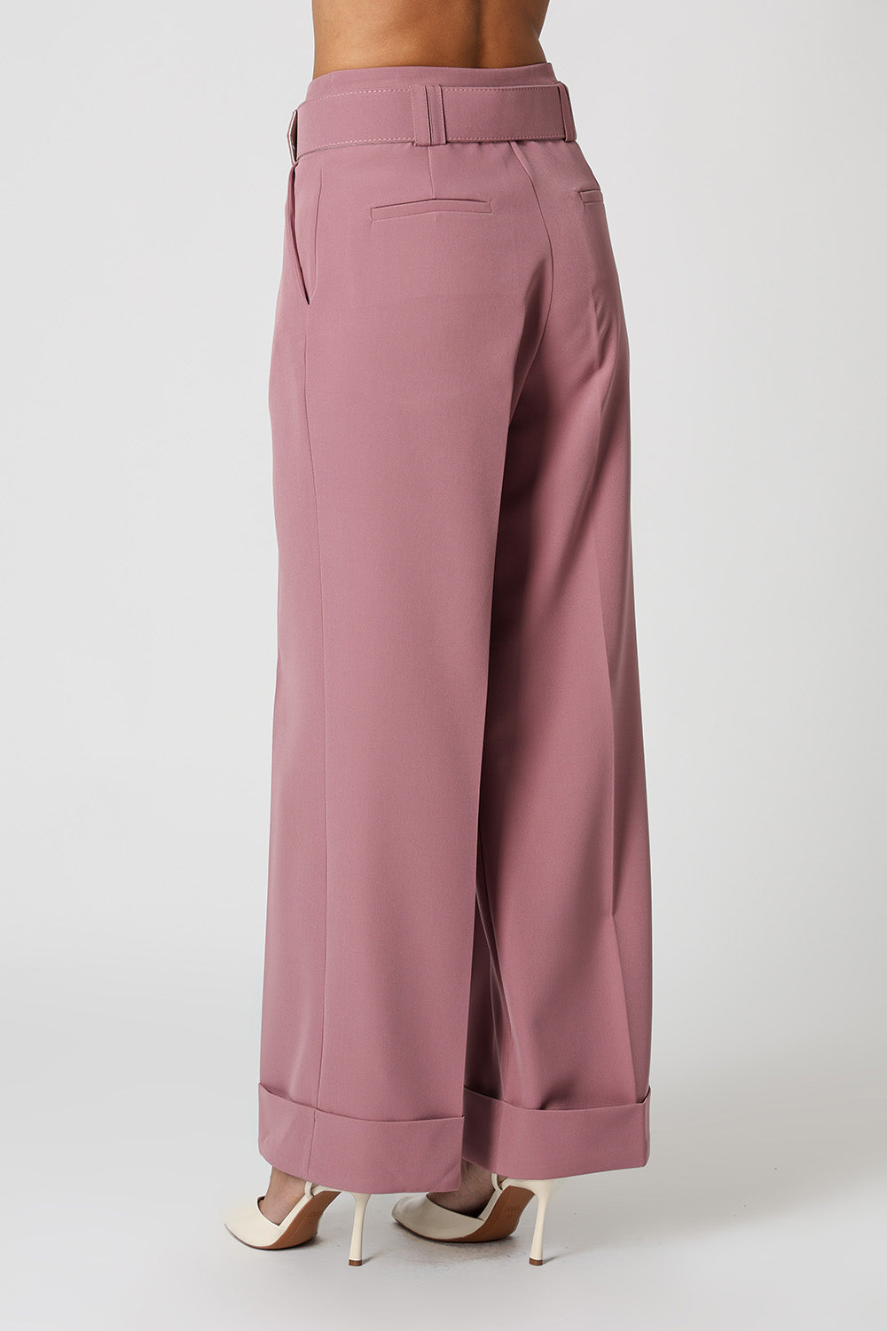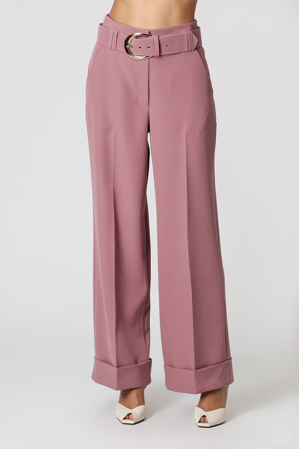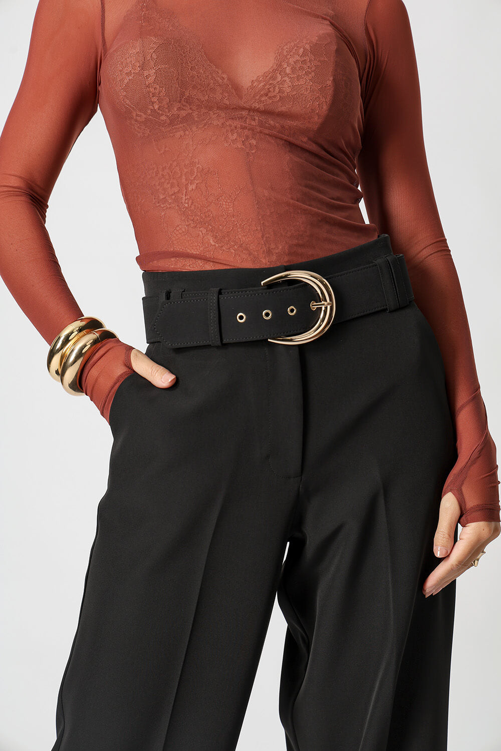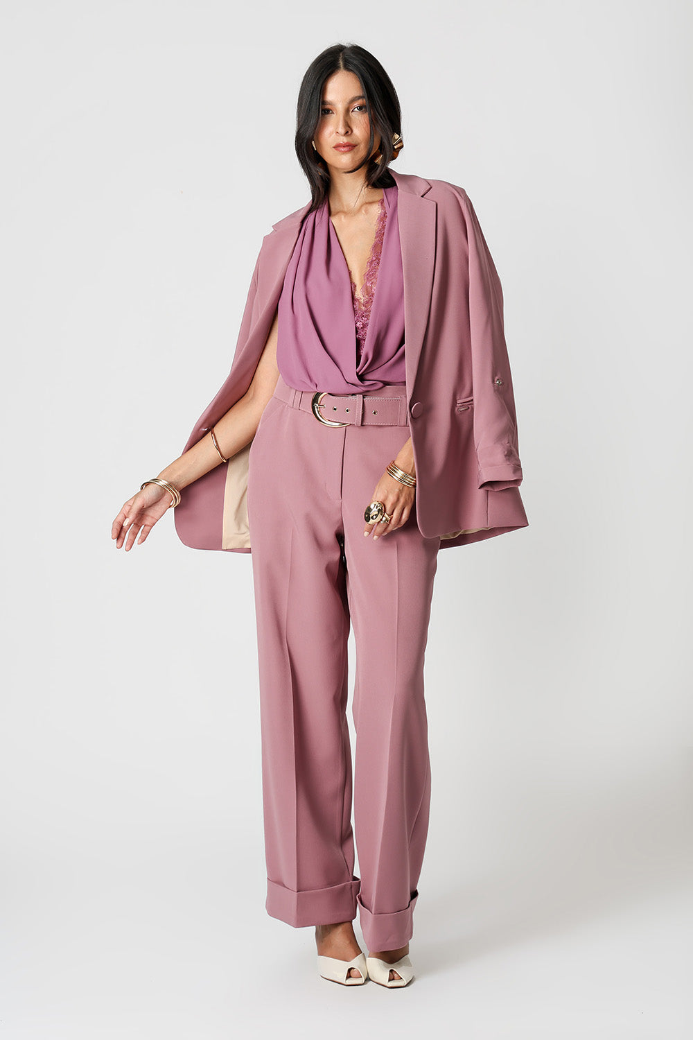 Calça reta de alfaiataria com barra larga, vincos frontais e posteriores que alongam a silhueta. Acompanha cinto com fivela dourada, trazendo elegância e acabamento sofisticado para produções formais ou modernas.