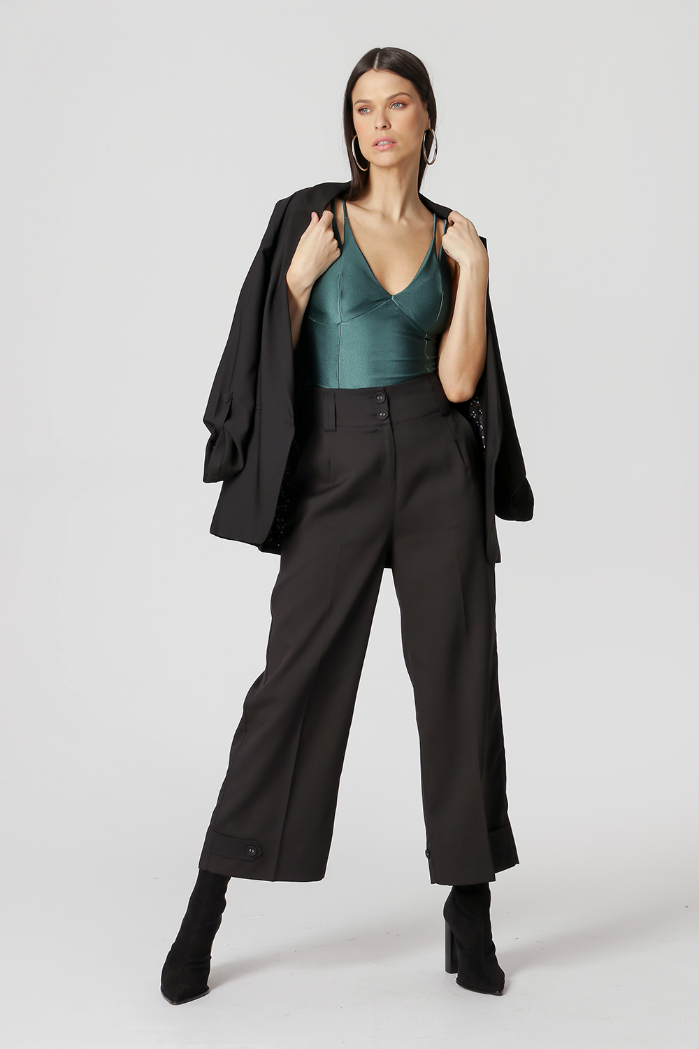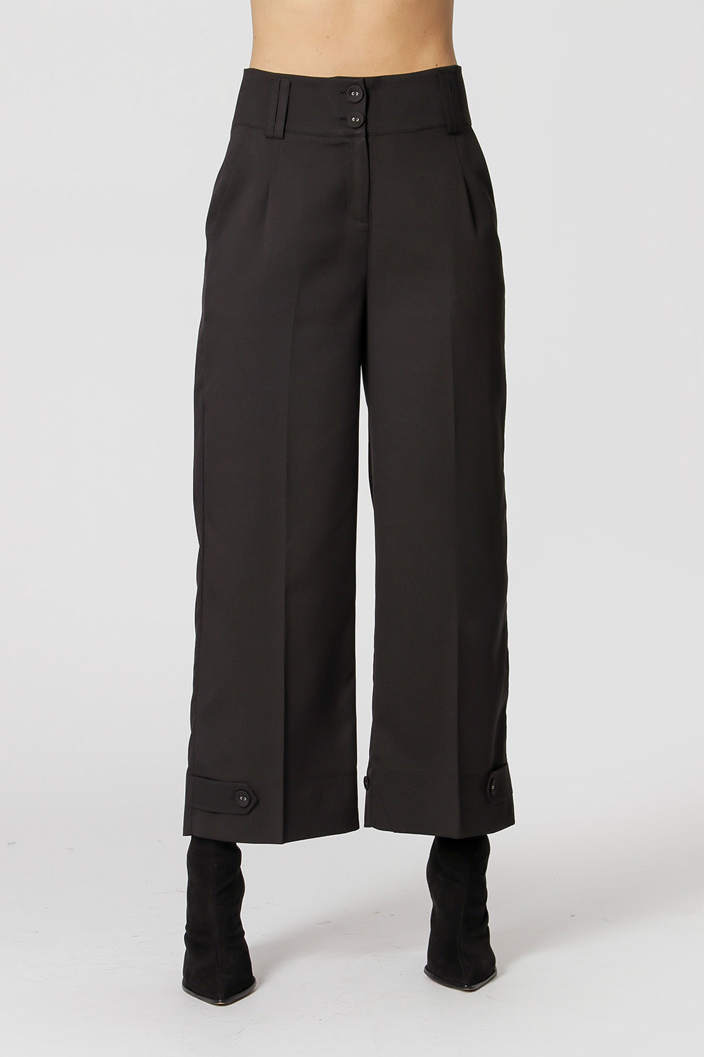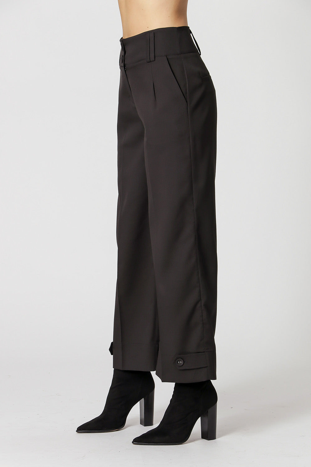 Pantalones entallados con la idea de dos formas, la idea de pierna ancha es cuando la martingala se ajusta más suelta y la idea de forma de zanahoria cuando se ajusta más apretada. Equipado con una cinturilla más ancha, trabillas dobles para el cinturón y pliegues cosidos, con bolsillos laterales y piernas fruncidas. Es una pieza súper versátil que combina con todo tipo de estilos, pudiendo llevarse de forma más elegante o incluso más casual.