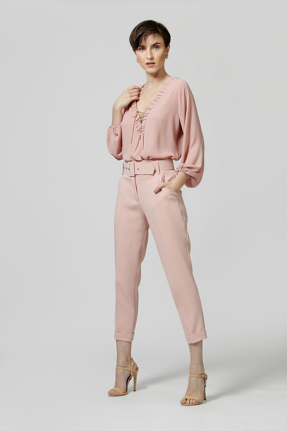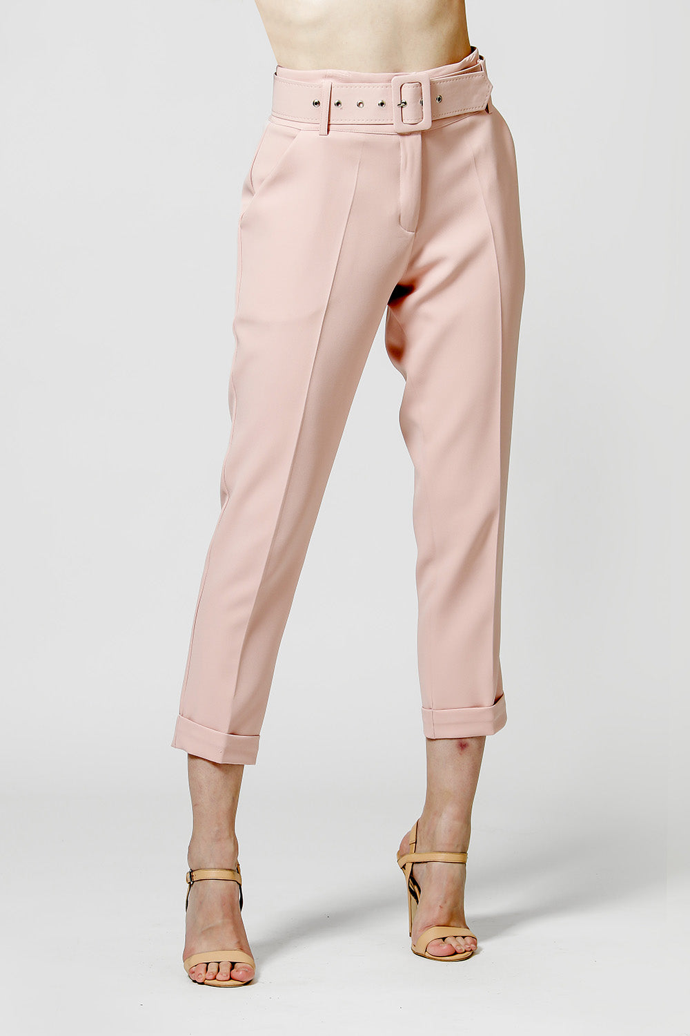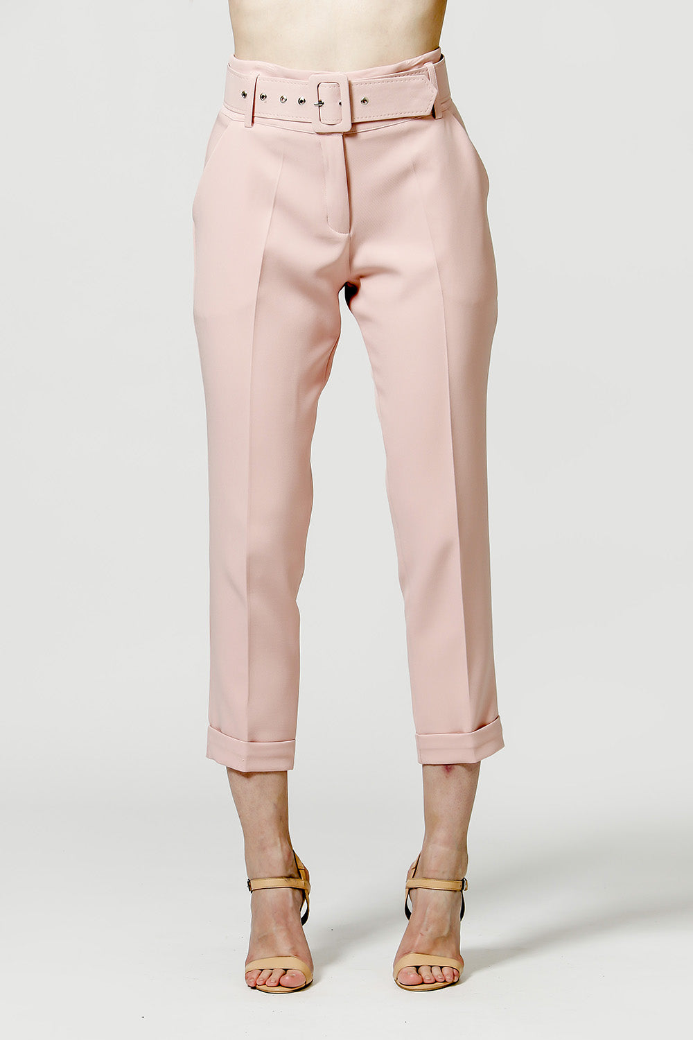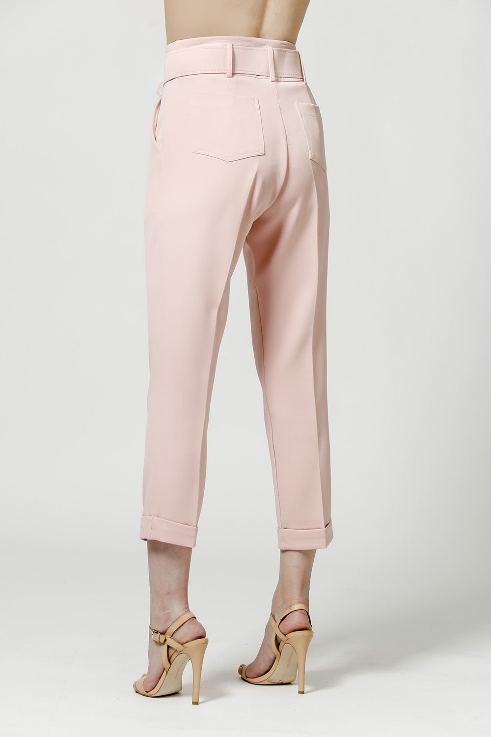 Pantalón entallado, con corte ligeramente zanahoria, con detalle de bajo italiano, acompañado de un precioso cinturón forrado del mismo tejido, una pieza súper versátil para diferentes looks.