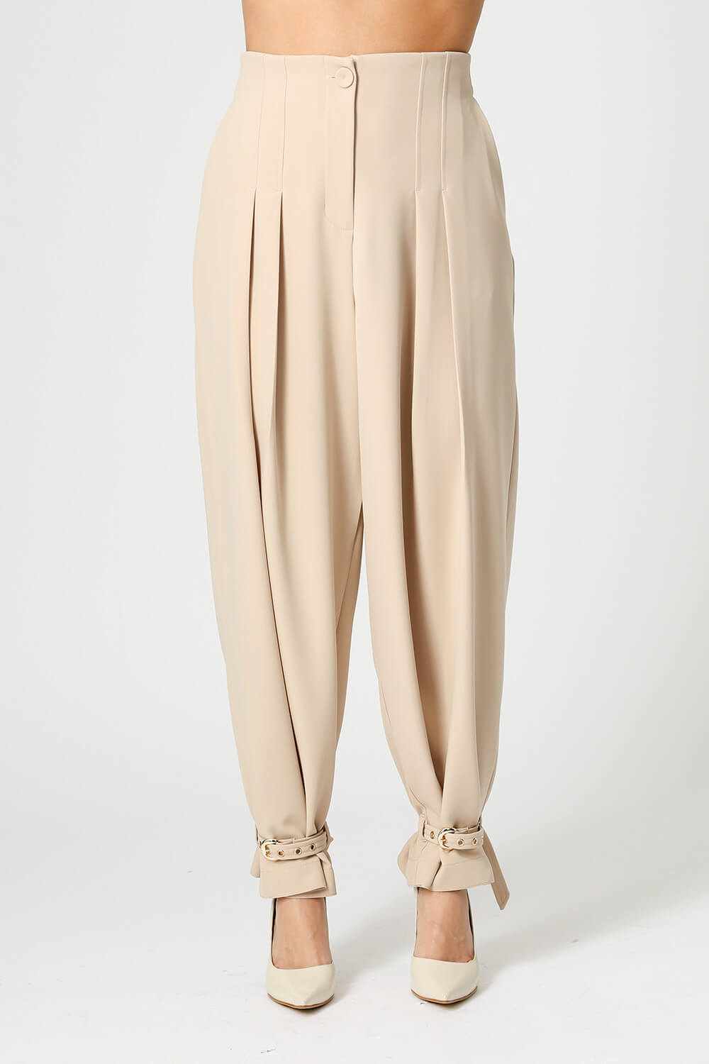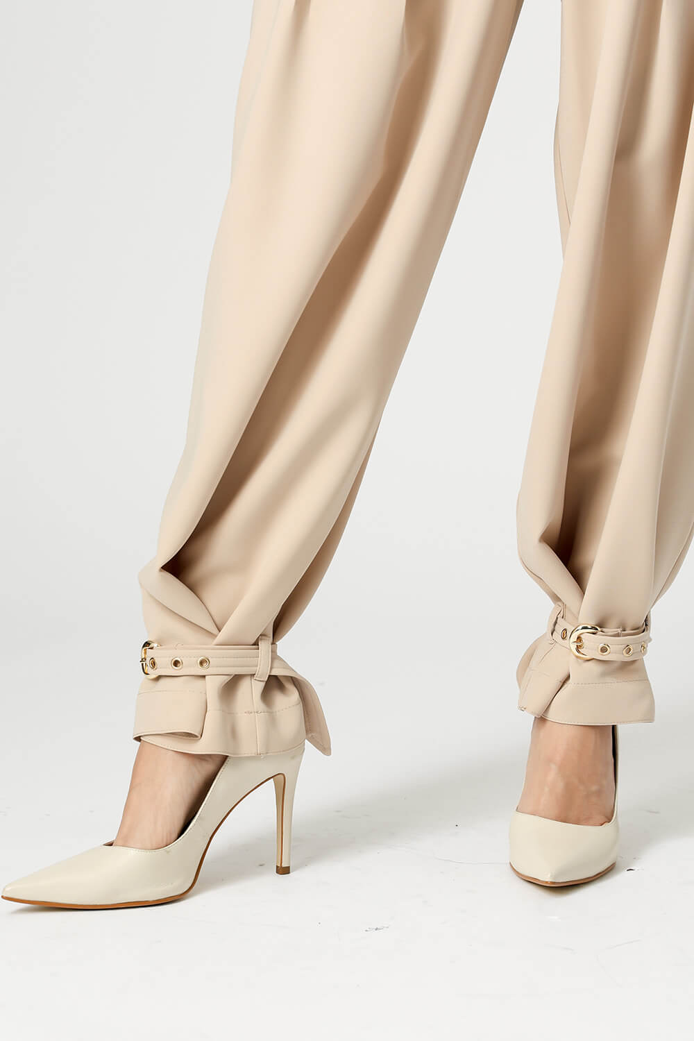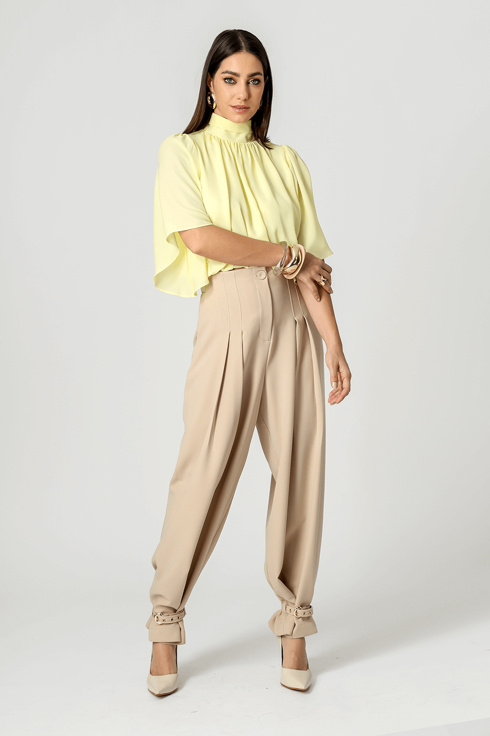 Elegante e versátil, esta calça de alfaiataria possui pregas frontais e cintos removíveis e ajustáveis na barra. Possui pregas nas costas que garantem um caimento perfeito. Feita em tecido alfaiataria fluido, oferece conforto e leveza, ideal para looks formais e casuais.