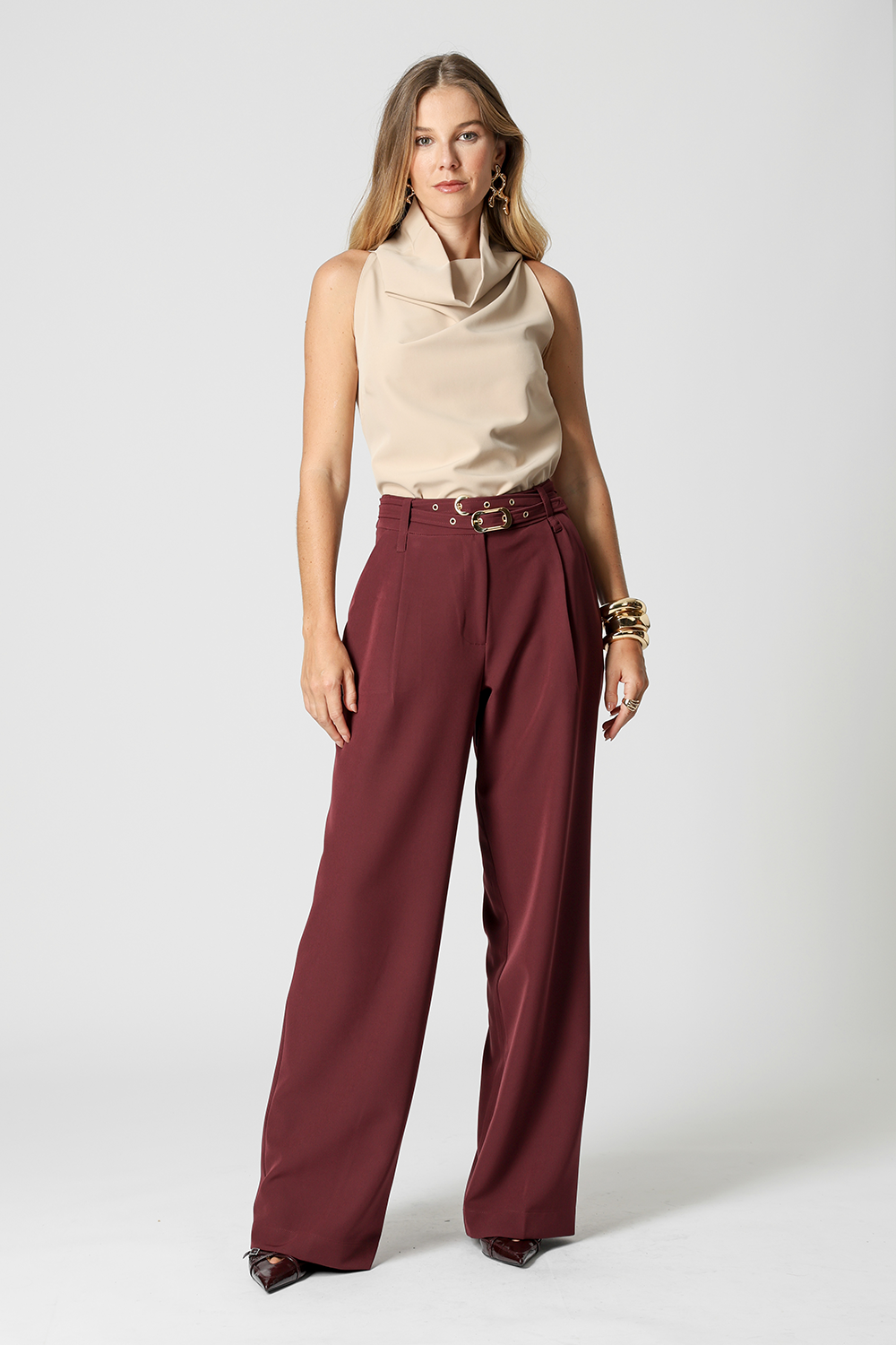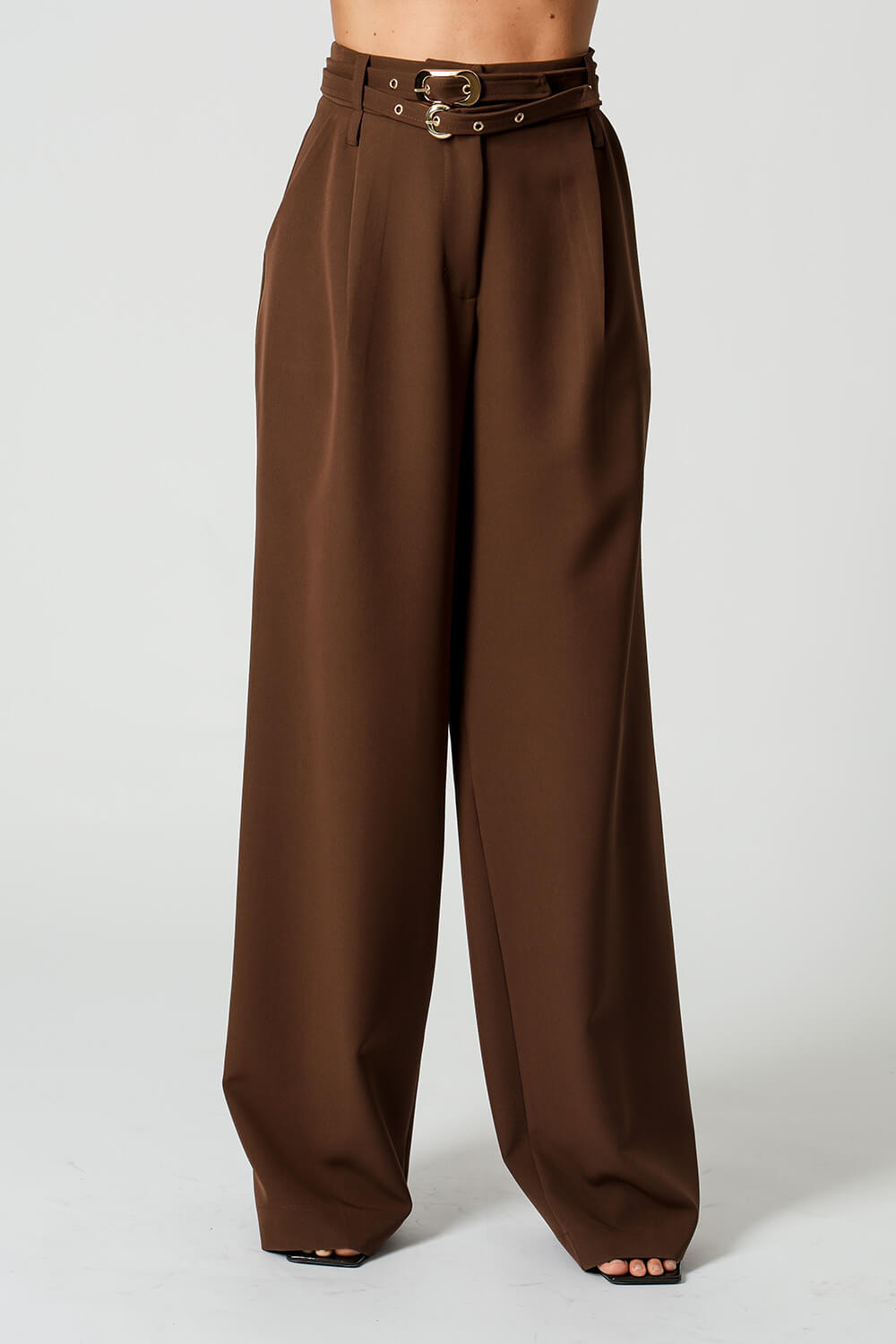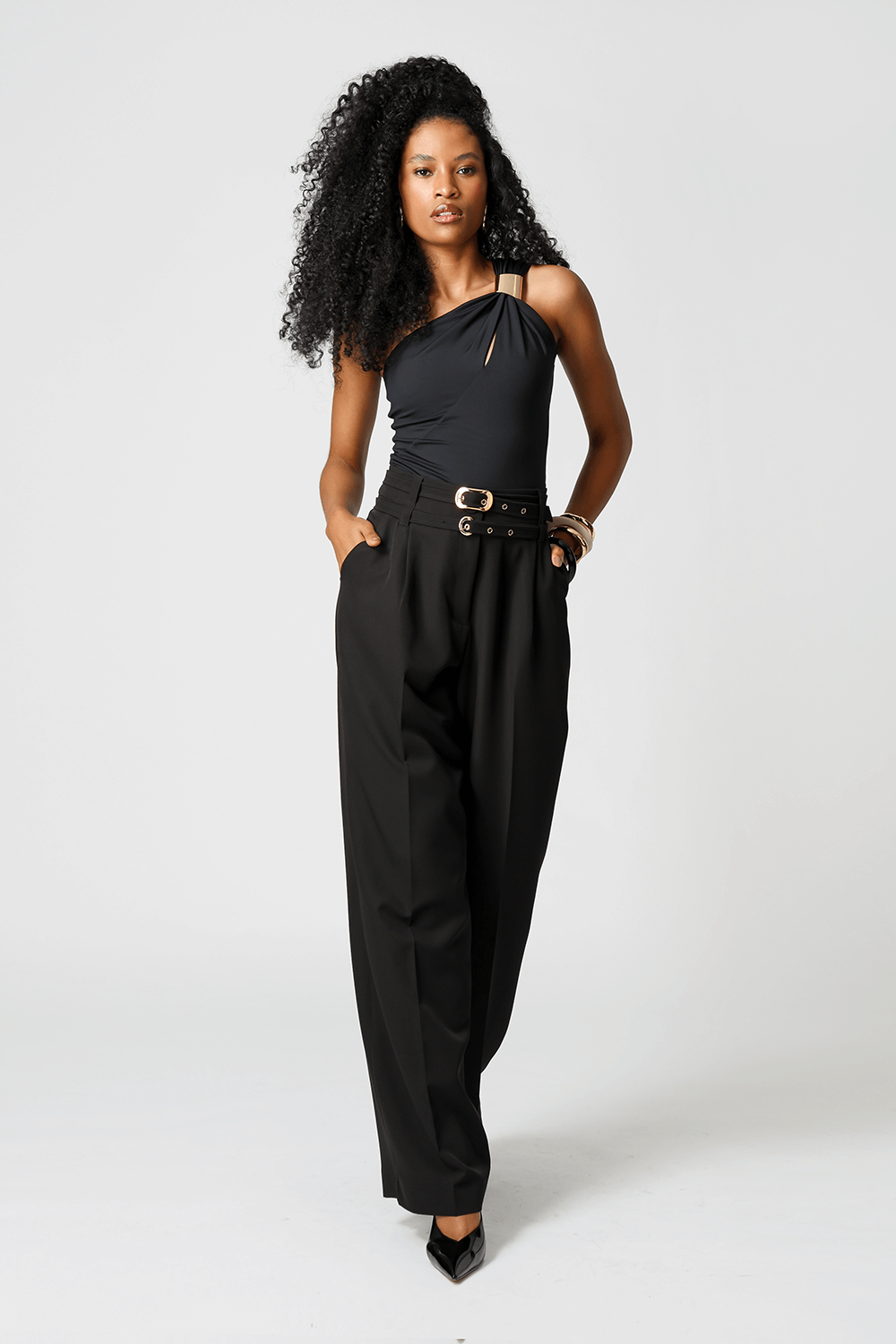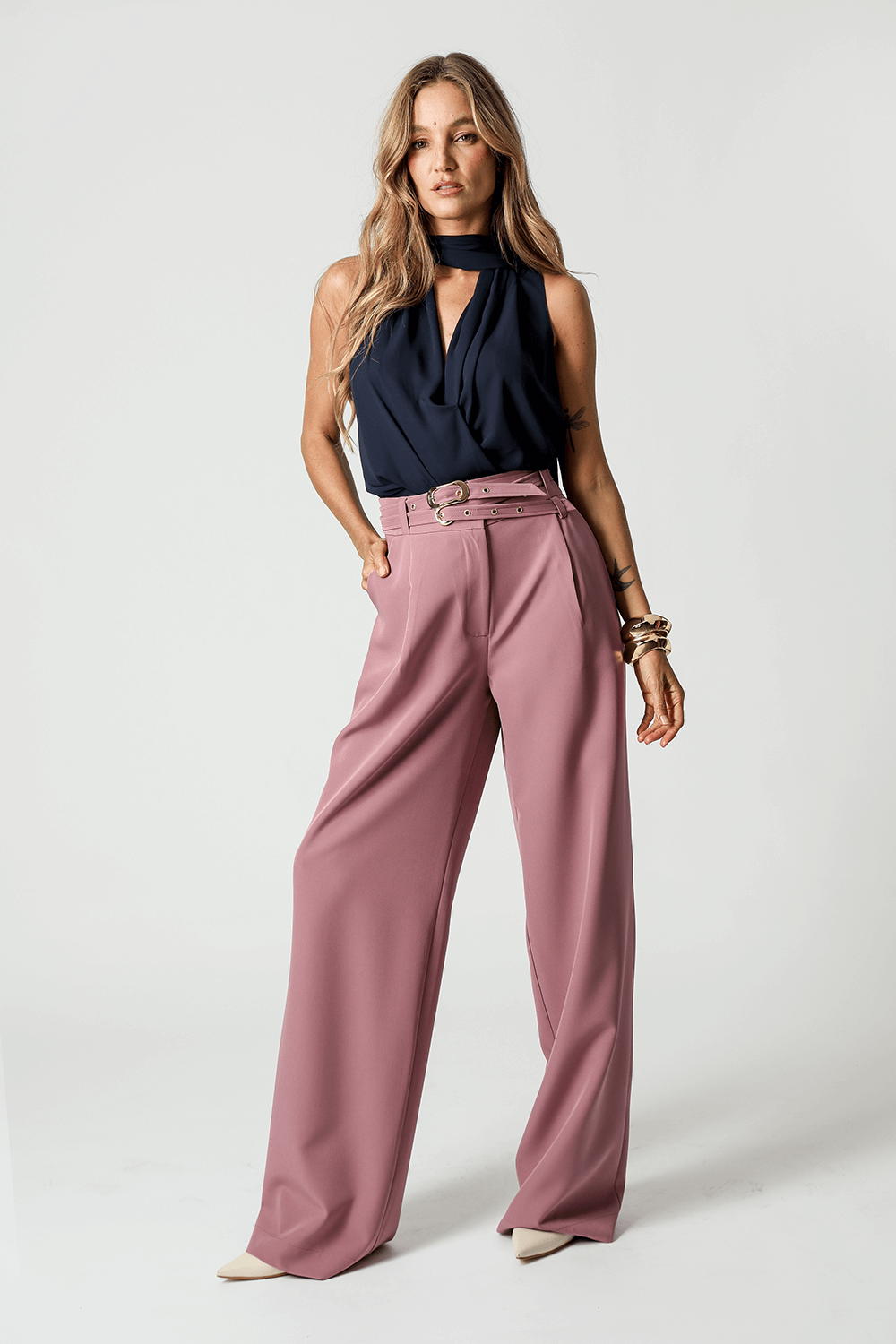 Calça de alfaiataria com pregas frontais e dois cintos removíveis com fivelas distintas. Versátil e elegante, perfeita para compor looks sofisticados com um toque de personalidade.