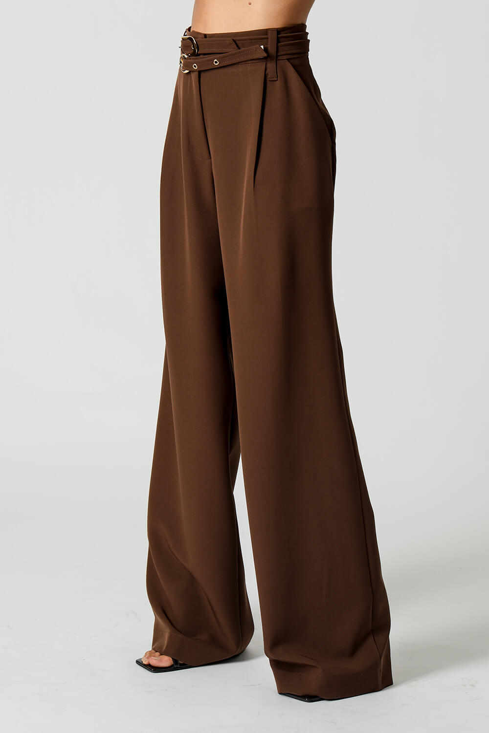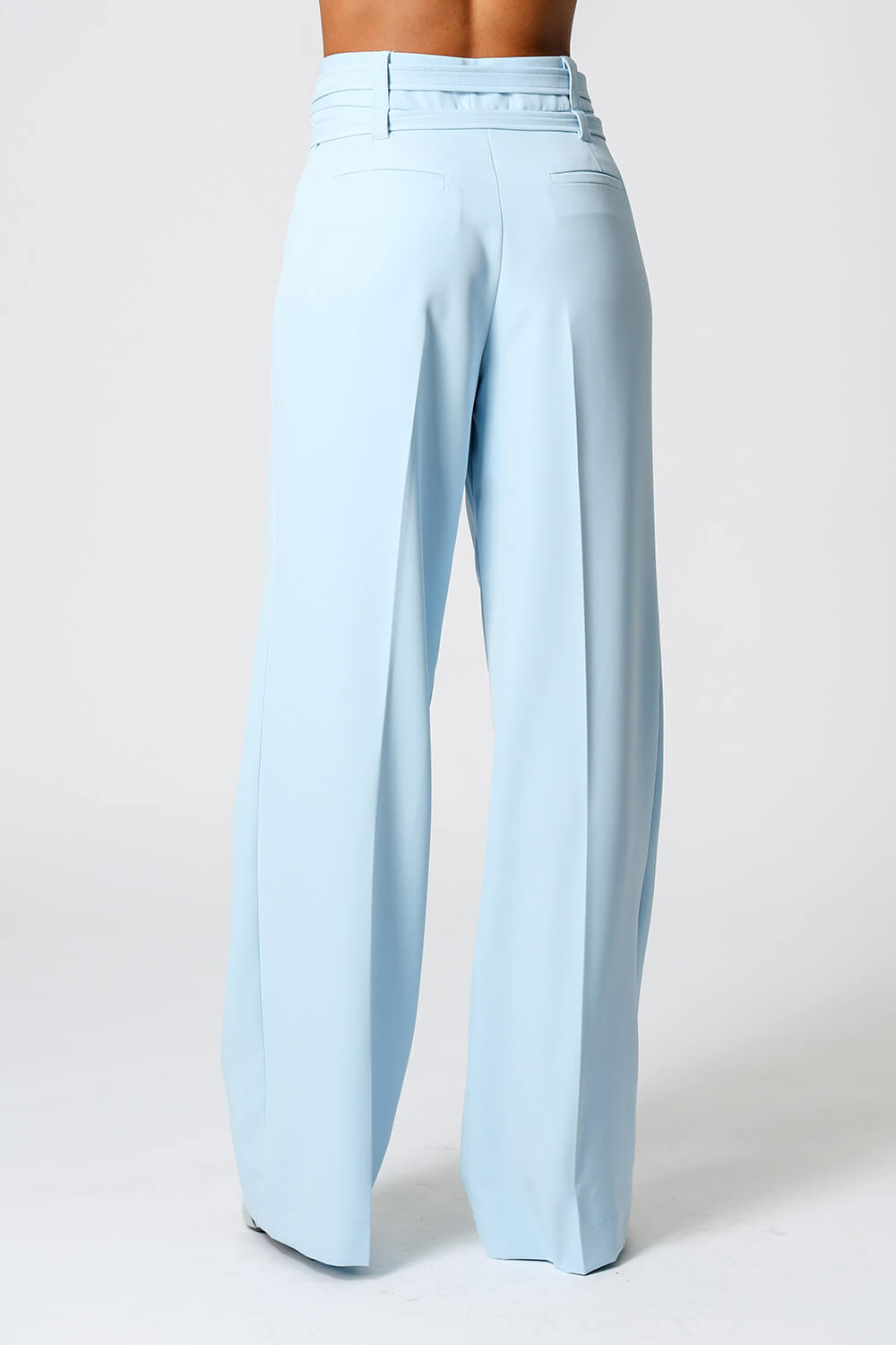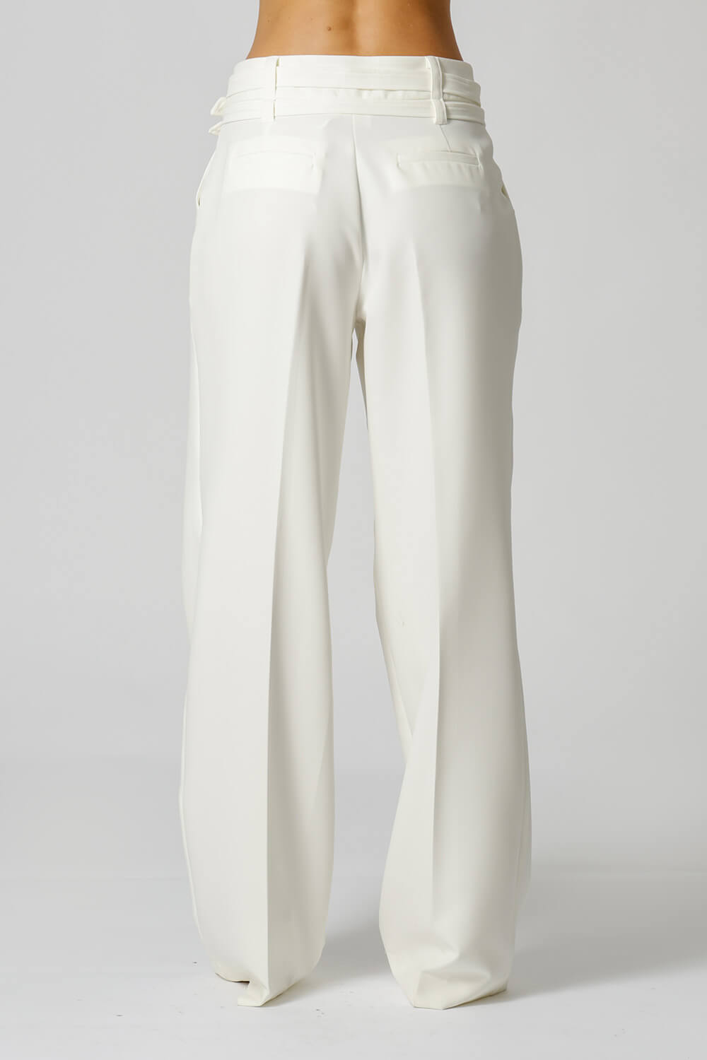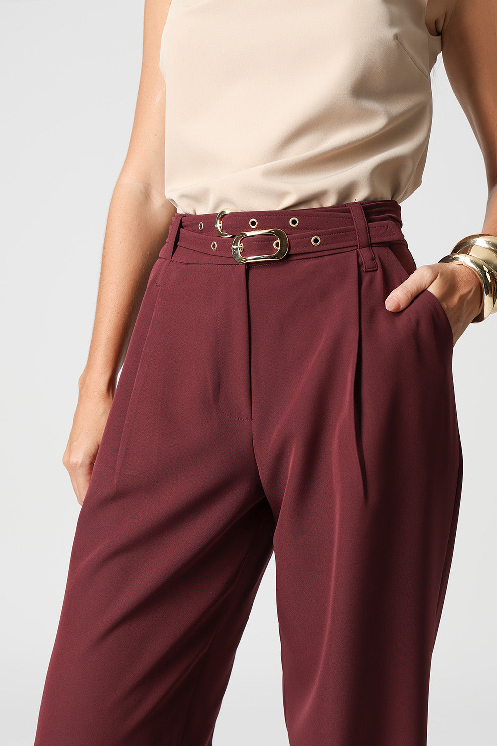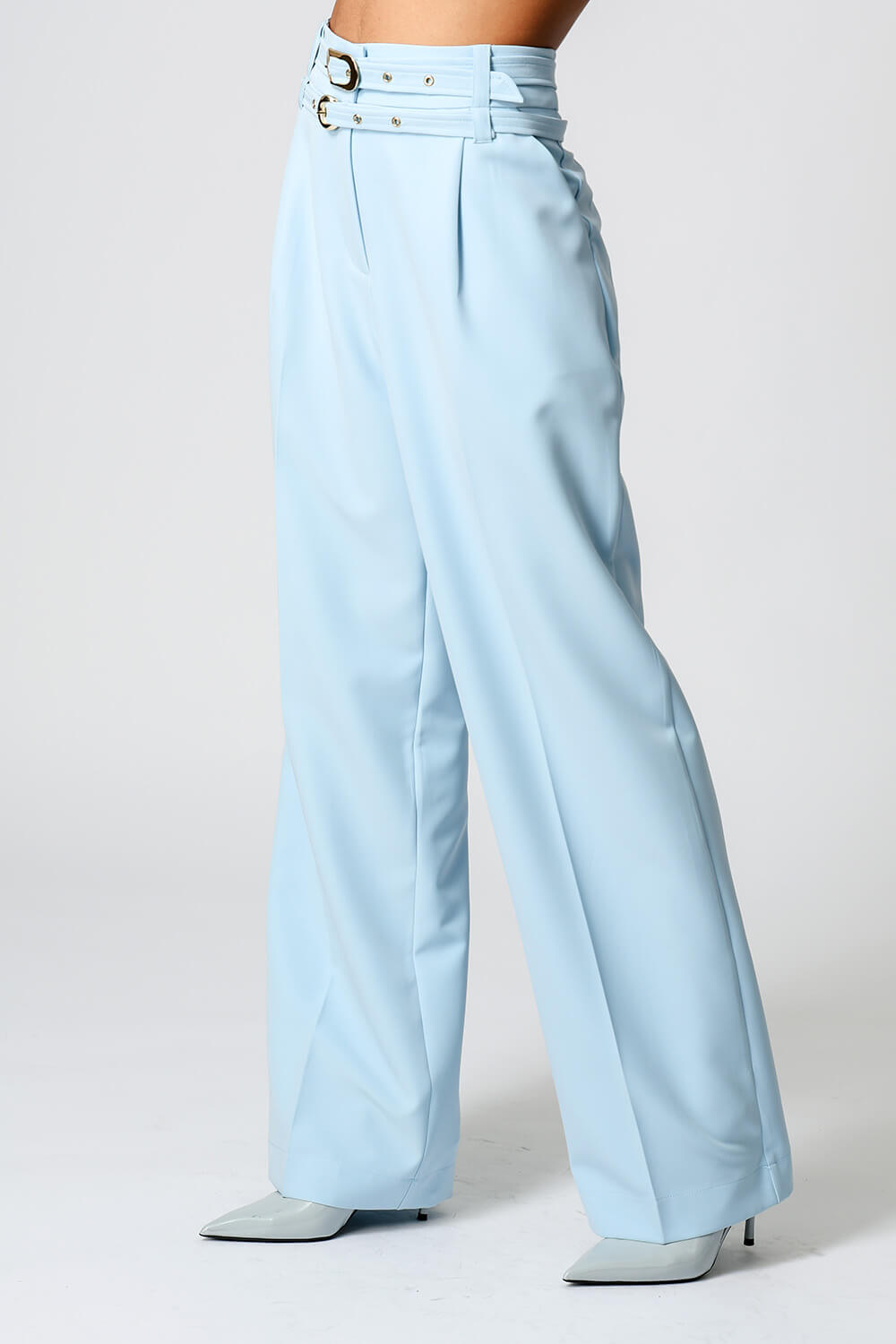 Calça de alfaiataria com pregas frontais e dois cintos removíveis com fivelas distintas. Versátil e elegante, perfeita para compor looks sofisticados com um toque de personalidade.