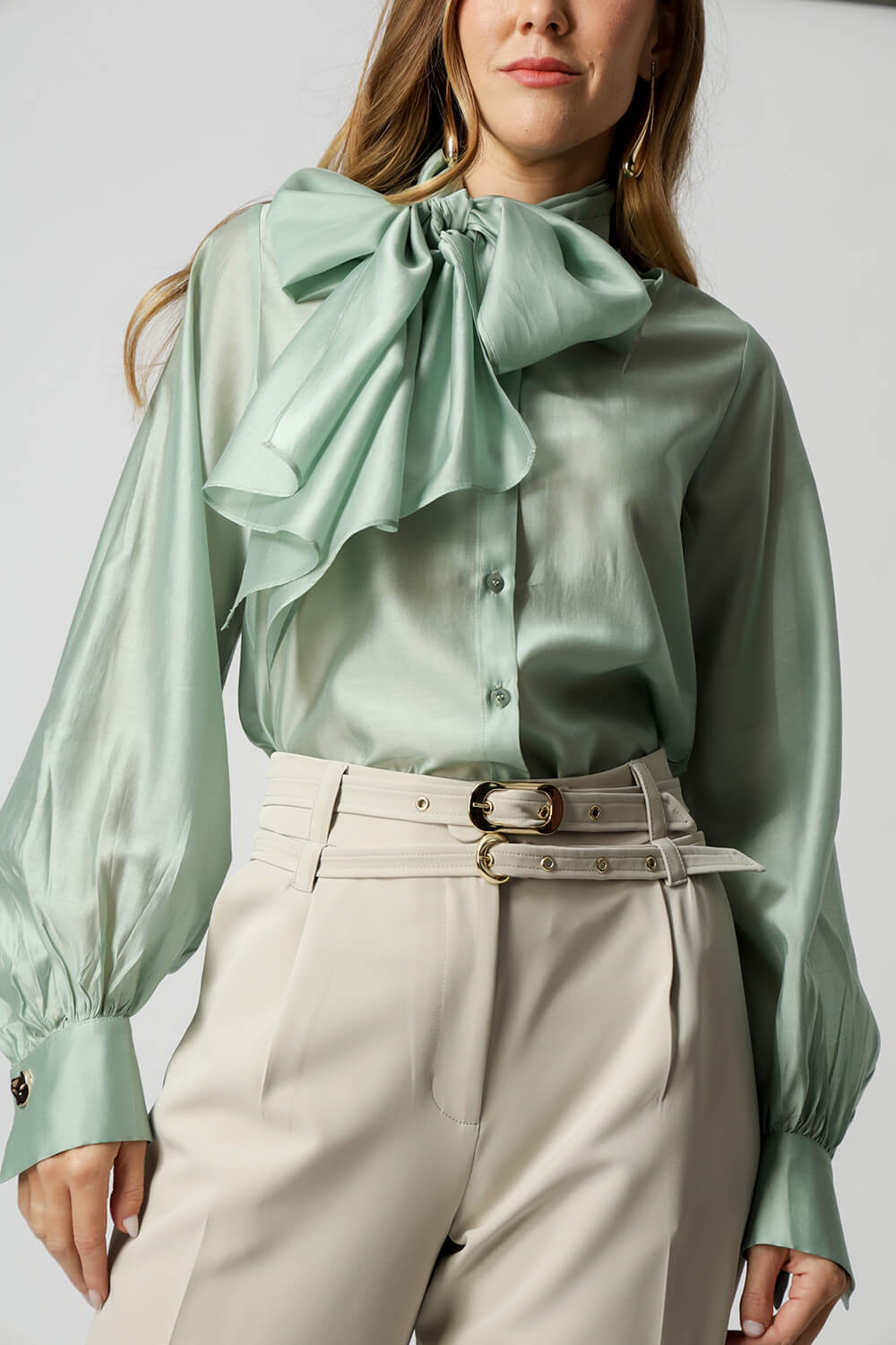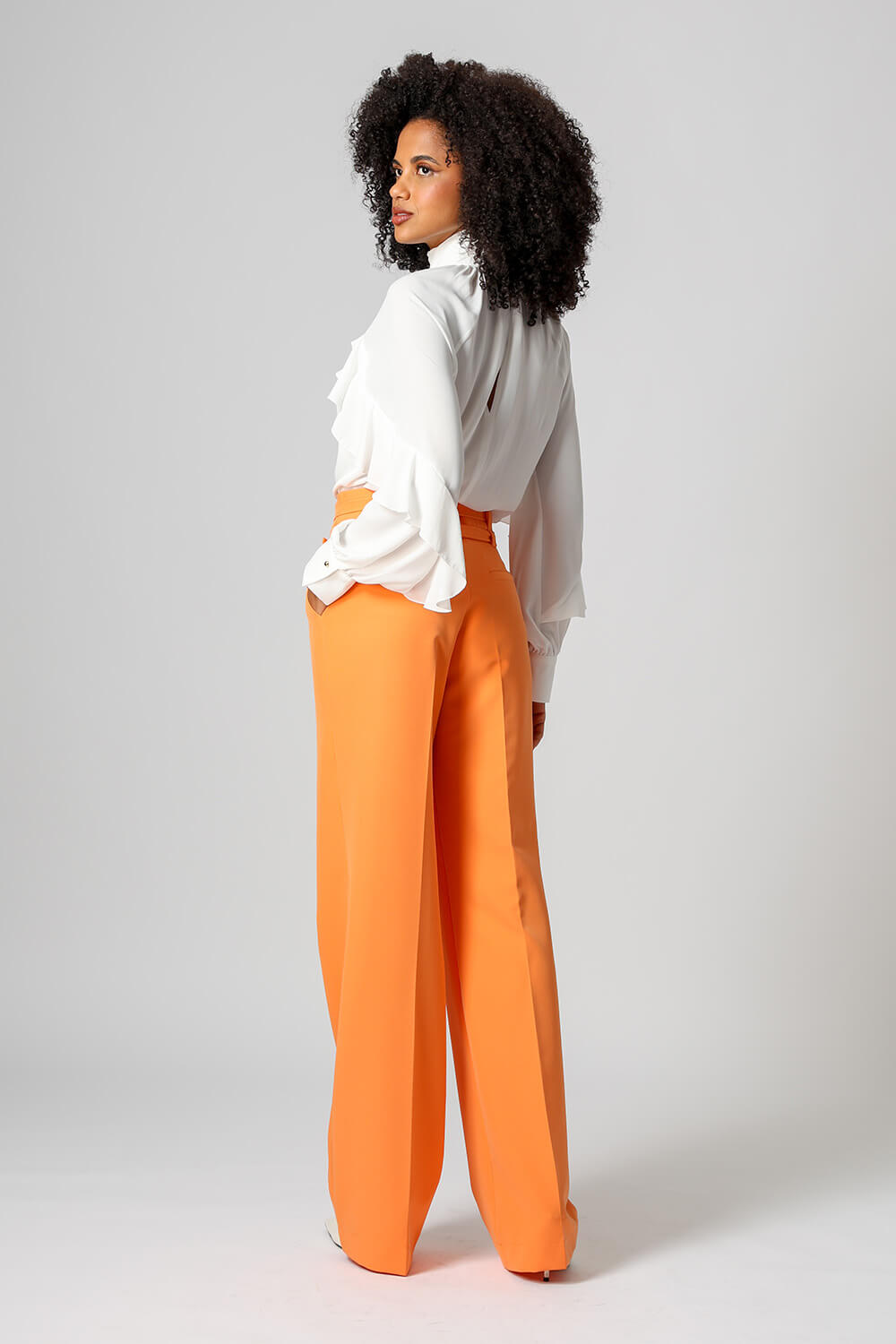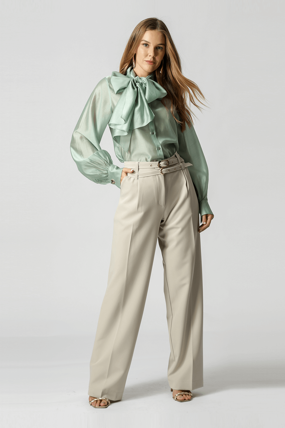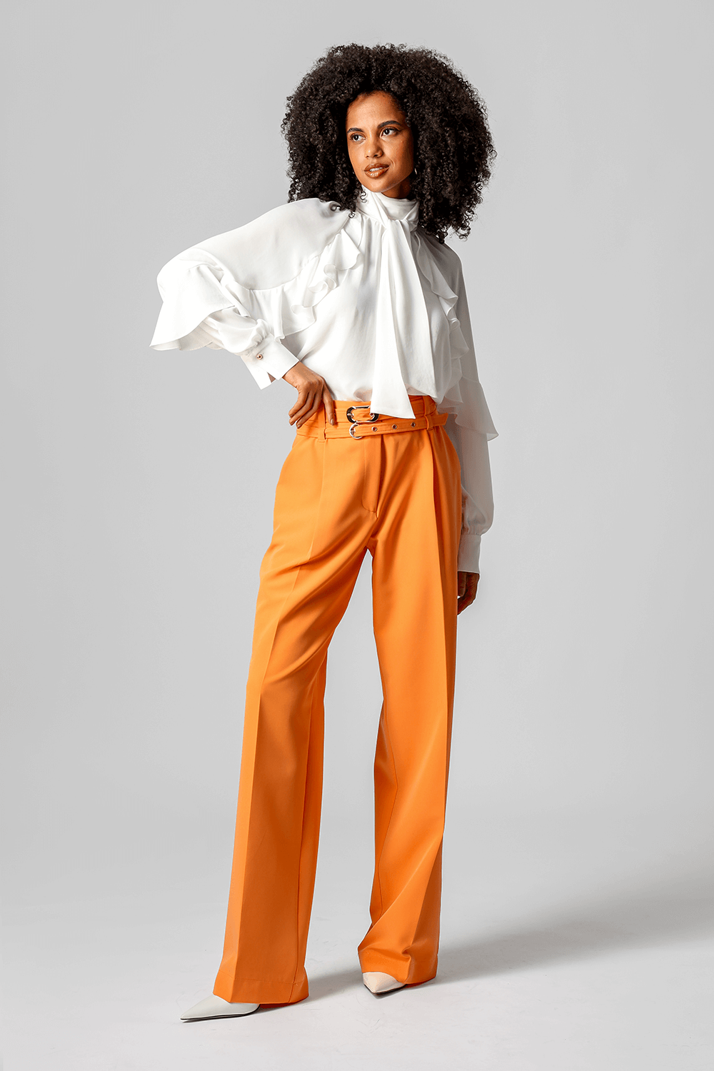 Calça de alfaiataria com pregas frontais e dois cintos removíveis com fivelas distintas. Versátil e elegante, perfeita para compor looks sofisticados com um toque de personalidade.