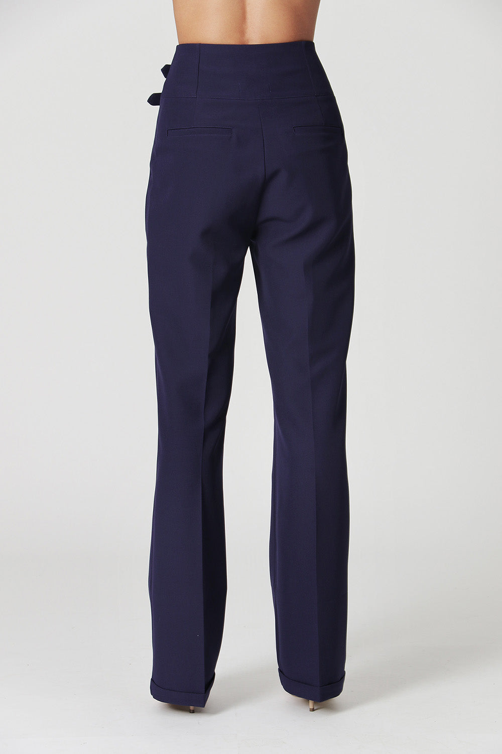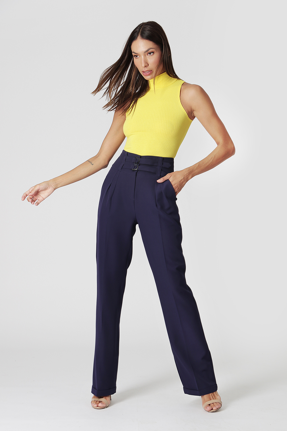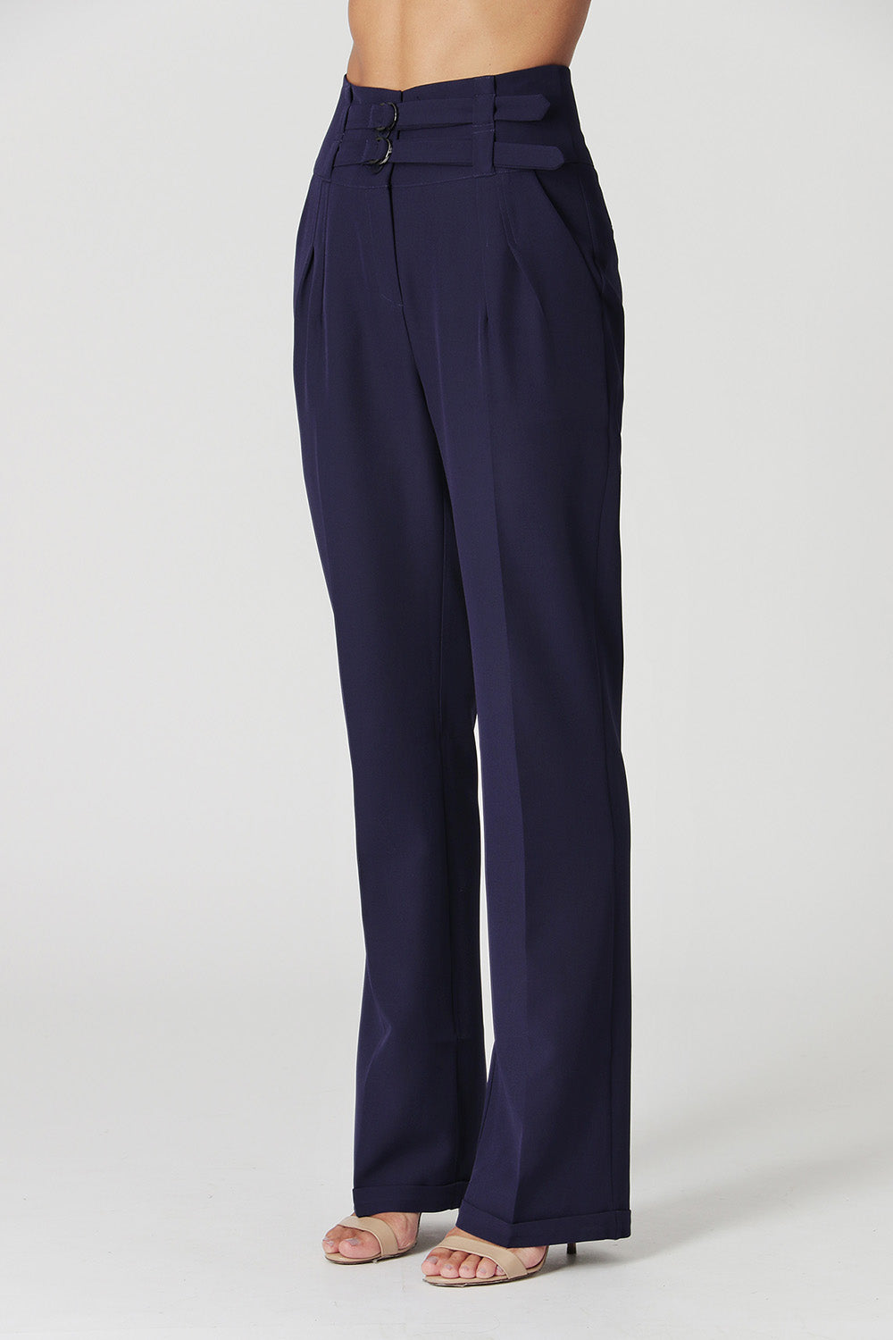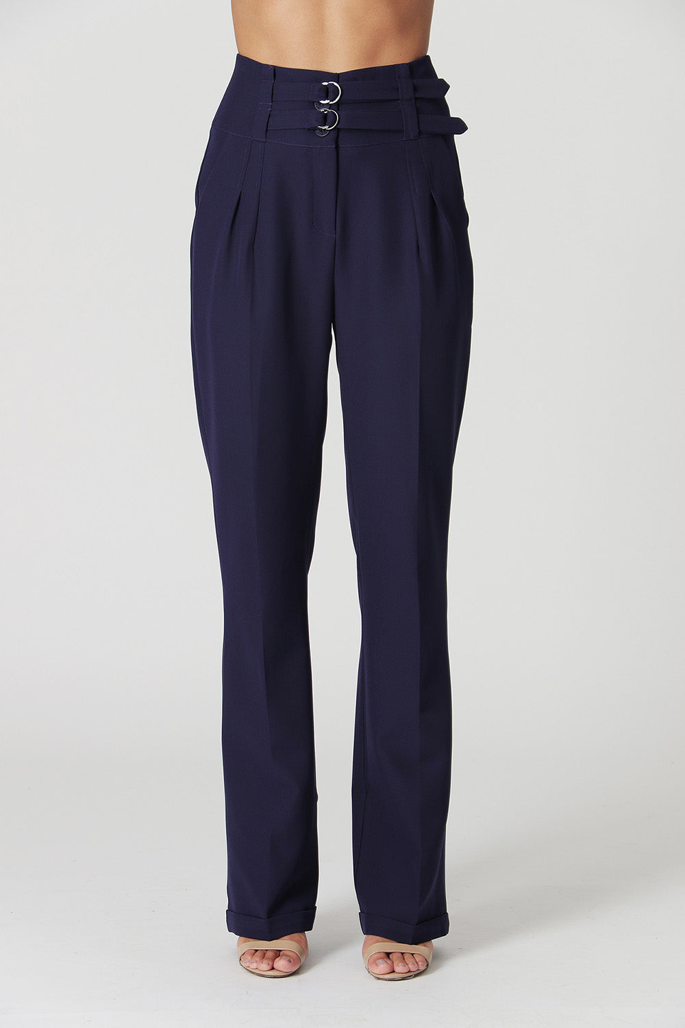 Pantalón de vestir de talle alto y corte recto, detalle de dos cinturones en cinturilla, pinzas, trabillas anchas y hebillas en color ónix. Los pantalones están arrugados y tienen el dobladillo enrollado. Una pieza clave para crear looks de trabajo elegantes y cómodos.