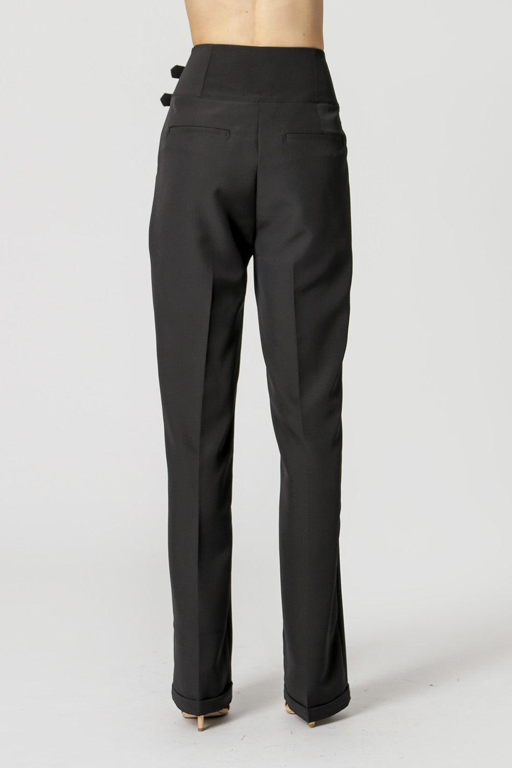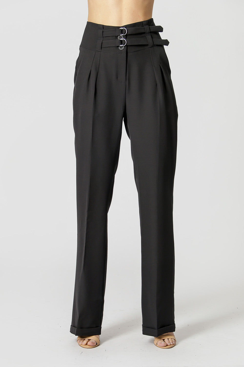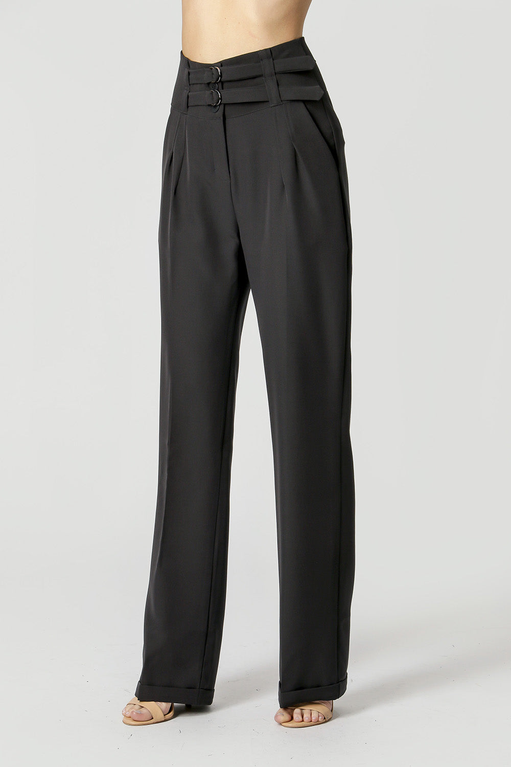 Pantalón de vestir de talle alto y corte recto, detalle de dos cinturones en cinturilla, pinzas, trabillas anchas y hebillas en color ónix. Los pantalones están arrugados y tienen el dobladillo enrollado. Una pieza clave para crear looks de trabajo elegantes y cómodos.