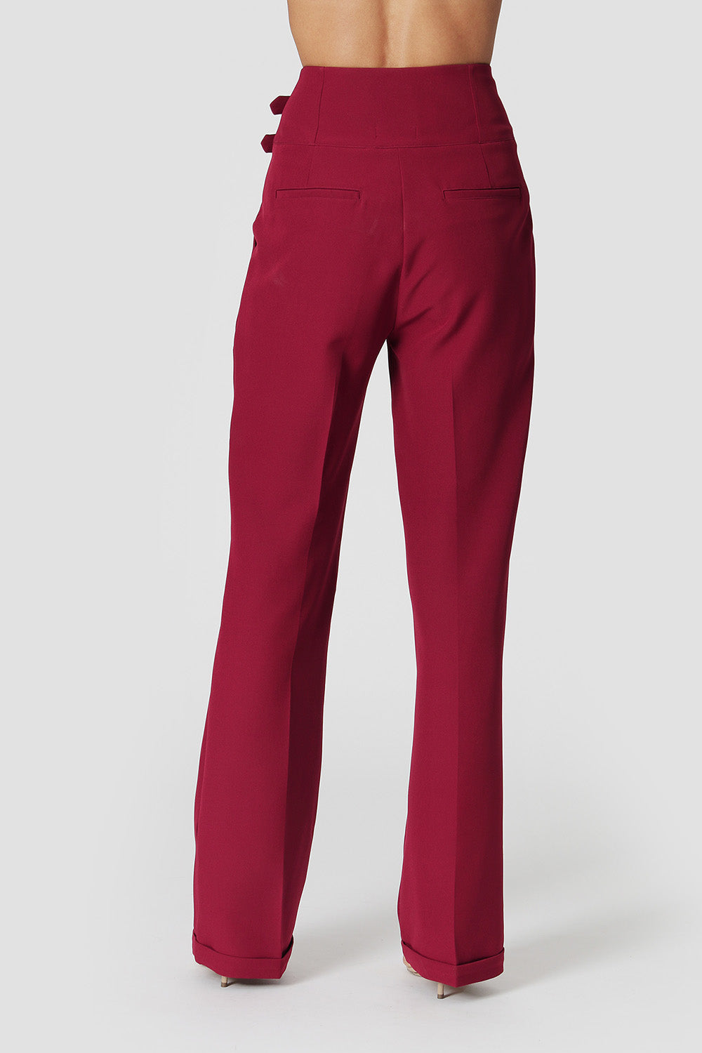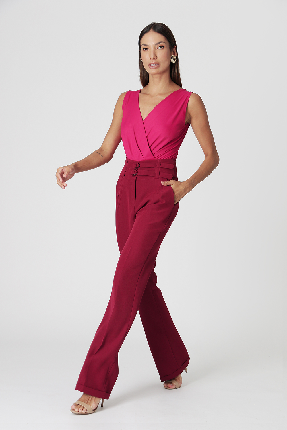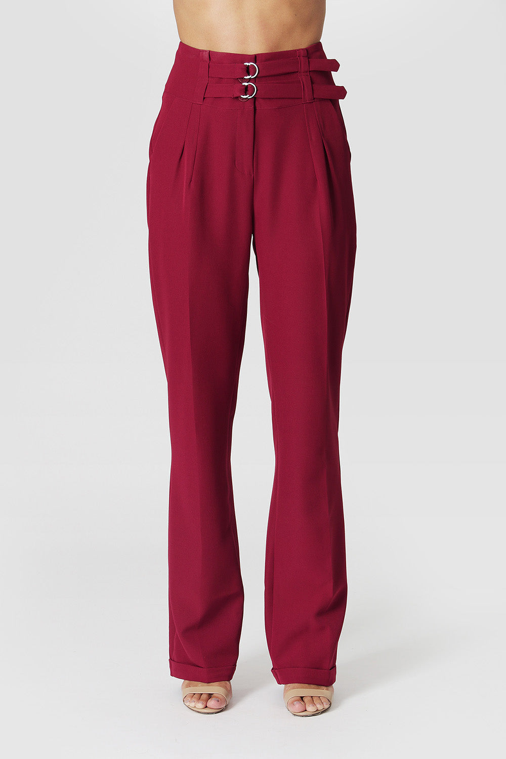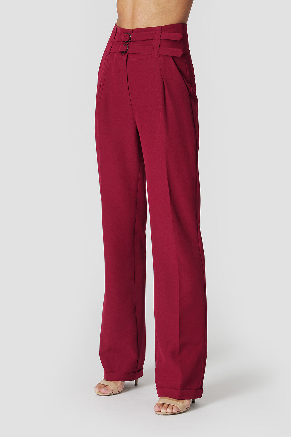 Pantalón de vestir de talle alto y corte recto, detalle de dos cinturones en cinturilla, pinzas, trabillas anchas y hebillas en color ónix. Los pantalones están arrugados y tienen el dobladillo doblado. Una pieza clave para crear looks de trabajo elegantes y cómodos.