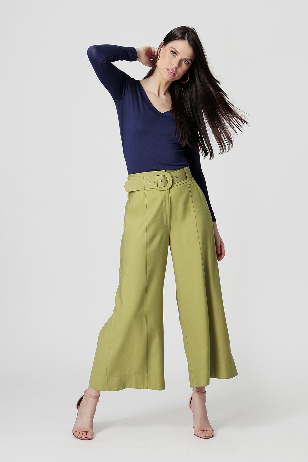 Pantalones con forma más ancha. Tiene detalle de canalé y cinturón forrado. Una pieza elegante para que apuestes sin miedo.
